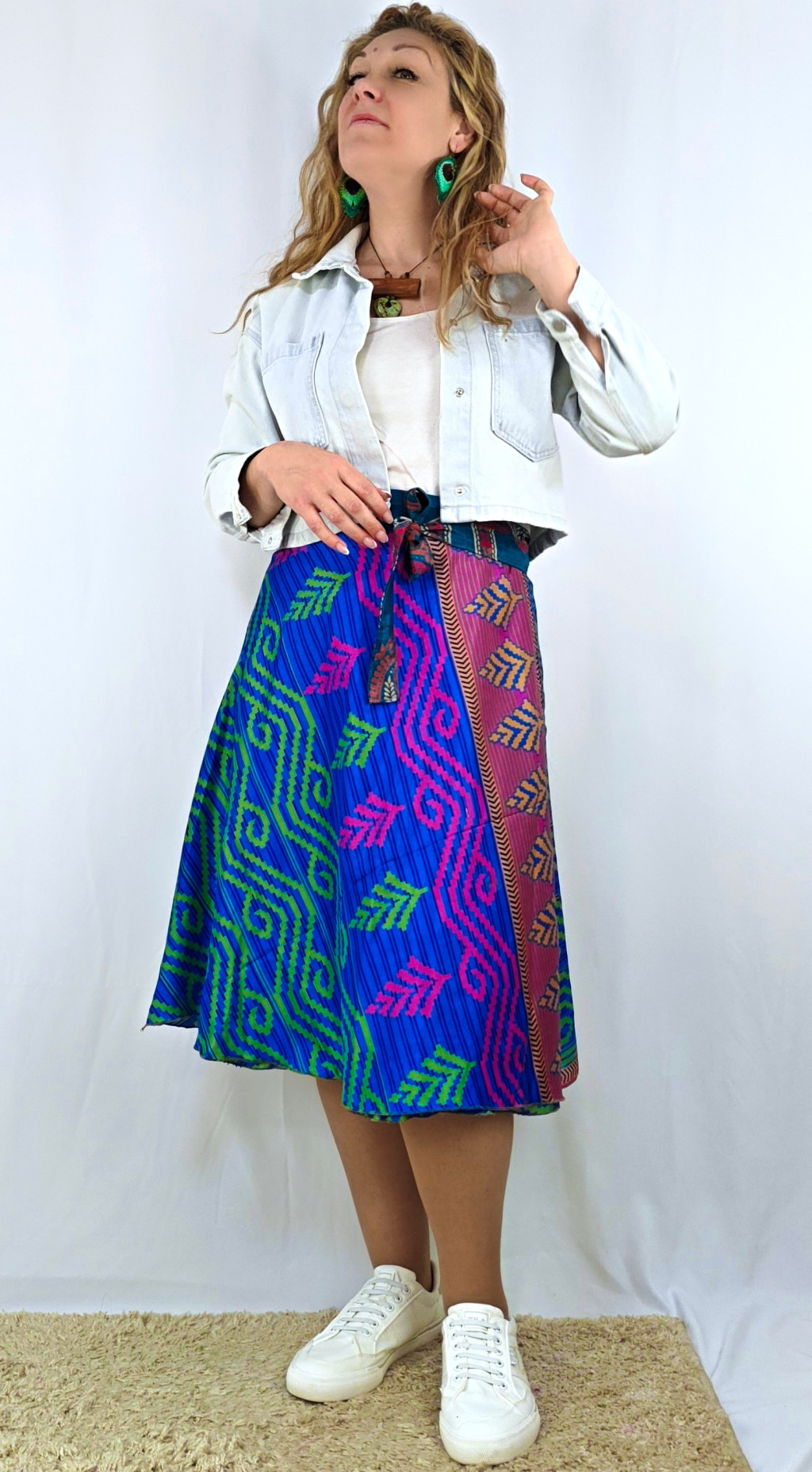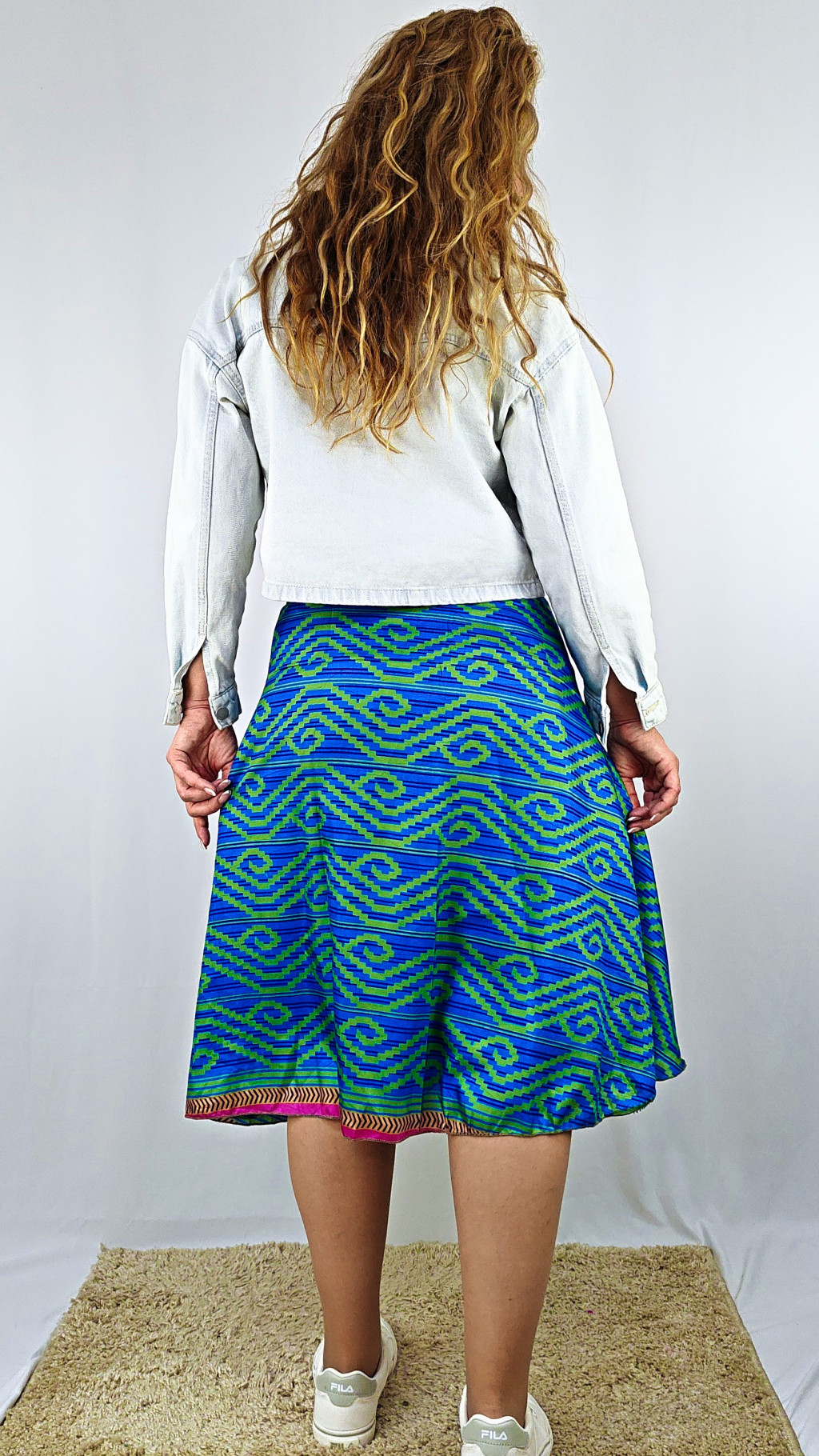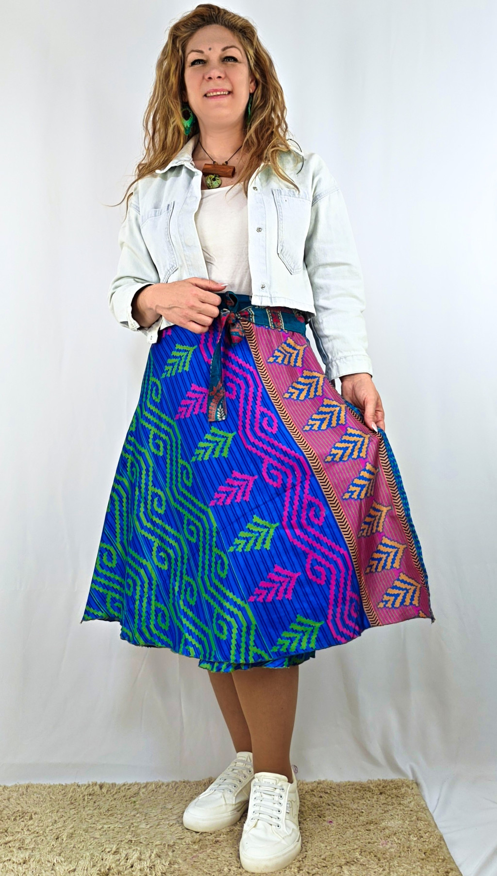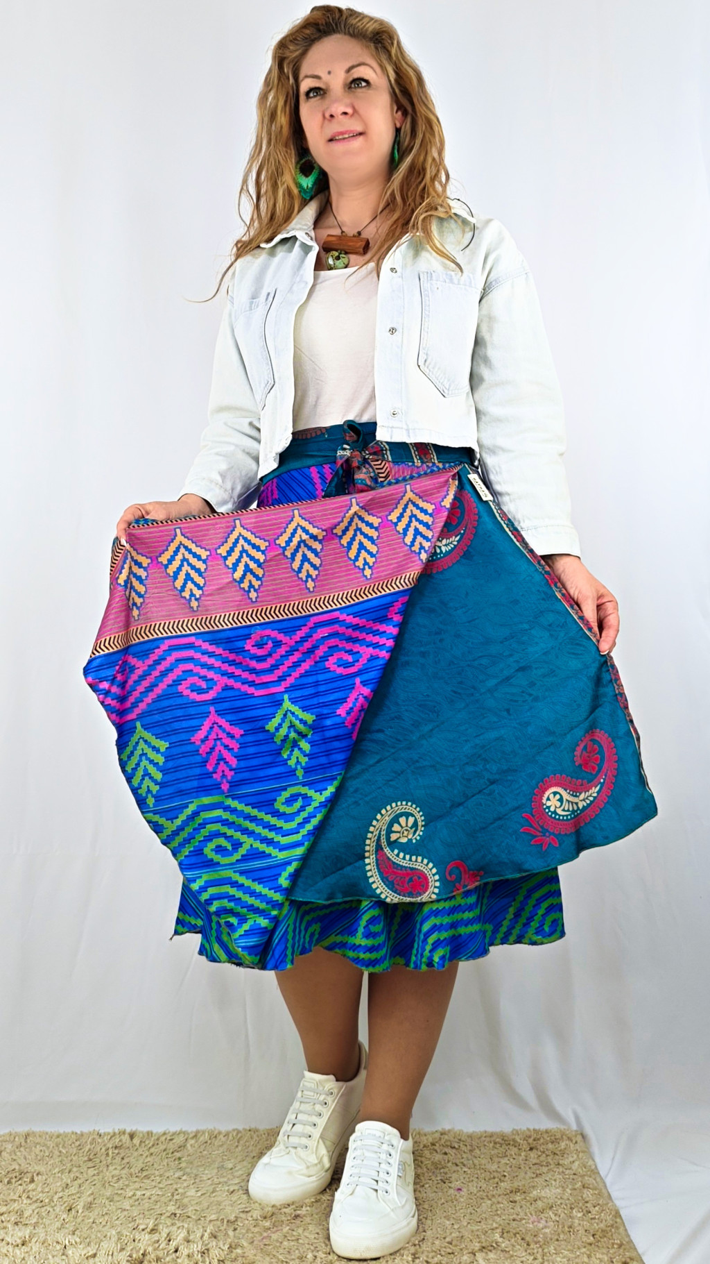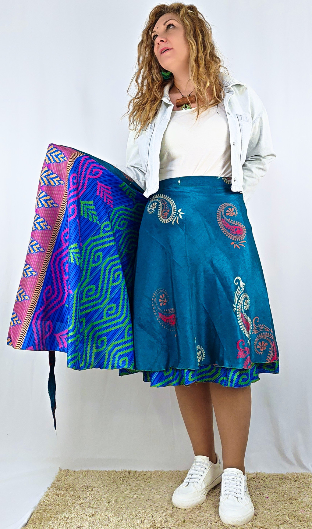 Lapszoknyáink újrahasznosított szárikból készülnek Indiában, egy hosszabb és egy rövidebb anyag derékban összevarrva! Két oldalú, kifordítható, mindkét oldala hordható, sokféleképpen köthető, variálható. Szoknyáinkból nincs két egyforma, mindegyikből csak EGY darab van, ha megtetszik, csapj le rá!