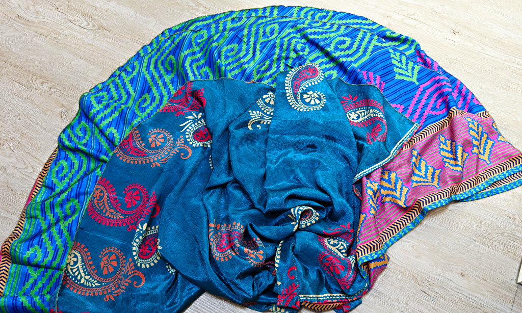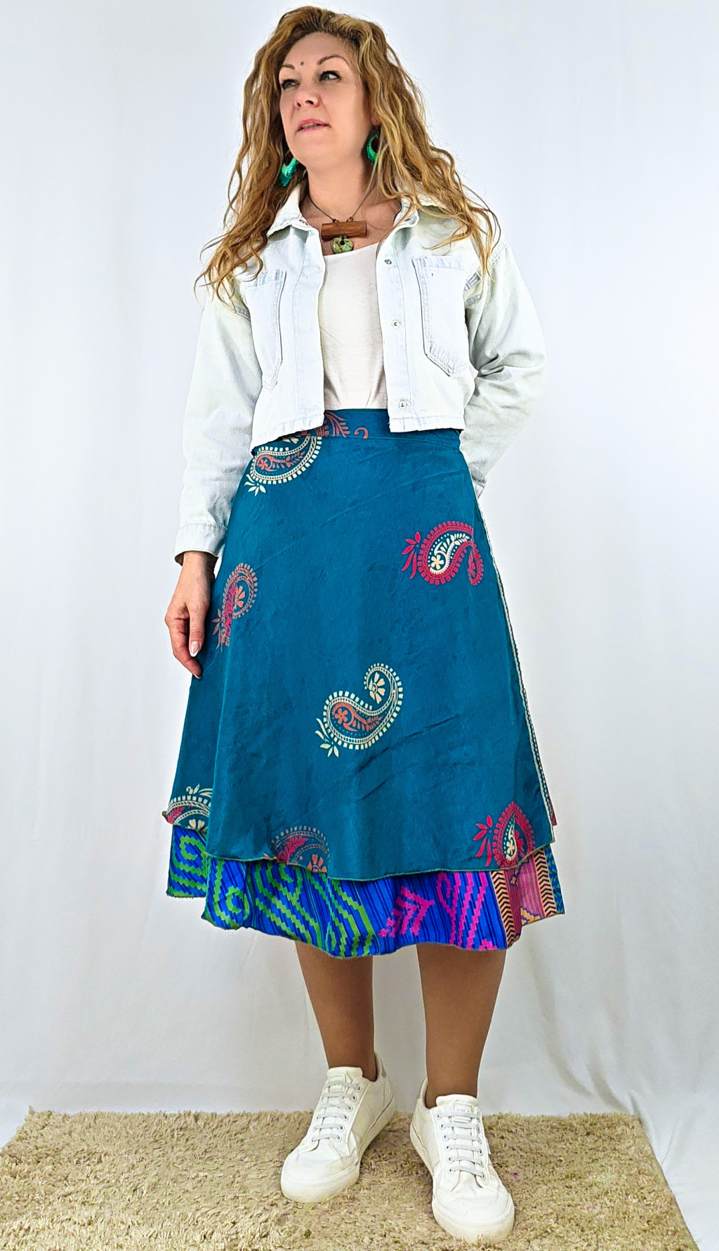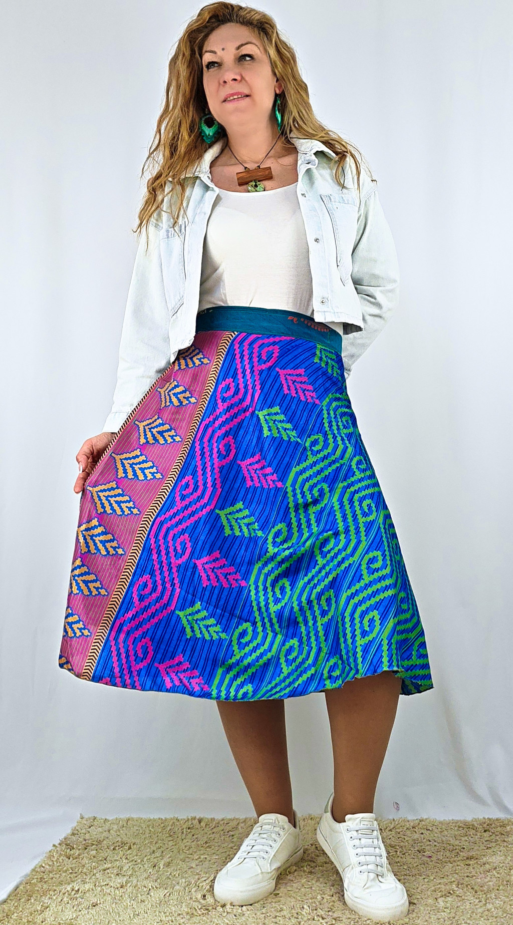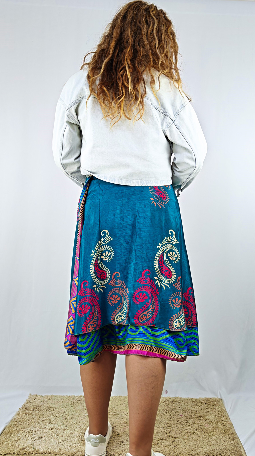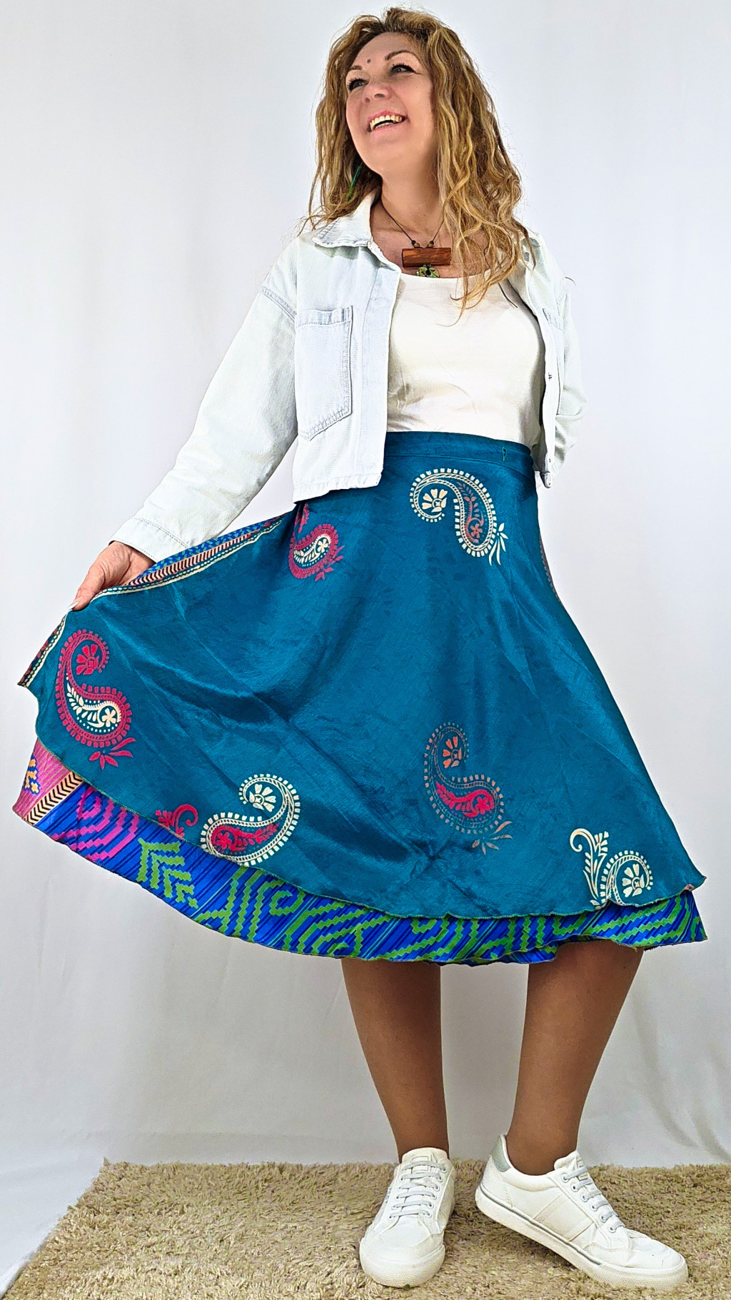 Lapszoknyáink újrahasznosított szárikból készülnek Indiában, egy hosszabb és egy rövidebb anyag derékban összevarrva! Két oldalú, kifordítható, mindkét oldala hordható, sokféleképpen köthető, variálható. Szoknyáinkból nincs két egyforma, mindegyikből csak EGY darab van, ha megtetszik, csapj le rá!