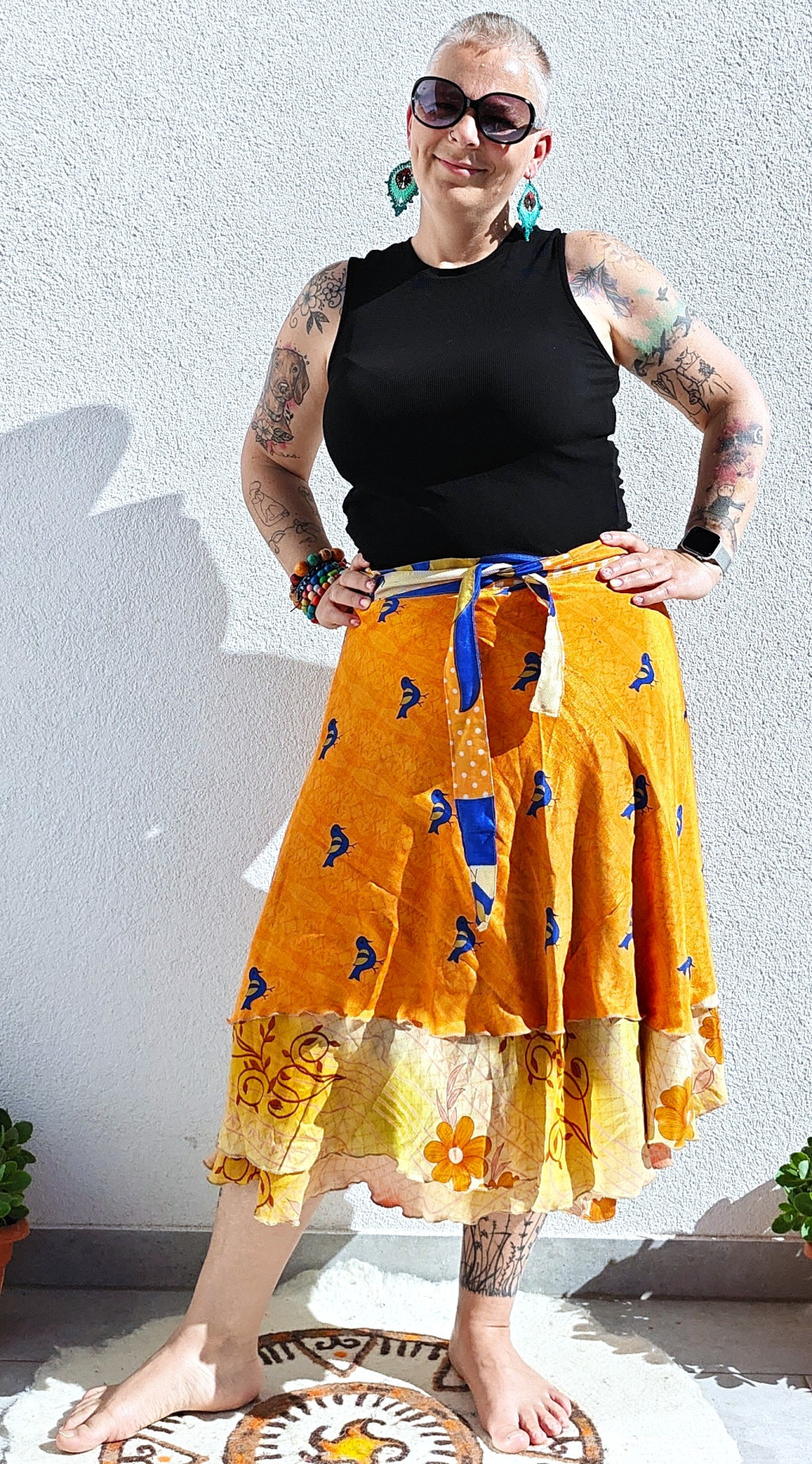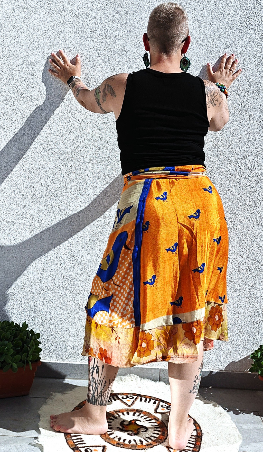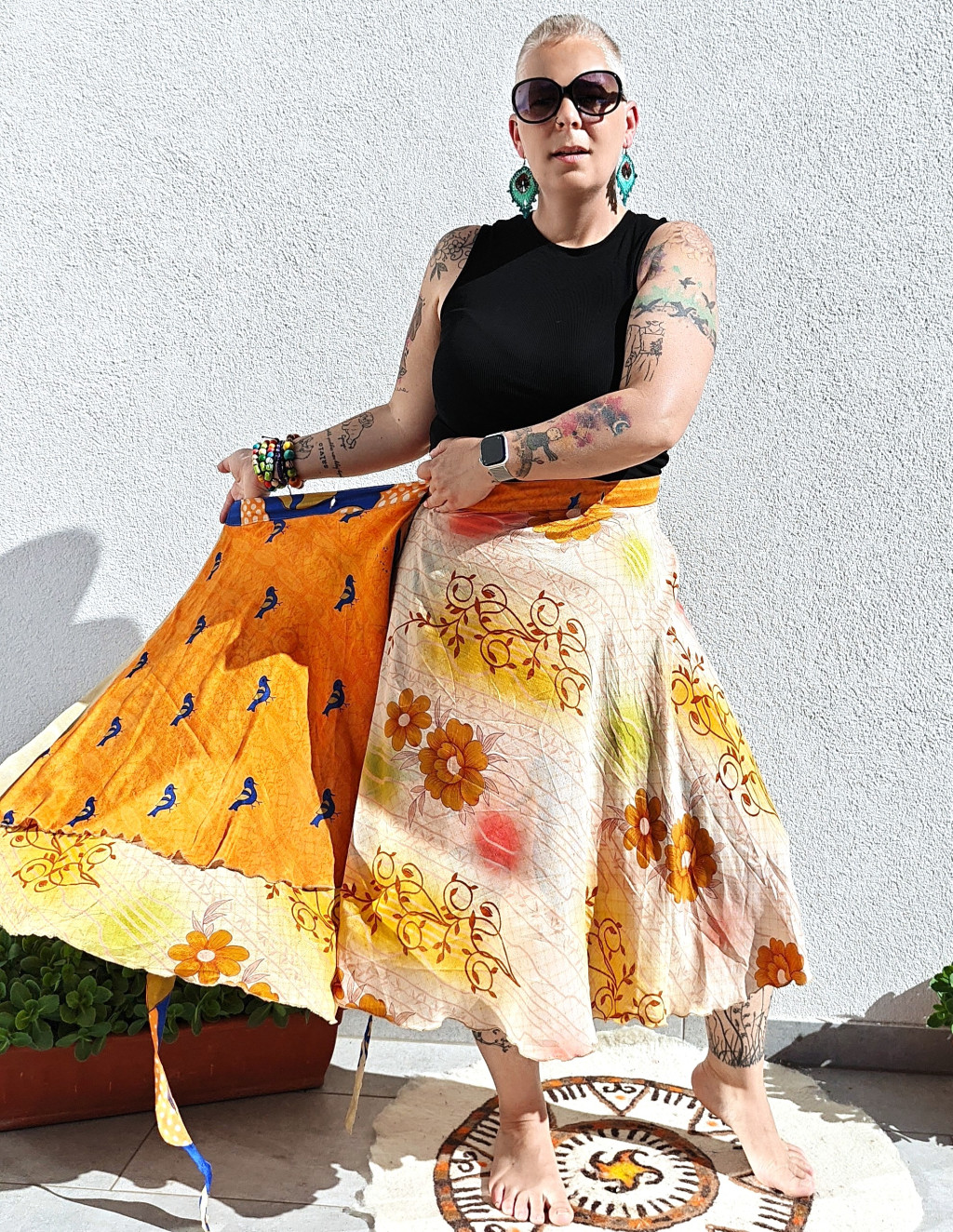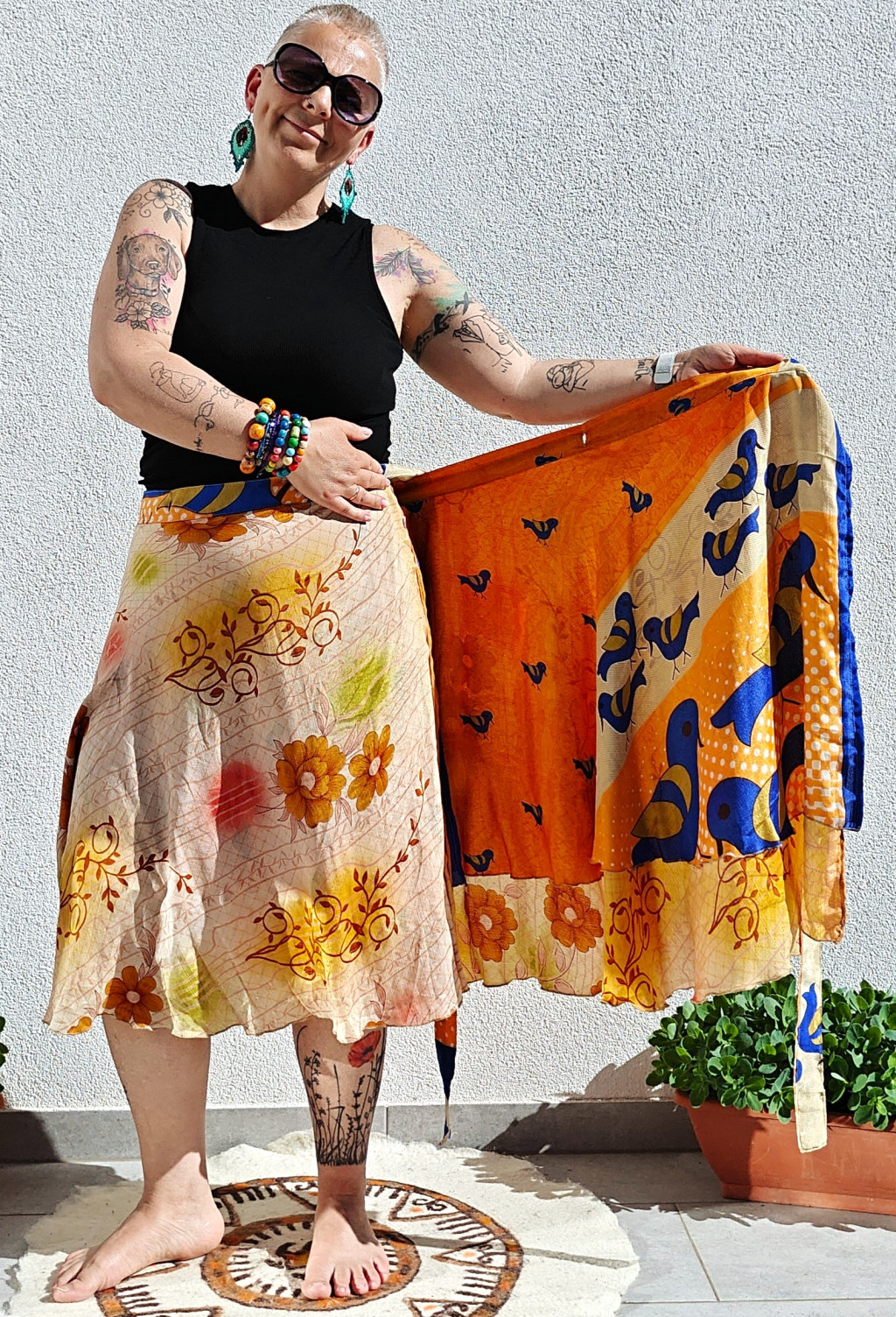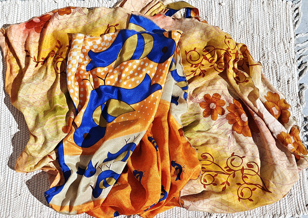 Lapszoknyáink újrahasznosított szárikból készülnek Indiában, egy hosszabb és egy rövidebb anyag derékban összevarrva! Kifordítható, mindkét oldala hordható, sokféleképpen köthető, variálható. Szoknyáinkból nincs két egyforma, mindegyikből csak EGY darab van, ha megtetszik, csapj le rá!