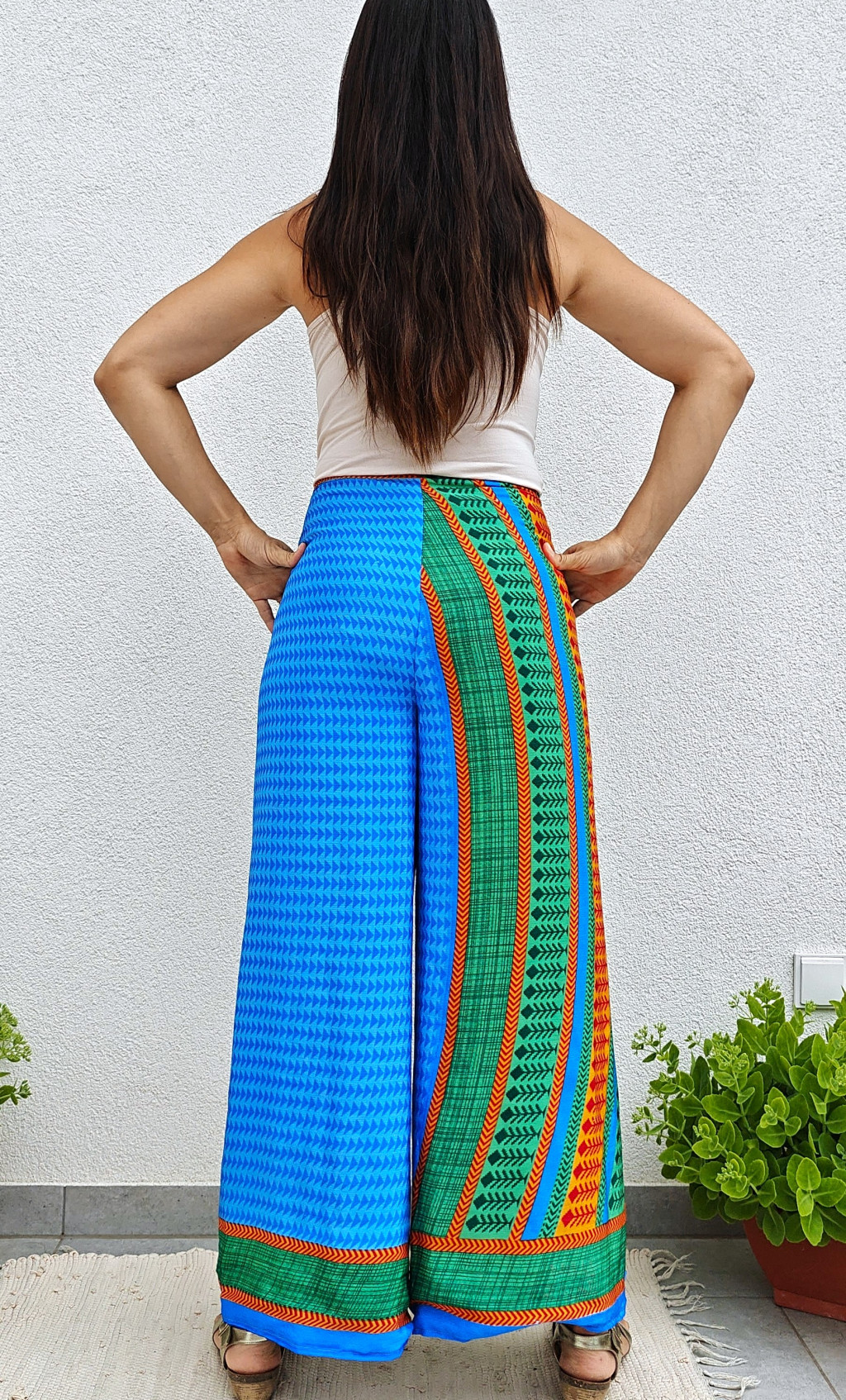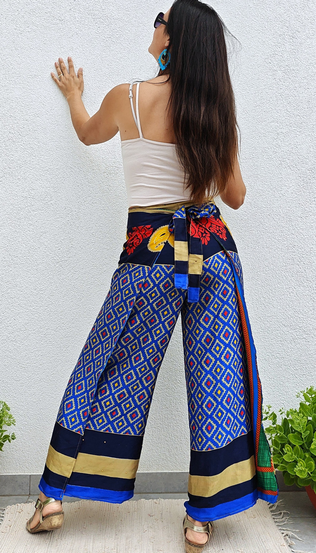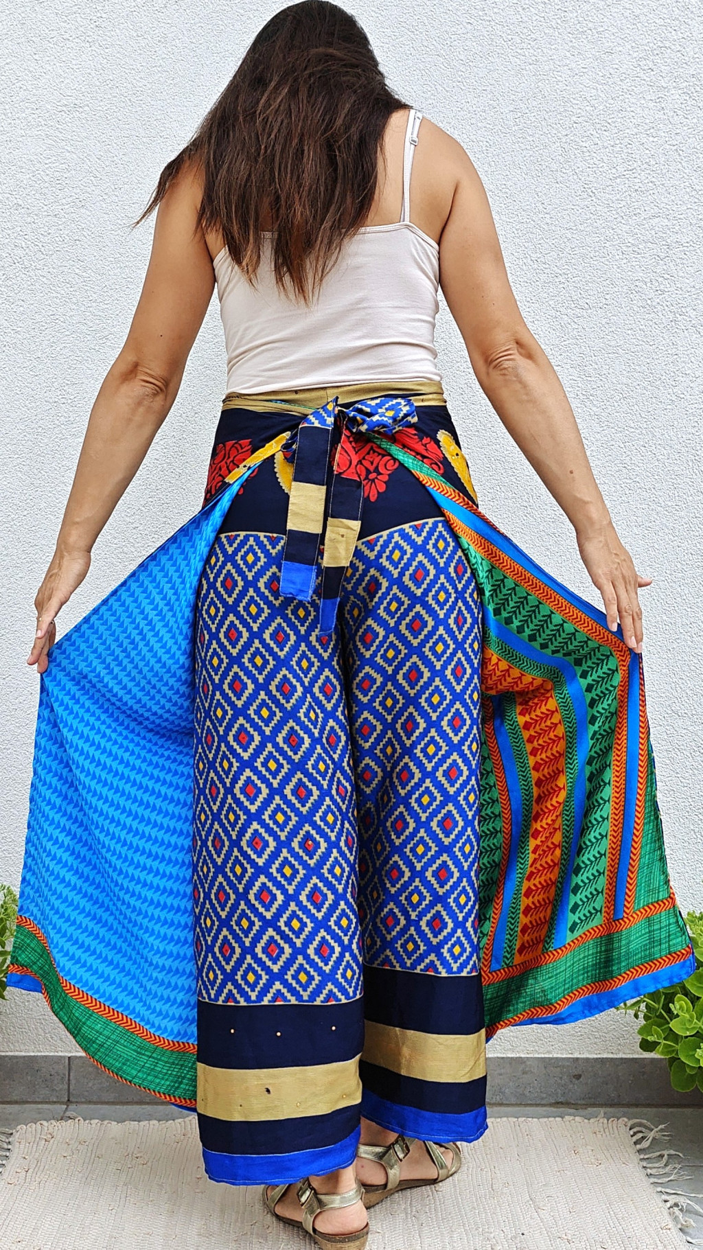 Lapnadrágjaink újrahasznosított szárikból készülnek Indiában. Két különböző csodás anyagot varrnak össze, így a külső és belső fele is hordható!