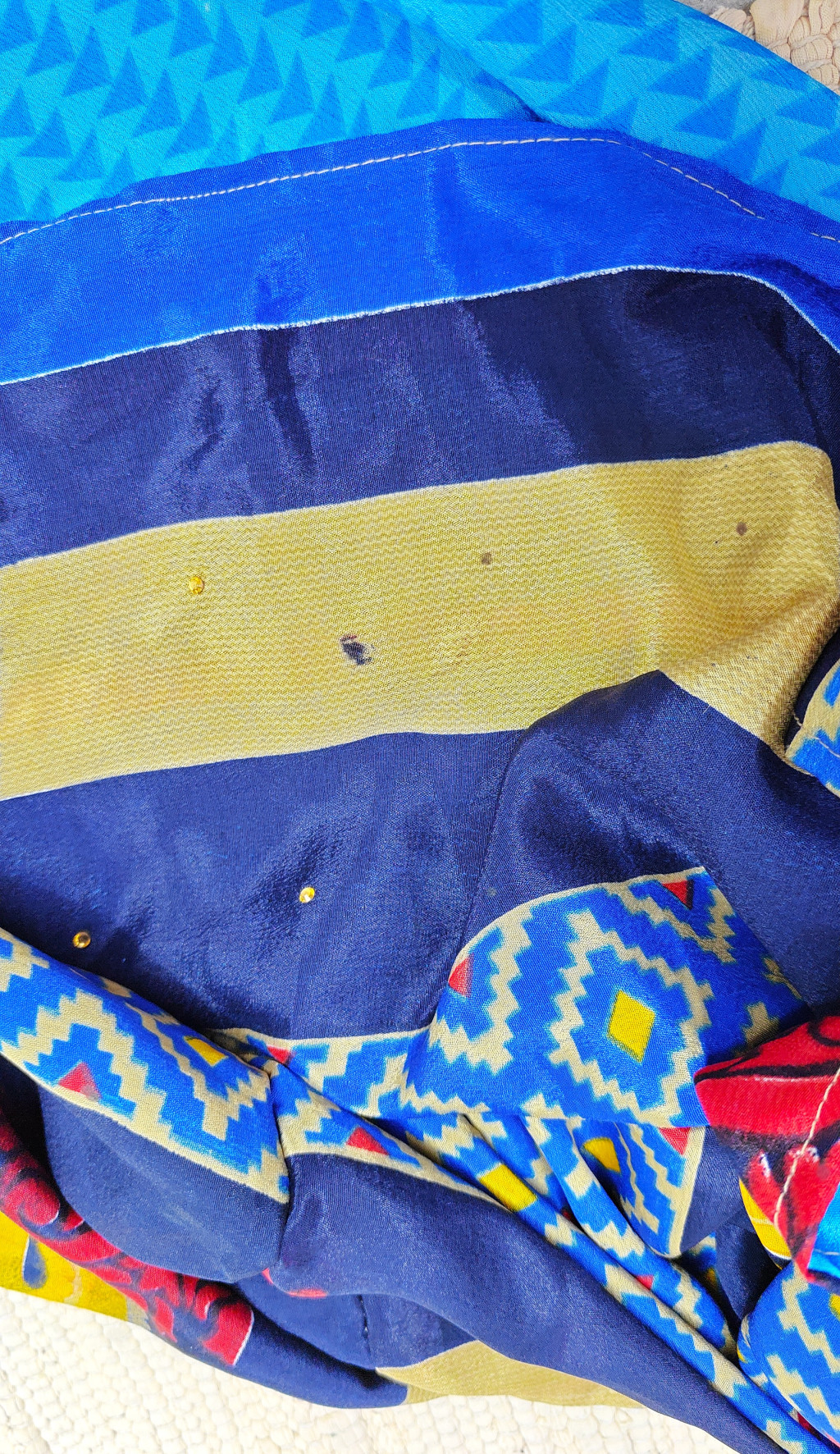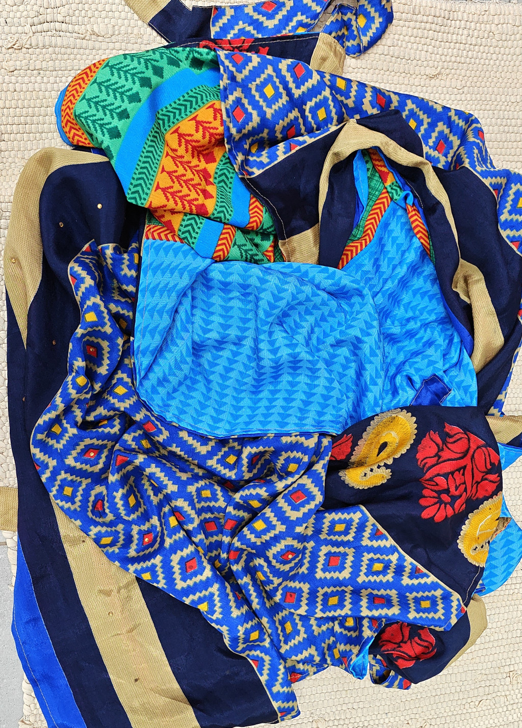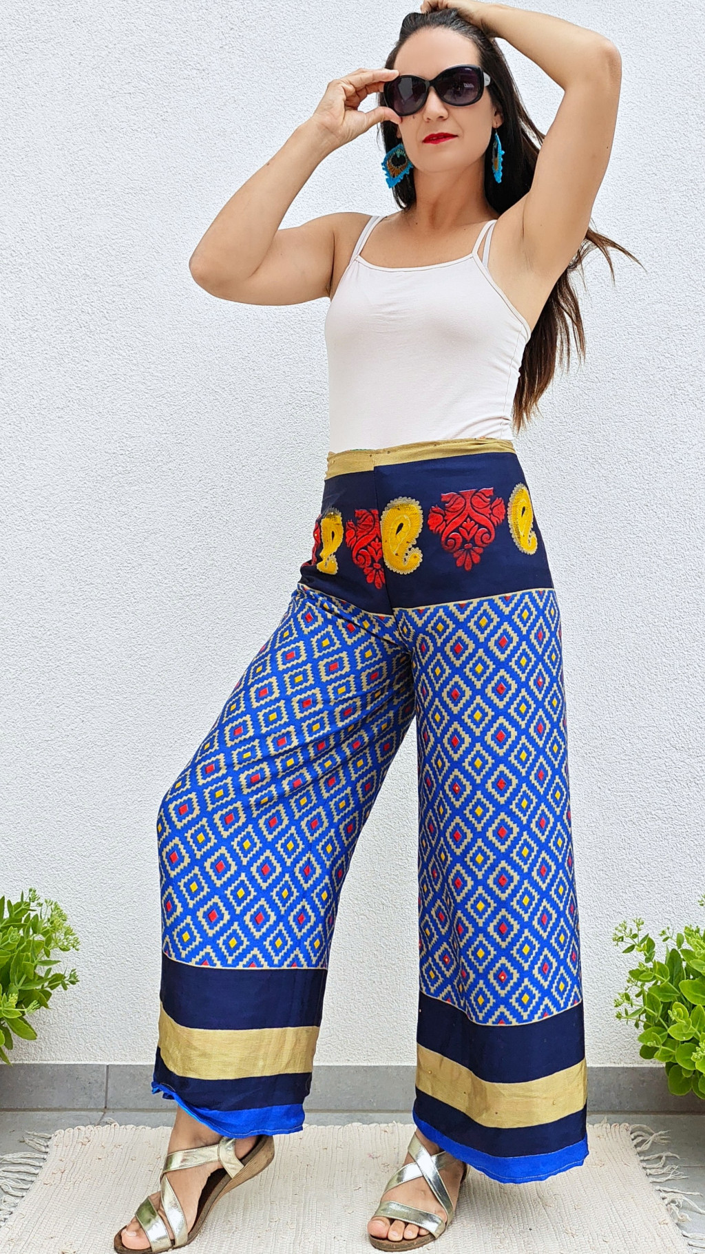 Lapnadrágjaink újrahasznosított szárikból készülnek Indiában. Két különböző csodás anyagot varrnak össze, így a külső és belső fele is hordható!