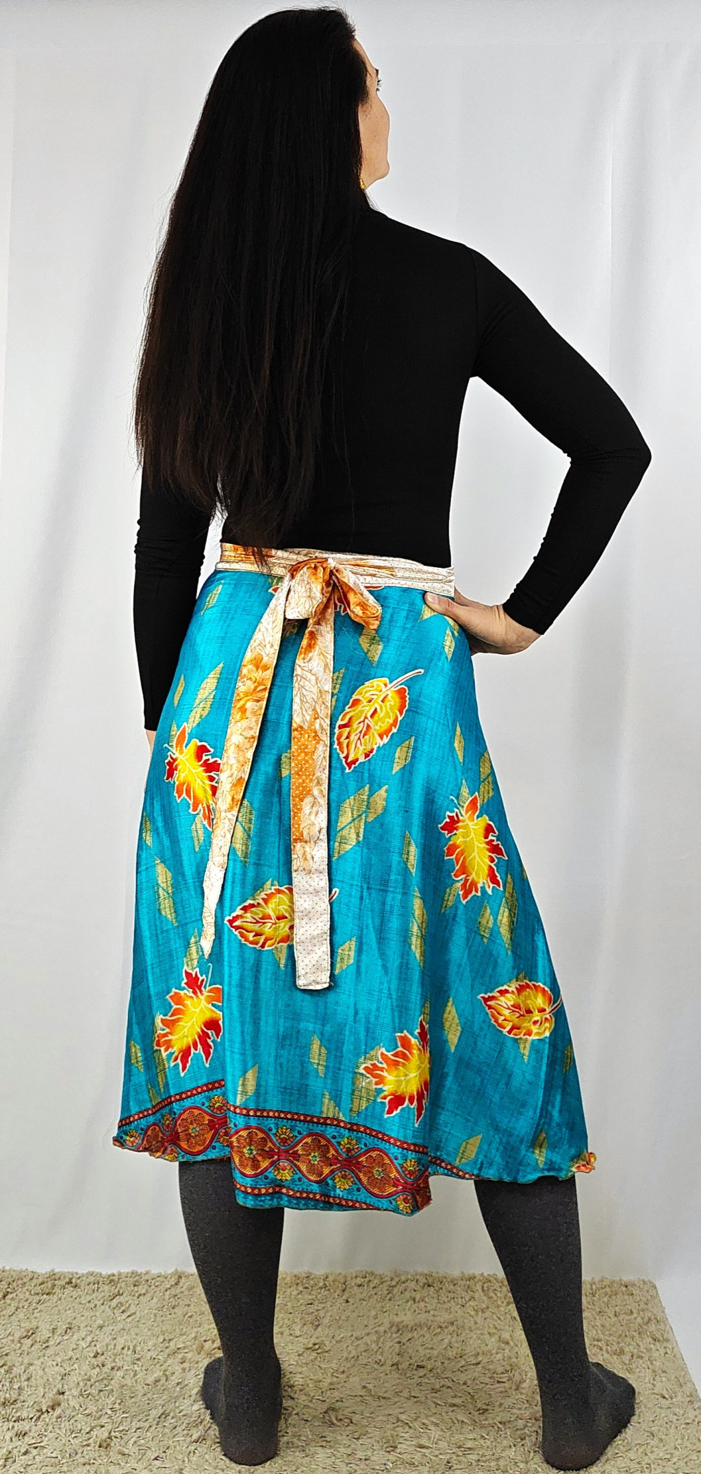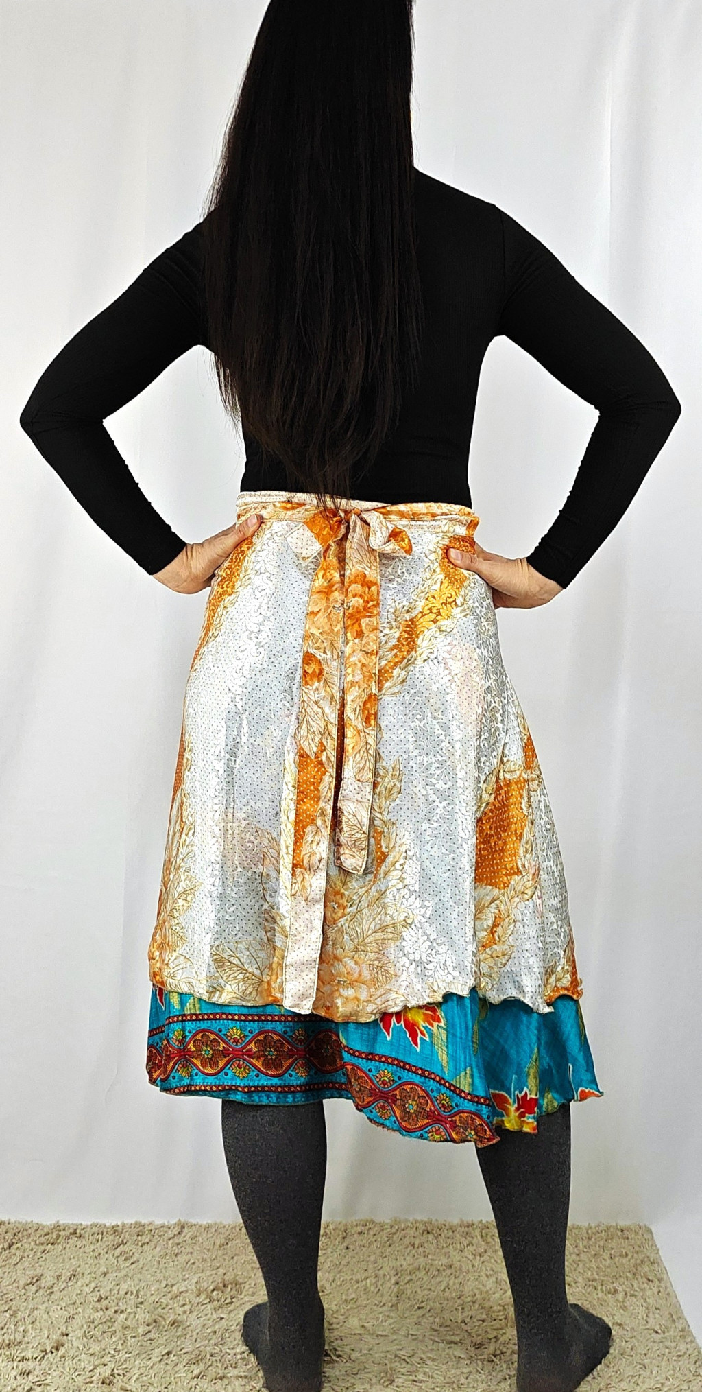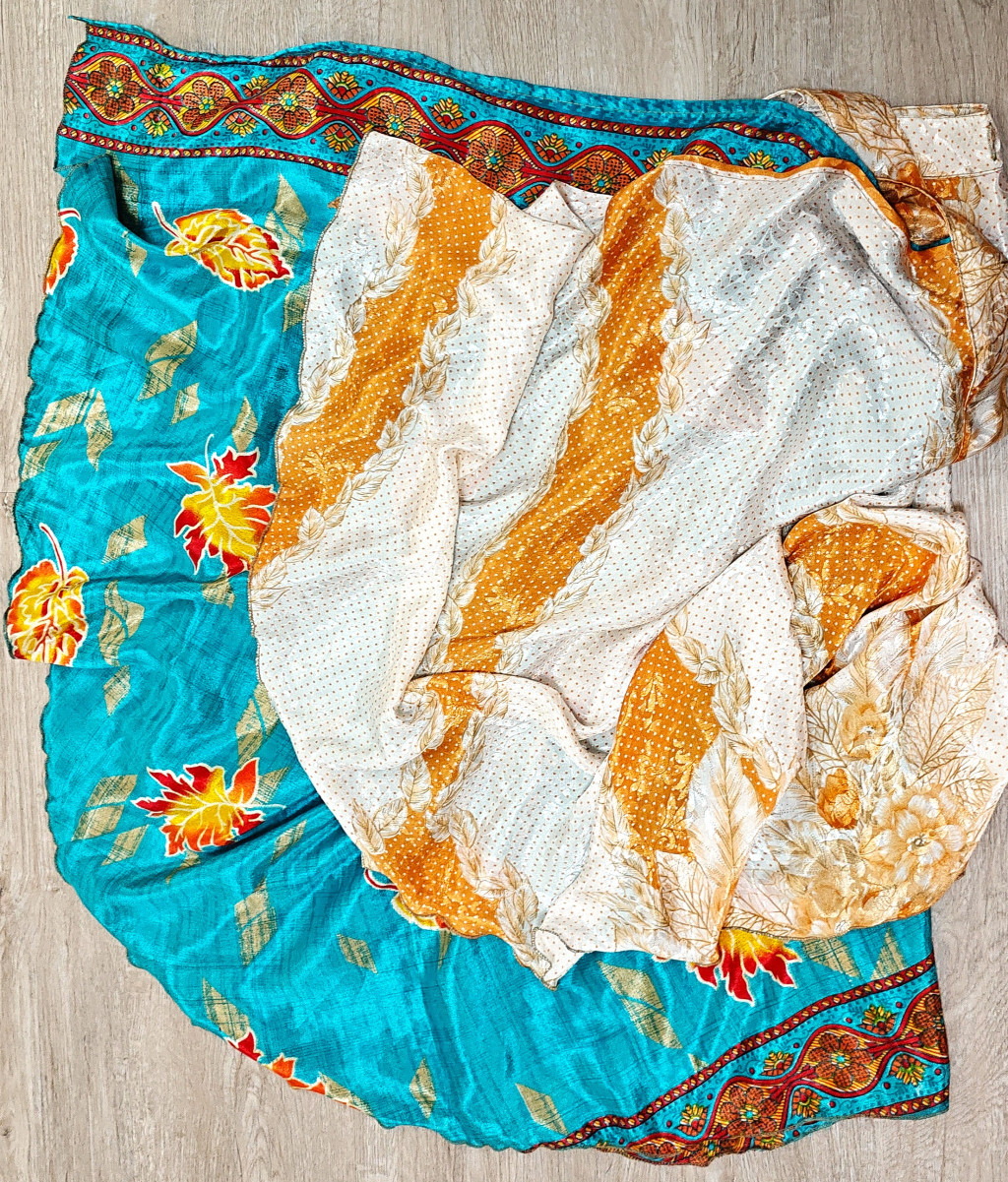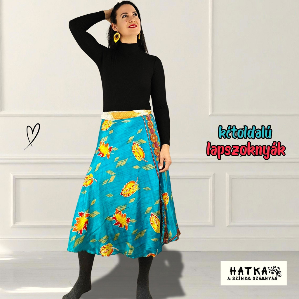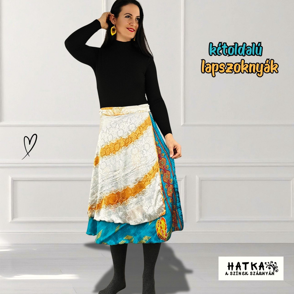 Lapszoknyáink újrahasznosított szárikból készülnek Indiában, egy hosszabb és egy rövidebb anyag derékban összevarrva! Két oldalú, kifordítható, mindkét oldala hordható, sokféleképpen köthető, variálható. Szoknyáinkból nincs két egyforma, mindegyikből csak EGY darab van, ha megtetszik, csapj le rá!