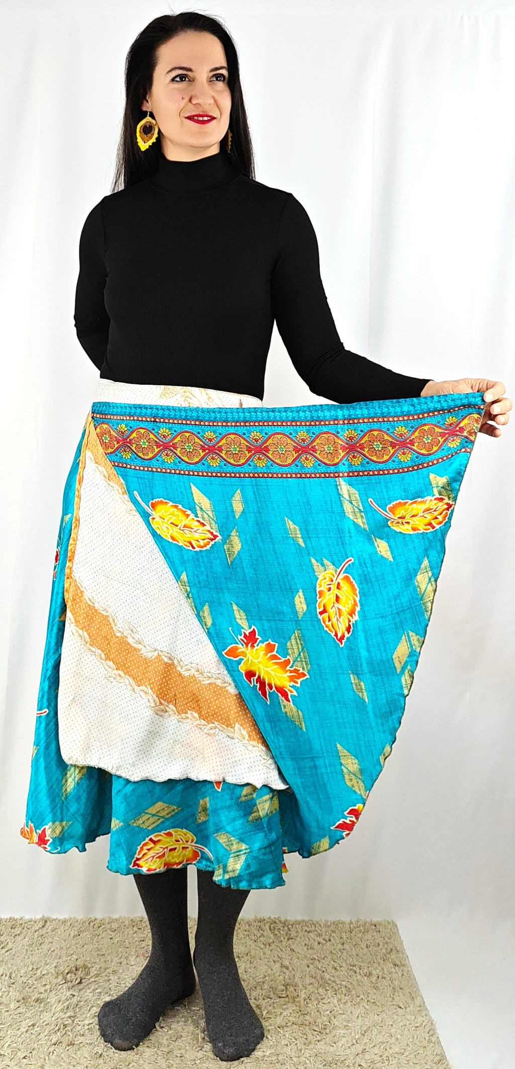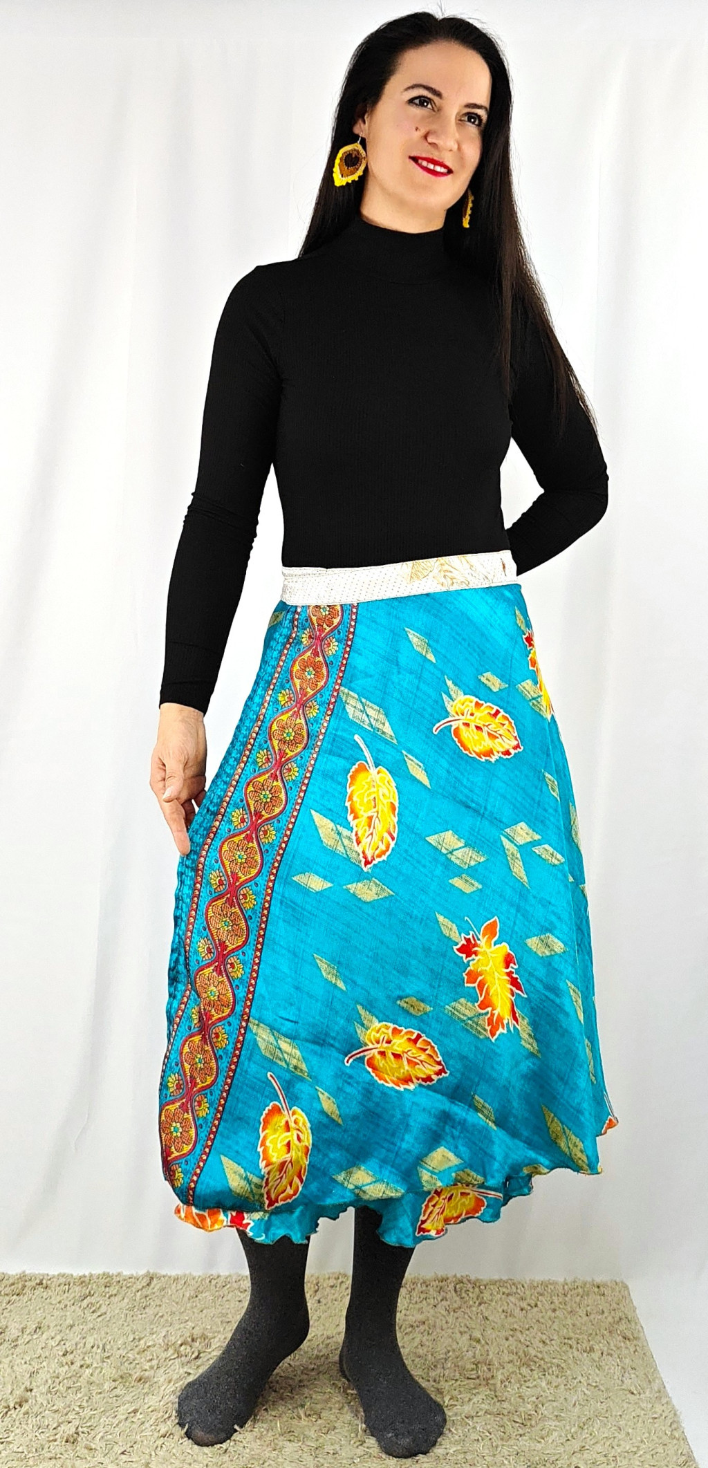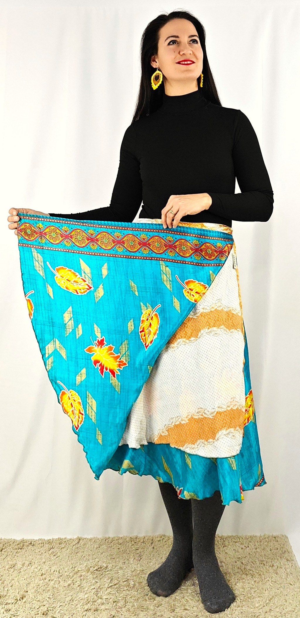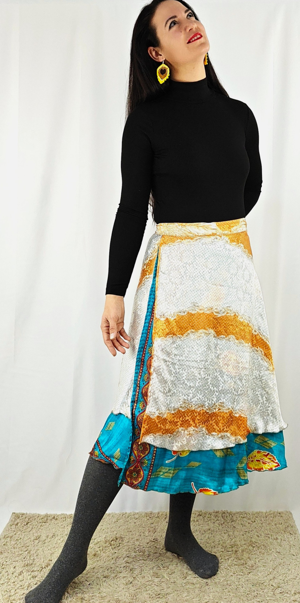 Lapszoknyáink újrahasznosított szárikból készülnek Indiában, egy hosszabb és egy rövidebb anyag derékban összevarrva! Két oldalú, kifordítható, mindkét oldala hordható, sokféleképpen köthető, variálható. Szoknyáinkból nincs két egyforma, mindegyikből csak EGY darab van, ha megtetszik, csapj le rá!