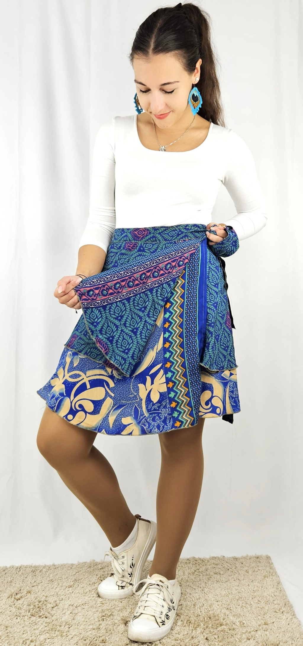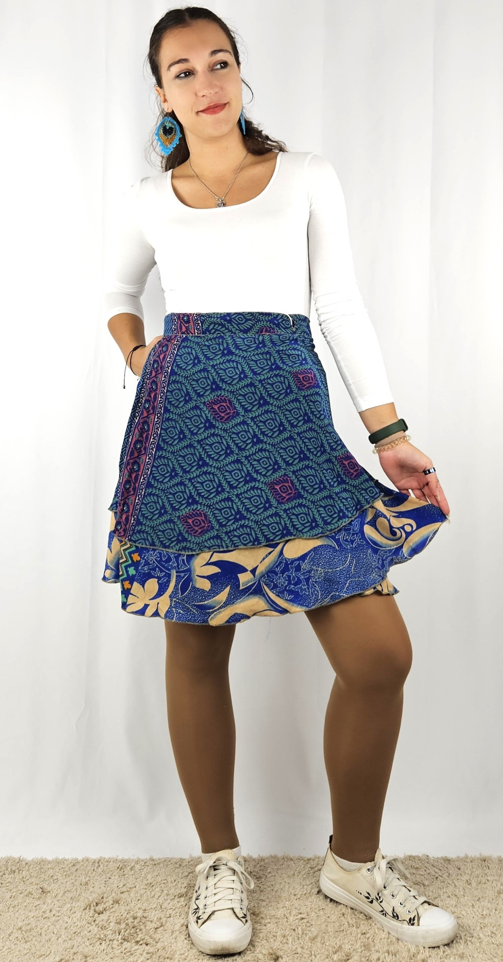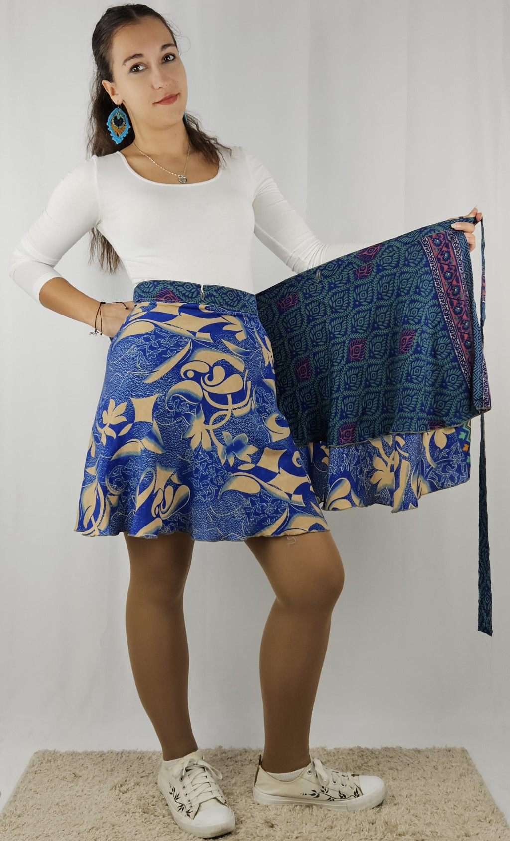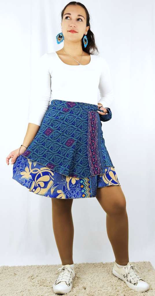 Lapszoknyáink újrahasznosított szárikból készülnek Indiában, egy hosszabb és egy rövidebb anyag derékban összevarrva! Kifordítható, mindkét oldala hordható, sokféleképpen köthető, variálható. Szoknyáinkból nincs két egyforma, mindegyikből csak EGY darab van, ha megtetszik, csapj le rá!