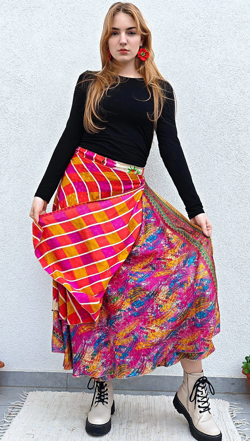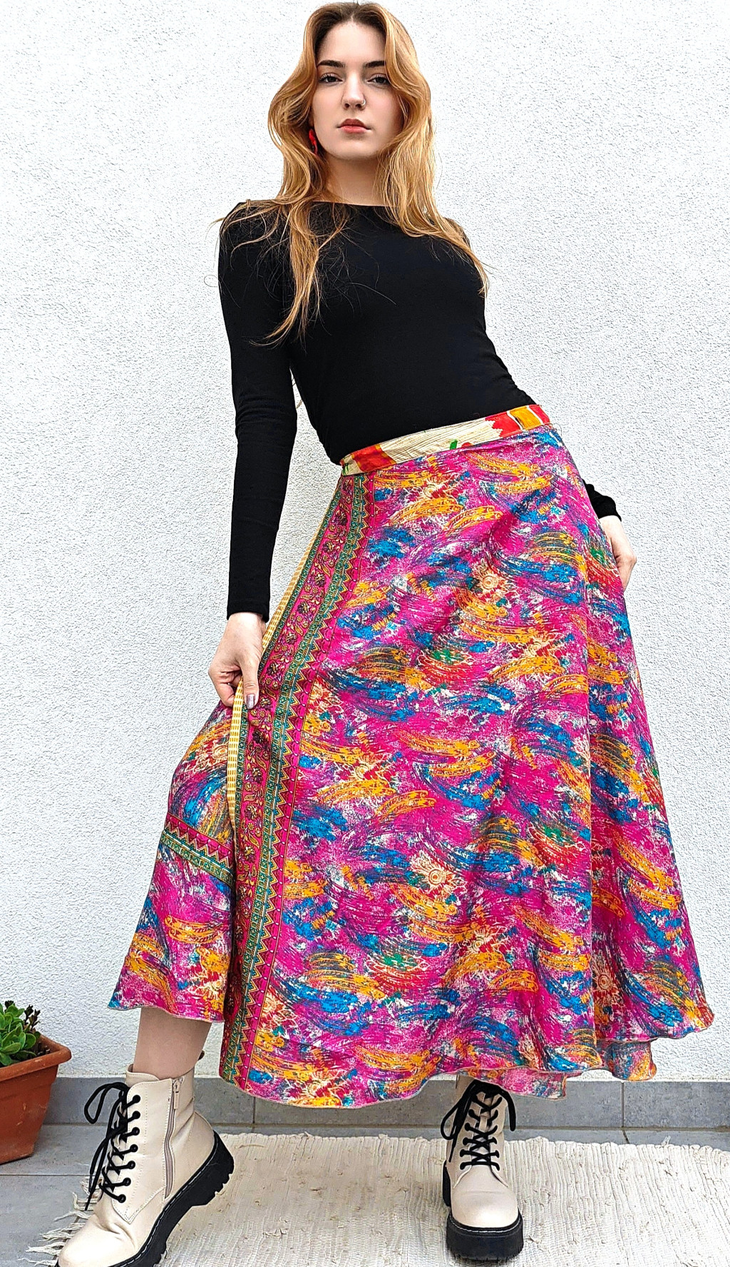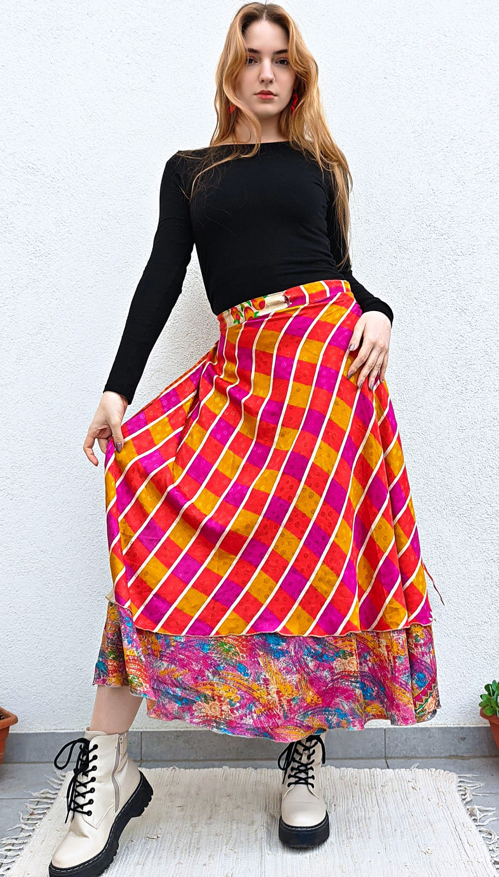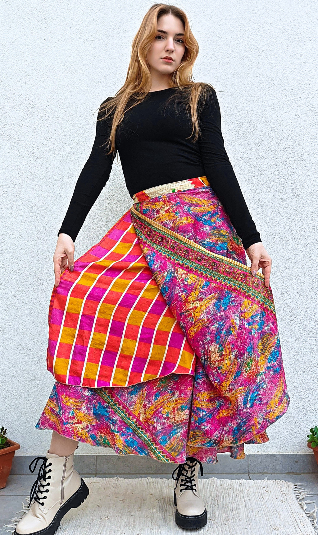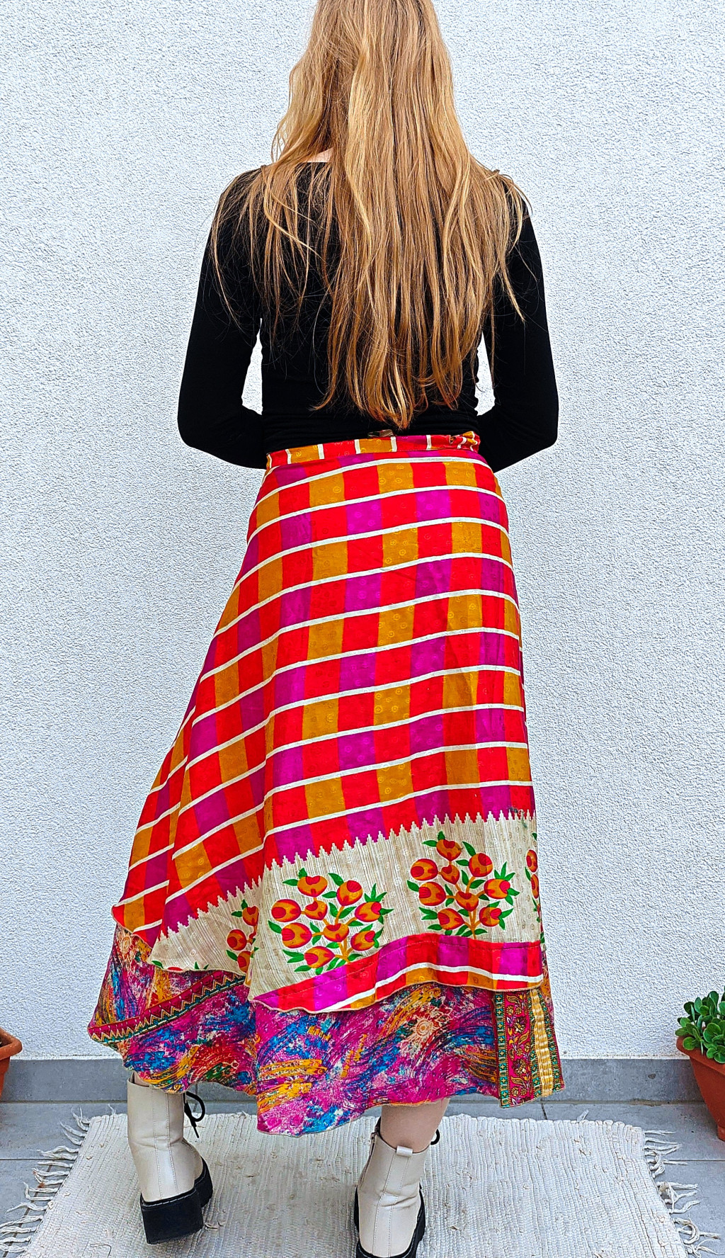 Lapszoknyáink újrahasznosított szárikból készülnek Indiában, egy hosszabb és egy rövidebb anyag derékban összevarrva! Két oldalú, kifordítható, mindkét oldala hordható, sokféleképpen köthető, variálható. Szoknyáinkból nincs két egyforma, mindegyikből csak EGY darab van, ha megtetszik, csapj le rá!