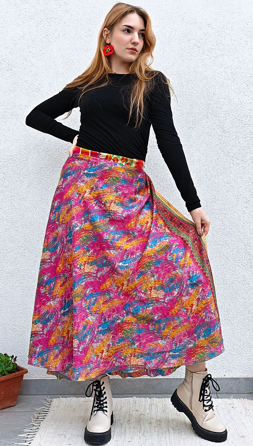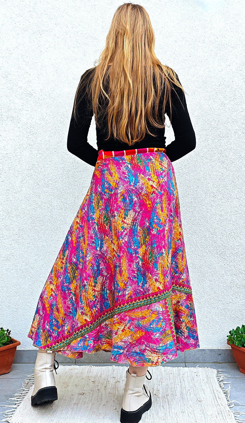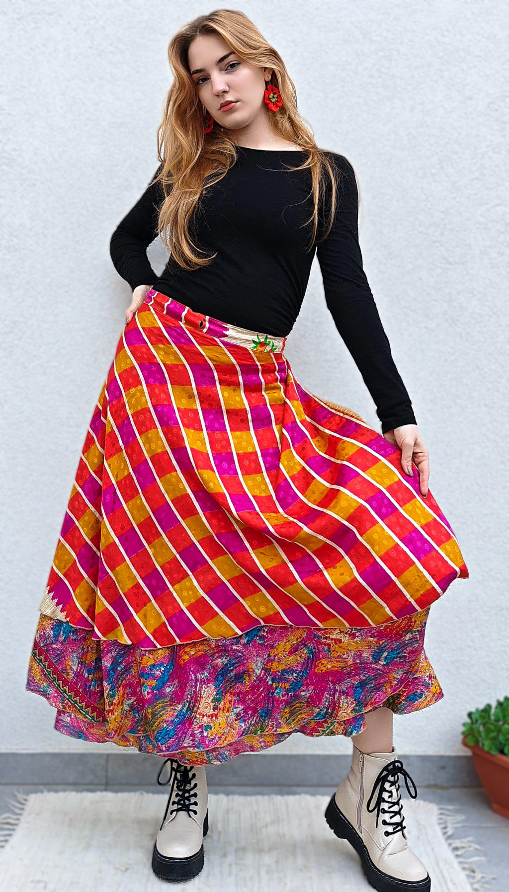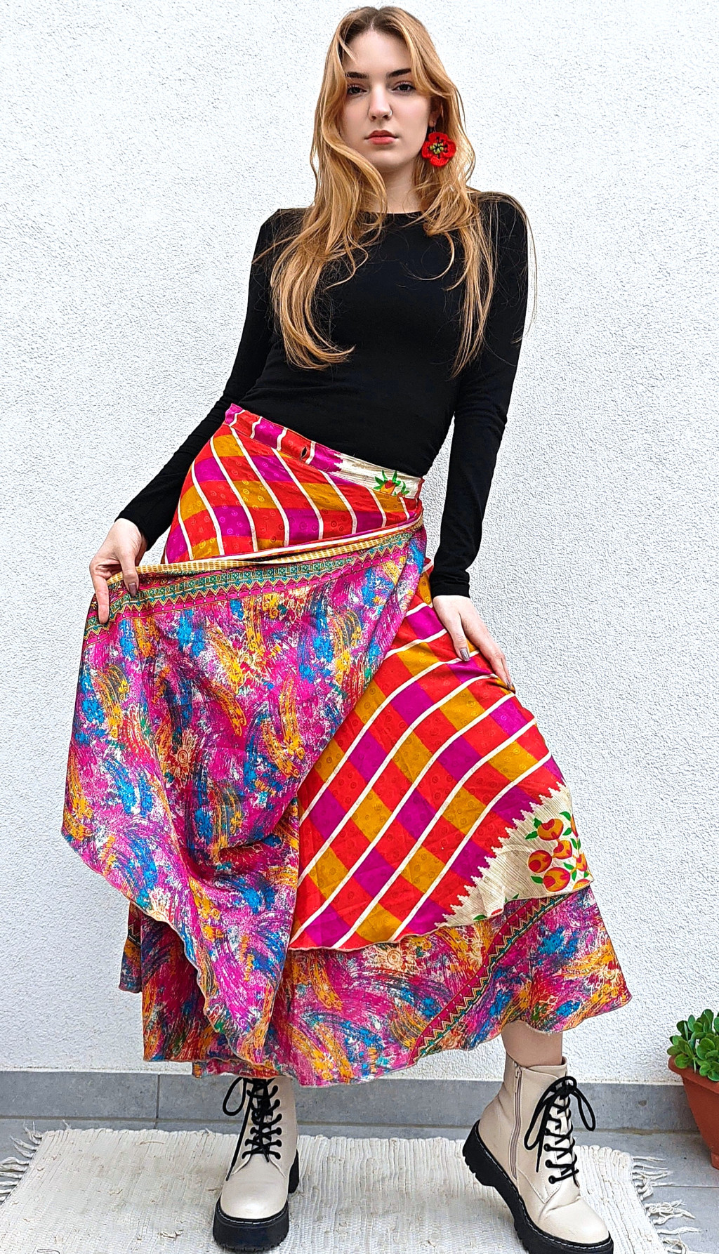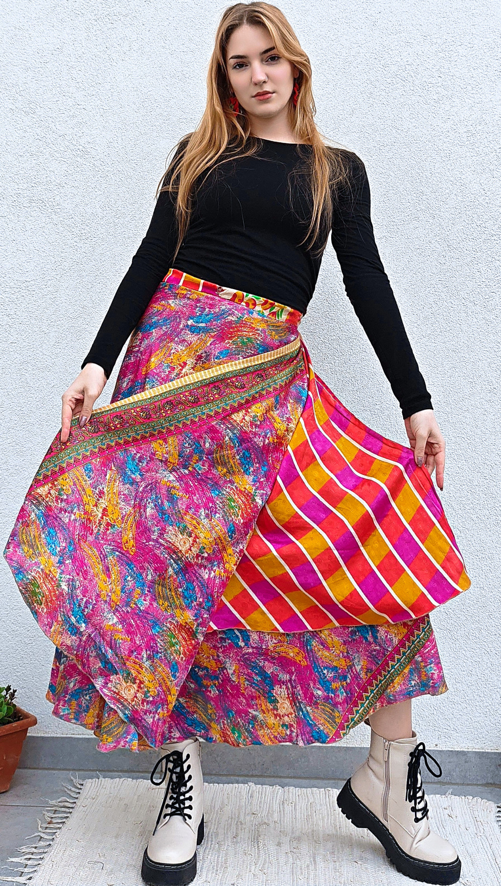 Lapszoknyáink újrahasznosított szárikból készülnek Indiában, egy hosszabb és egy rövidebb anyag derékban összevarrva! Két oldalú, kifordítható, mindkét oldala hordható, sokféleképpen köthető, variálható. Szoknyáinkból nincs két egyforma, mindegyikből csak EGY darab van, ha megtetszik, csapj le rá!