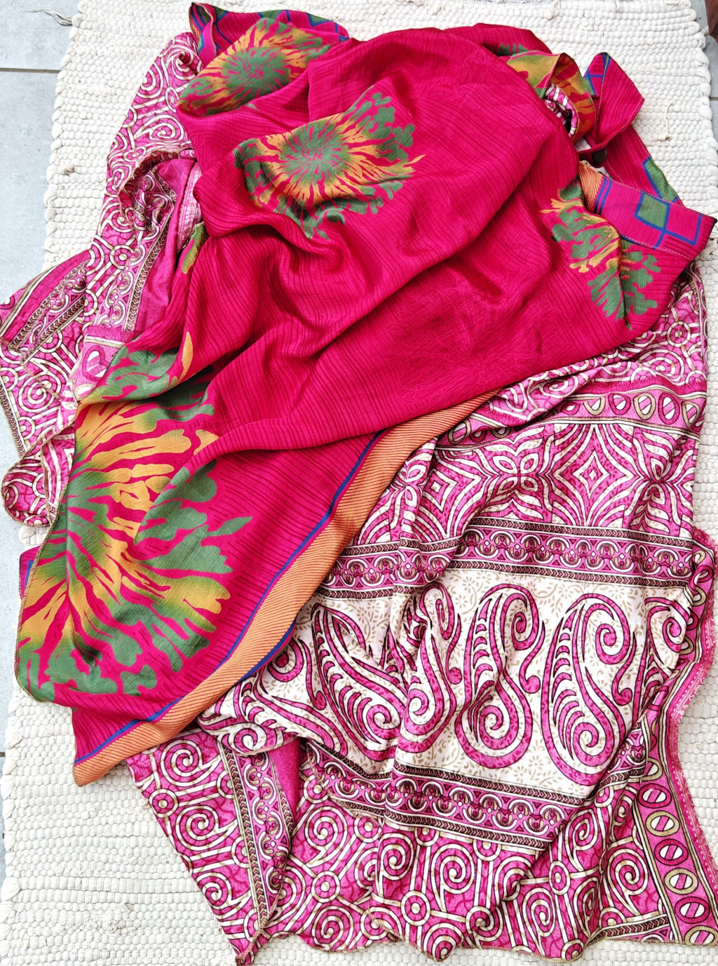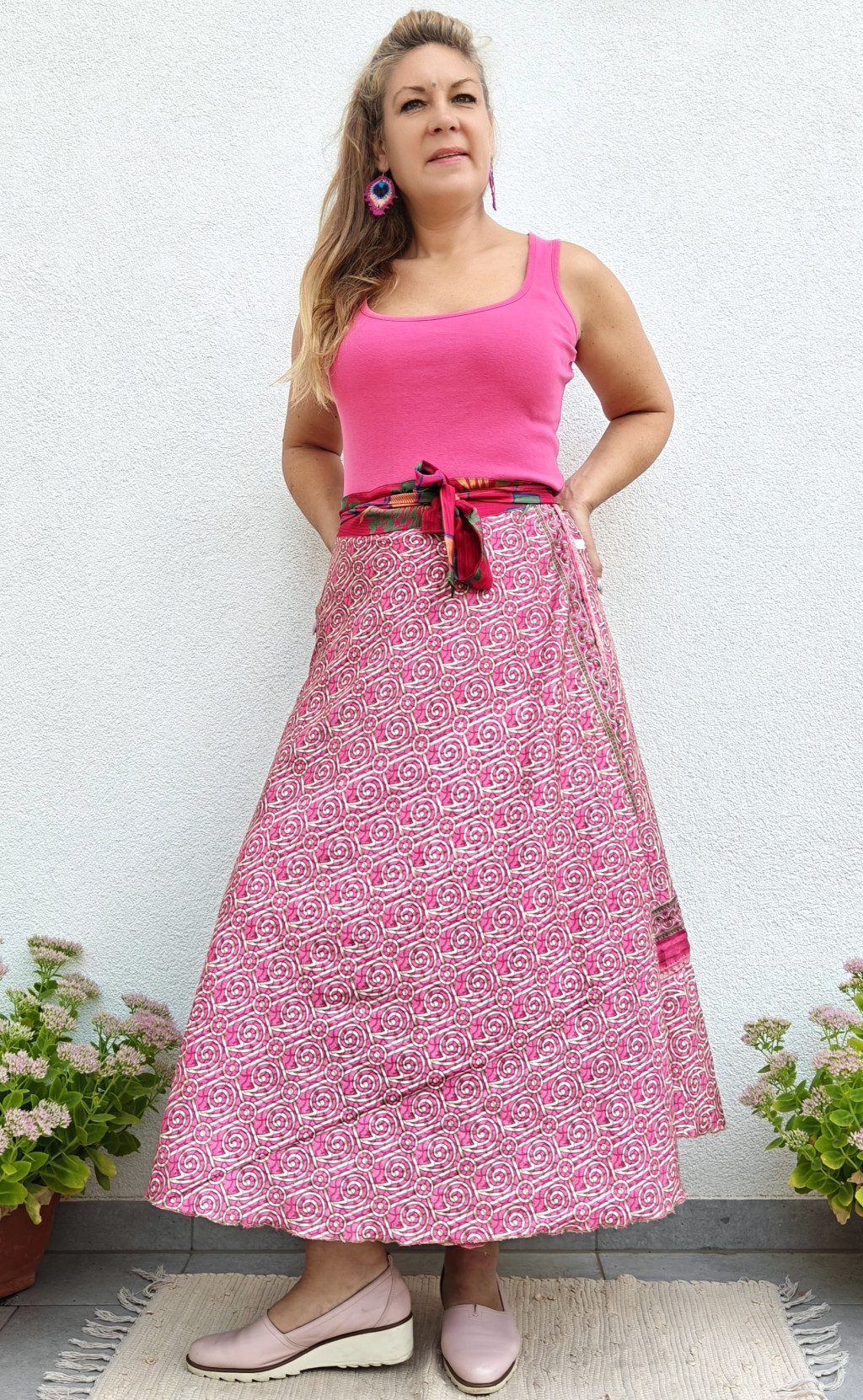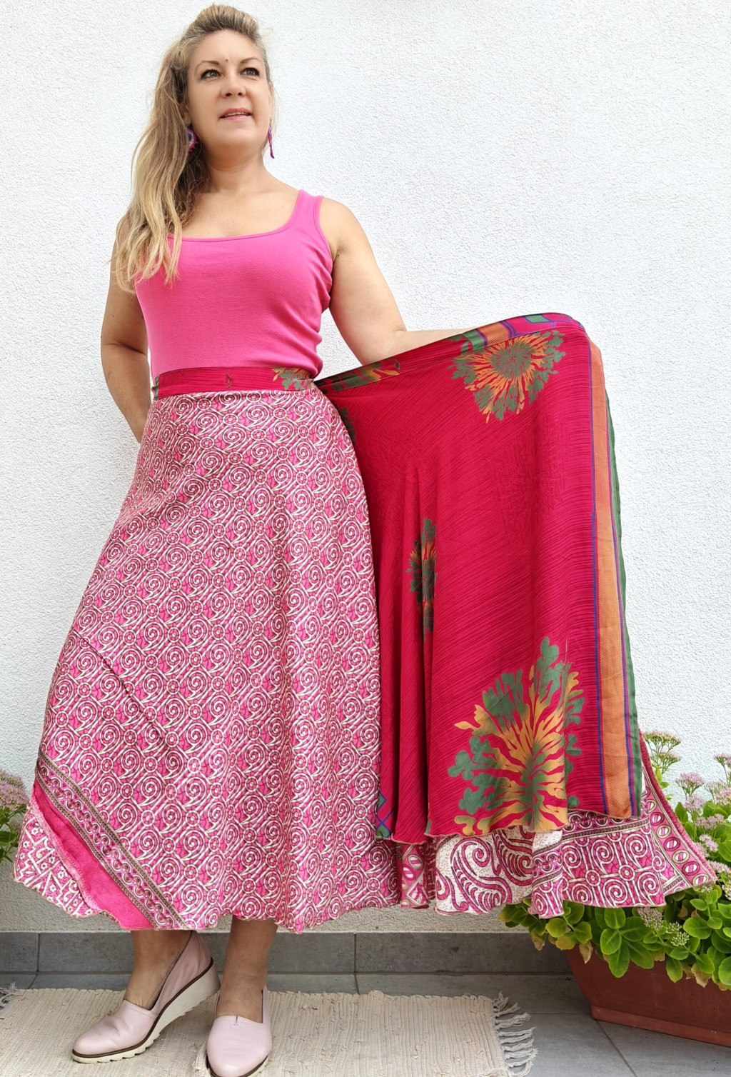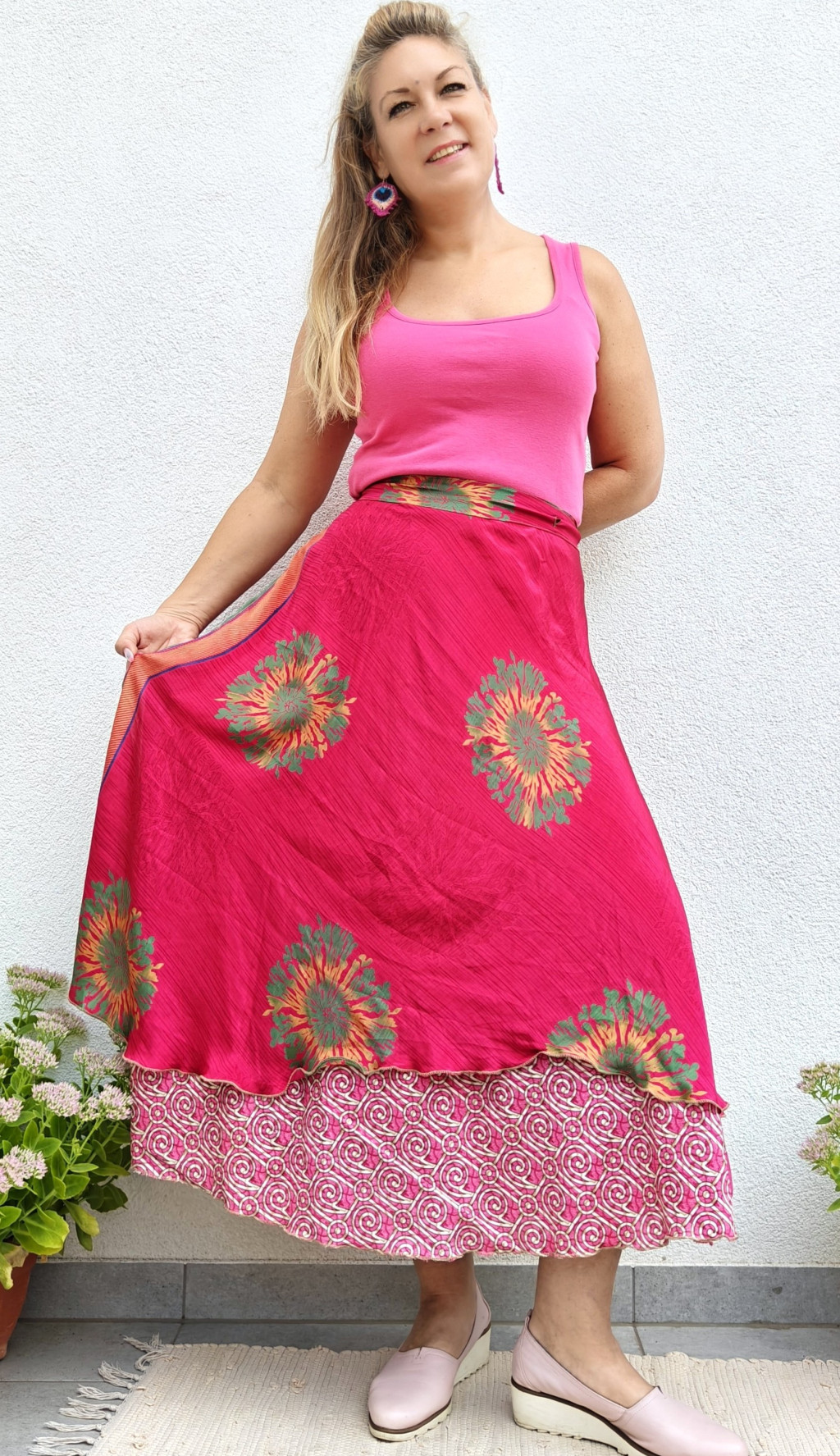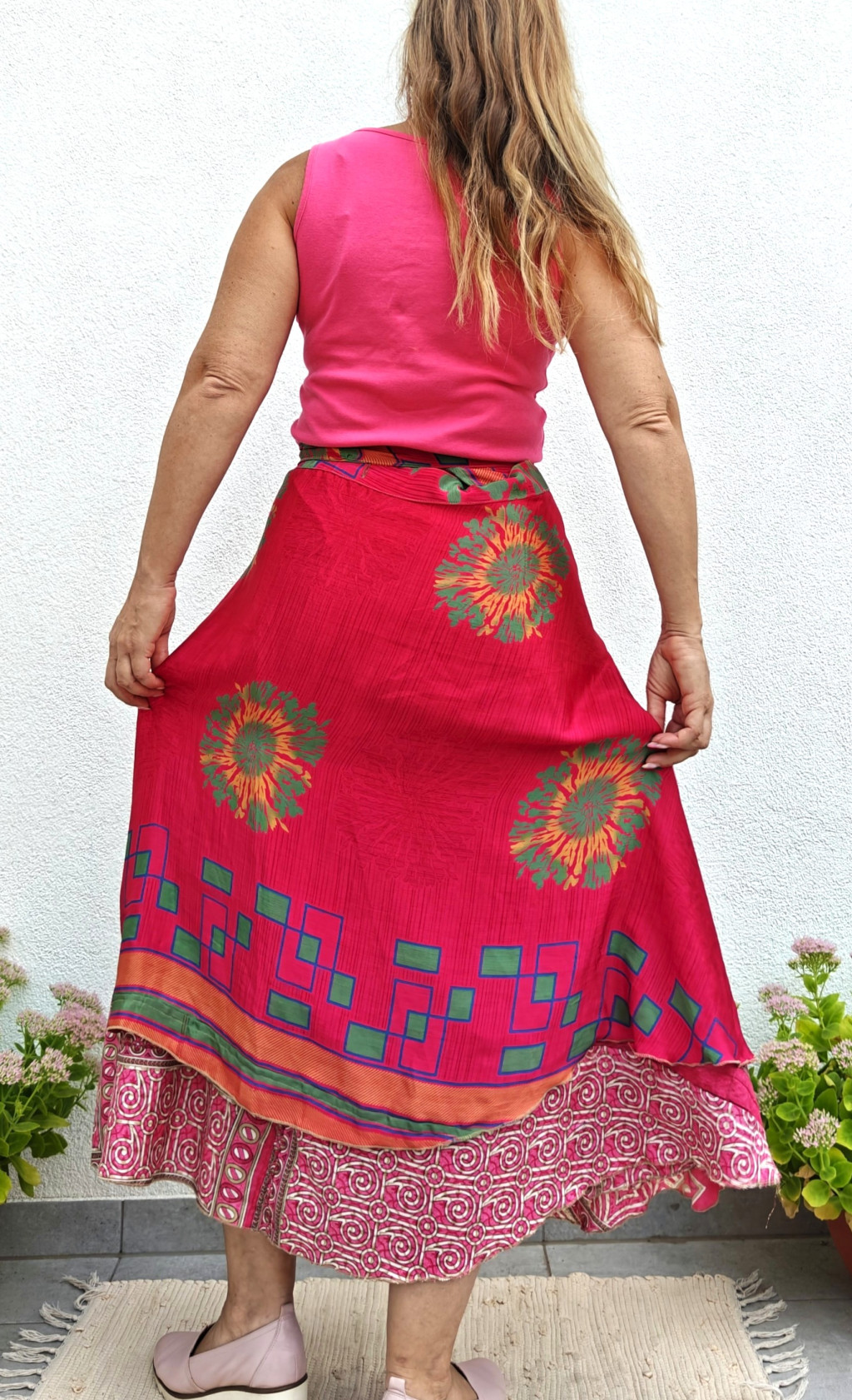 Lapszoknyáink újrahasznosított szárikból készülnek Indiában, egy hosszabb és egy rövidebb anyag derékban összevarrva! Két oldalú, kifordítható, mindkét oldala hordható, sokféleképpen köthető, variálható. Szoknyáinkból nincs két egyforma, mindegyikből csak EGY darab van, ha megtetszik, csapj le rá!