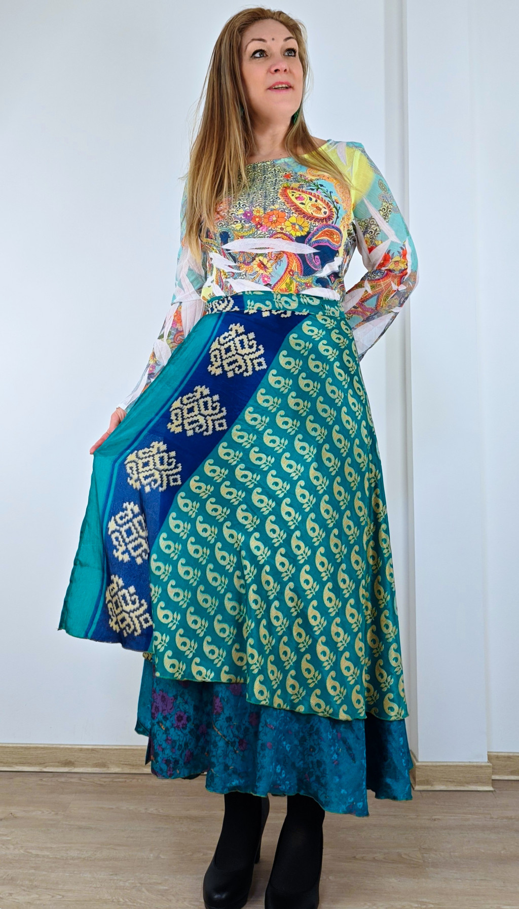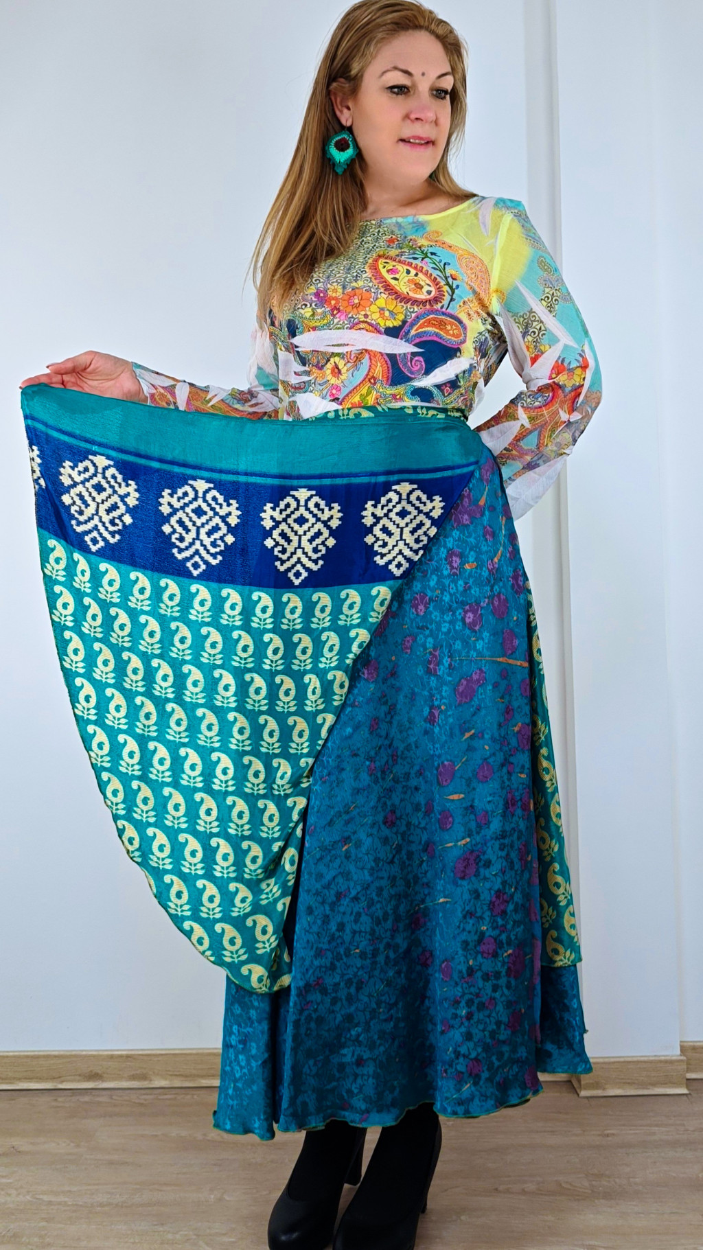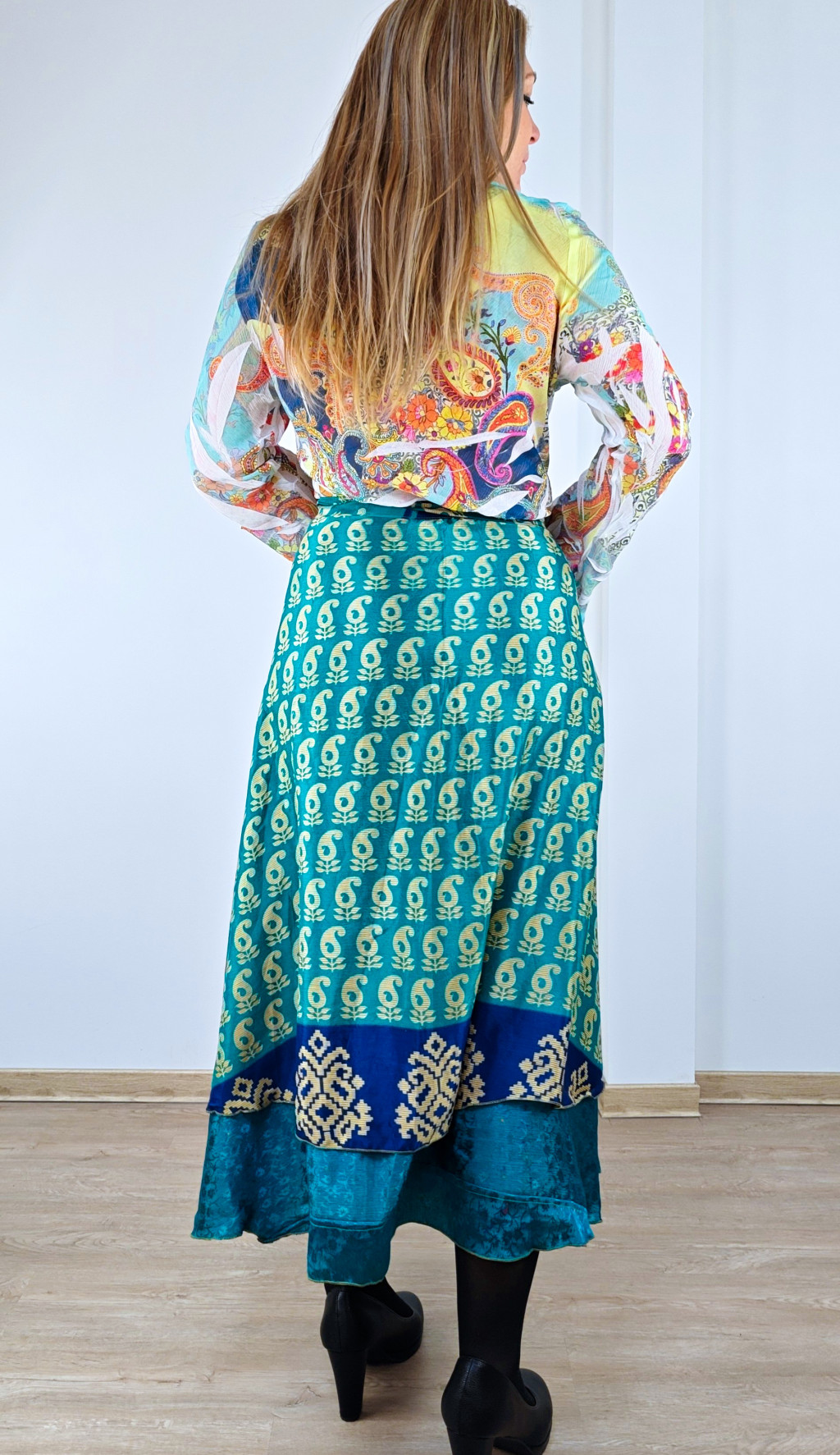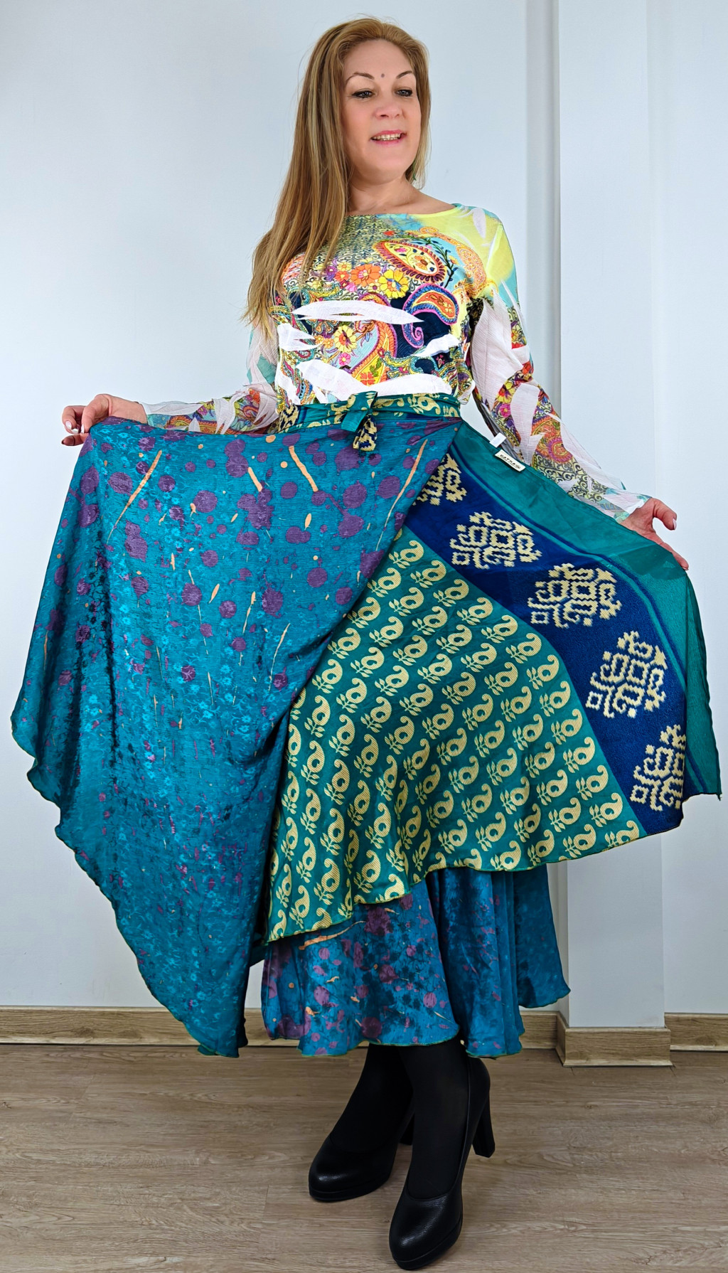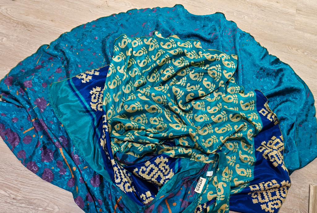Lapszoknyáink újrahasznosított szárikból készülnek Indiában, egy hosszabb és egy rövidebb anyag derékban összevarrva! Két oldalú, kifordítható, mindkét oldala hordható, sokféleképpen köthető, variálható. Szoknyáinkból nincs két egyforma, mindegyikből csak EGY darab van, ha megtetszik, csapj le rá!