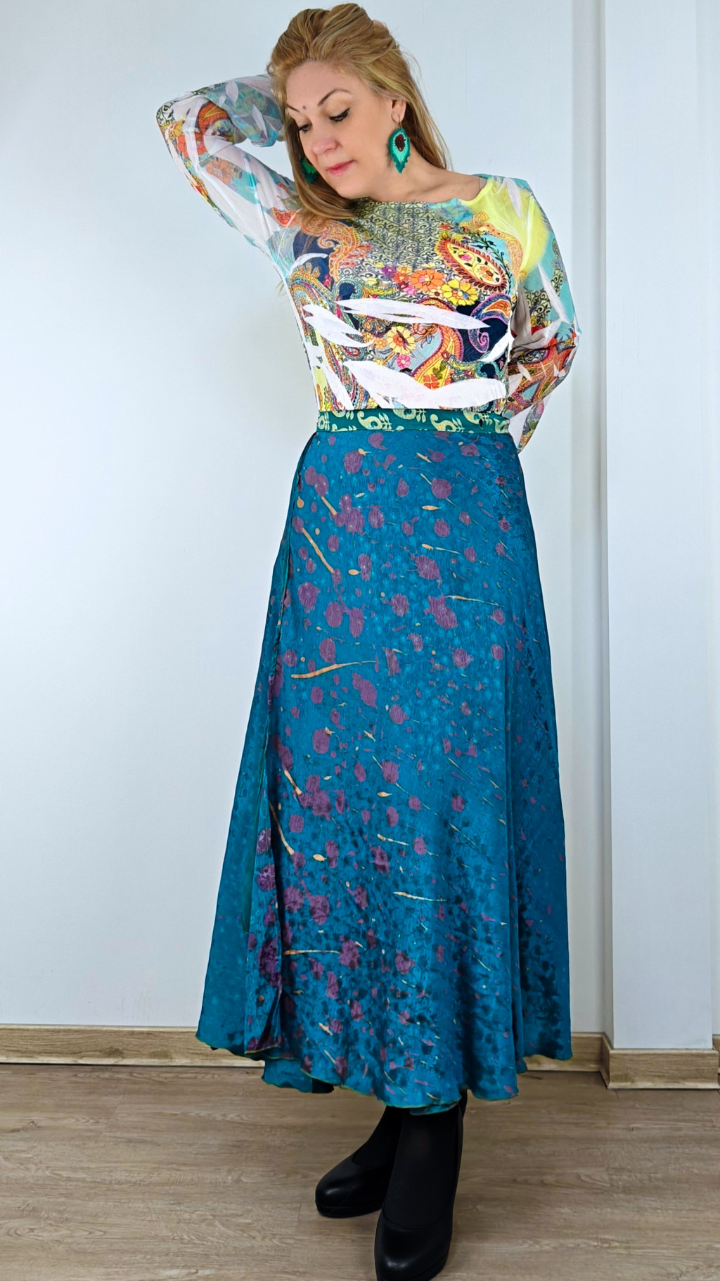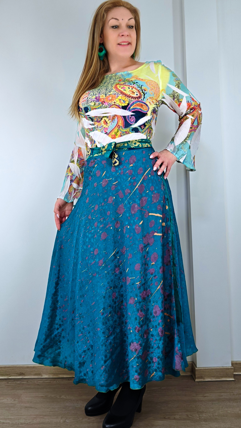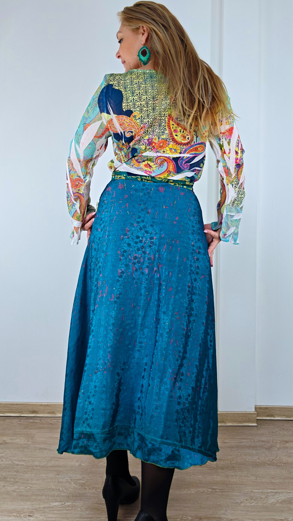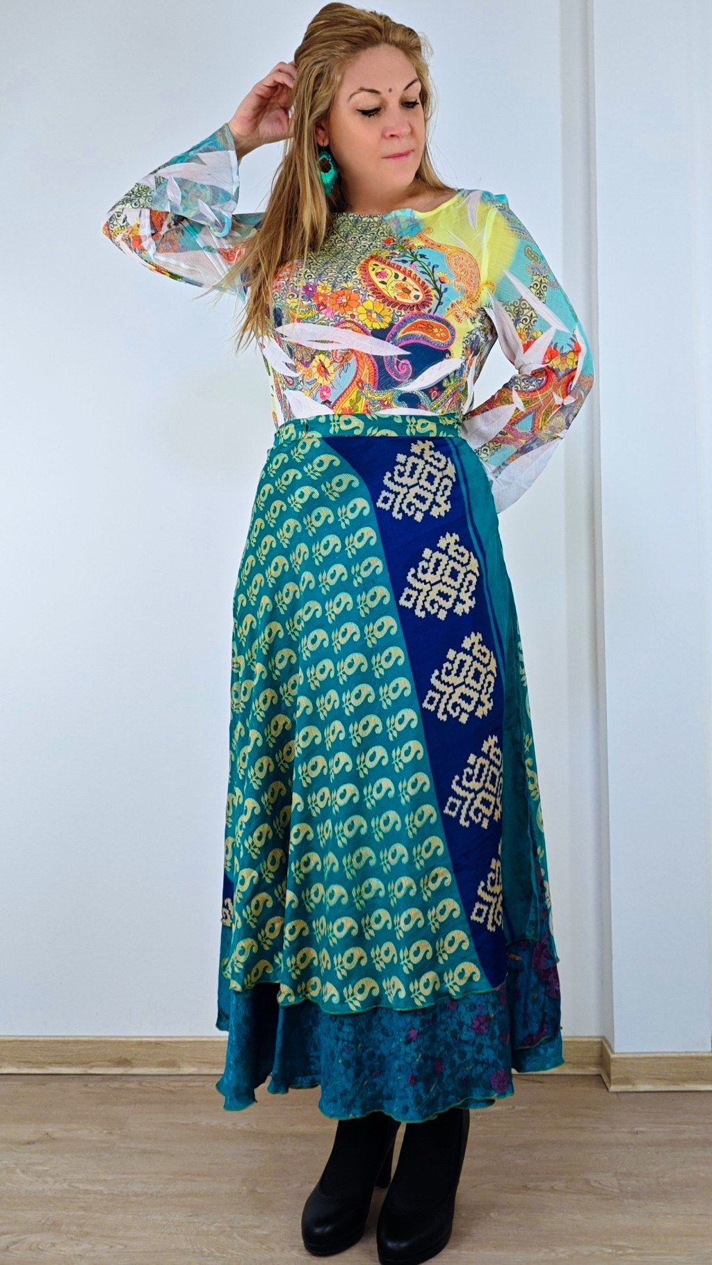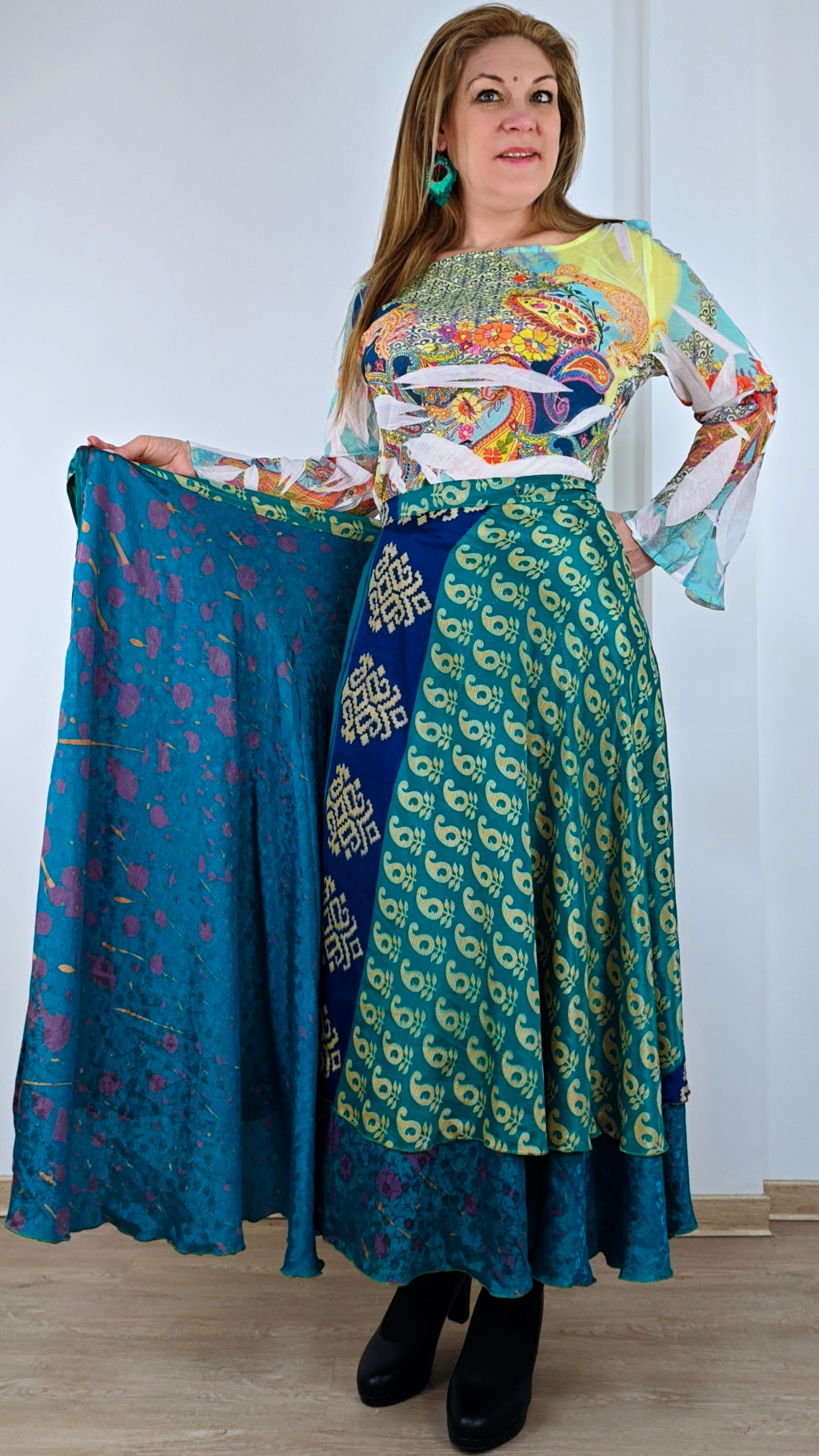 Lapszoknyáink újrahasznosított szárikból készülnek Indiában, egy hosszabb és egy rövidebb anyag derékban összevarrva! Két oldalú, kifordítható, mindkét oldala hordható, sokféleképpen köthető, variálható. Szoknyáinkból nincs két egyforma, mindegyikből csak EGY darab van, ha megtetszik, csapj le rá!