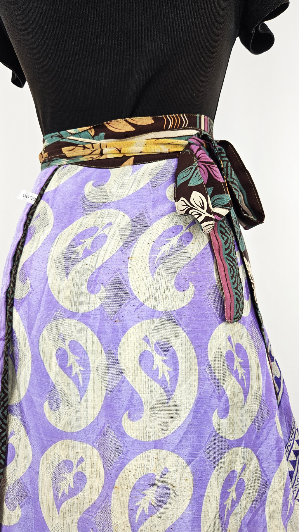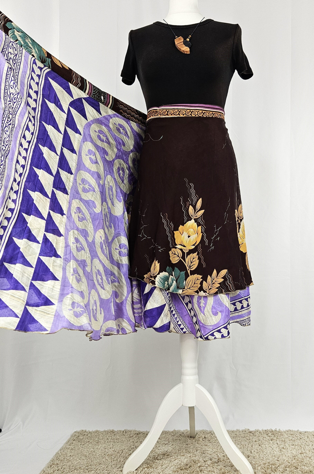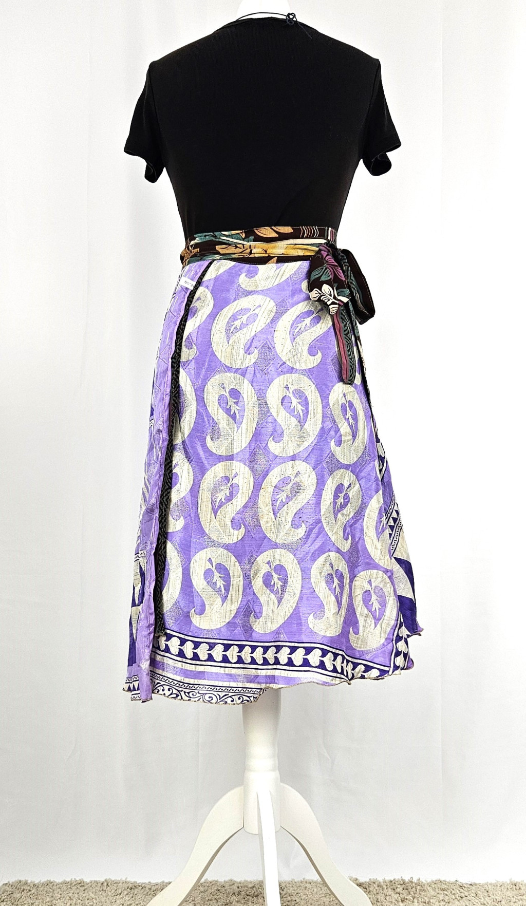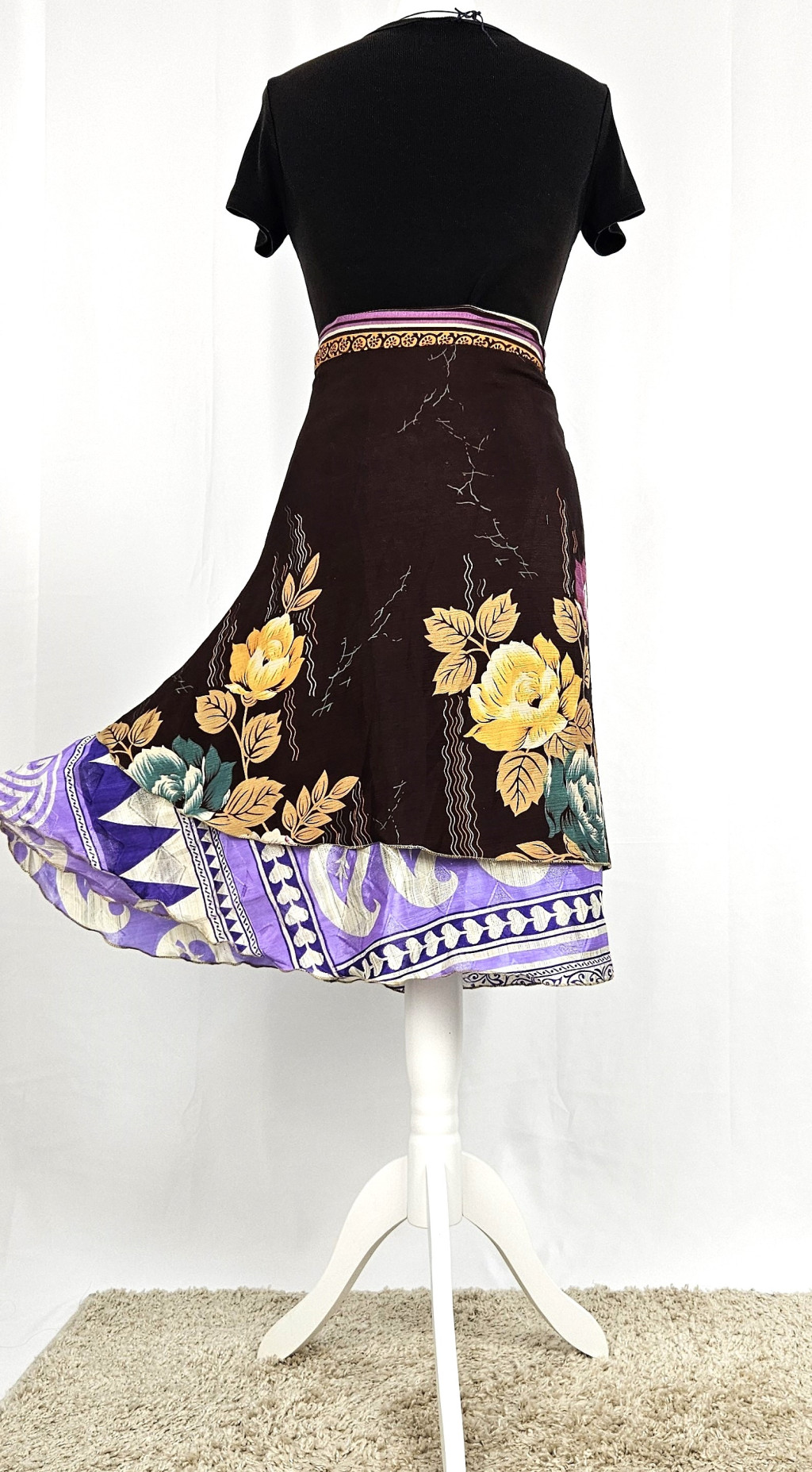 Lapszoknyáink újrahasznosított szárikból készülnek Indiában, egy hosszabb és egy rövidebb anyag derékban összevarrva! Kifordítható, mindkét oldala hordható, sokféleképpen köthető, variálható. Szoknyáinkból nincs két egyforma, mindegyikből csak EGY darab van, ha megtetszik, csapj le rá!