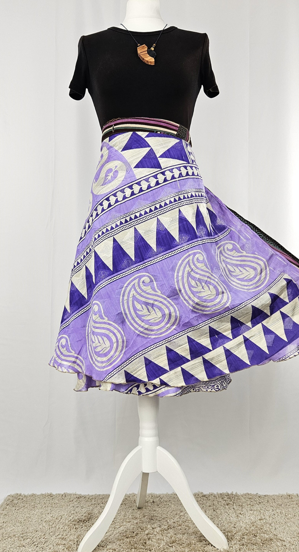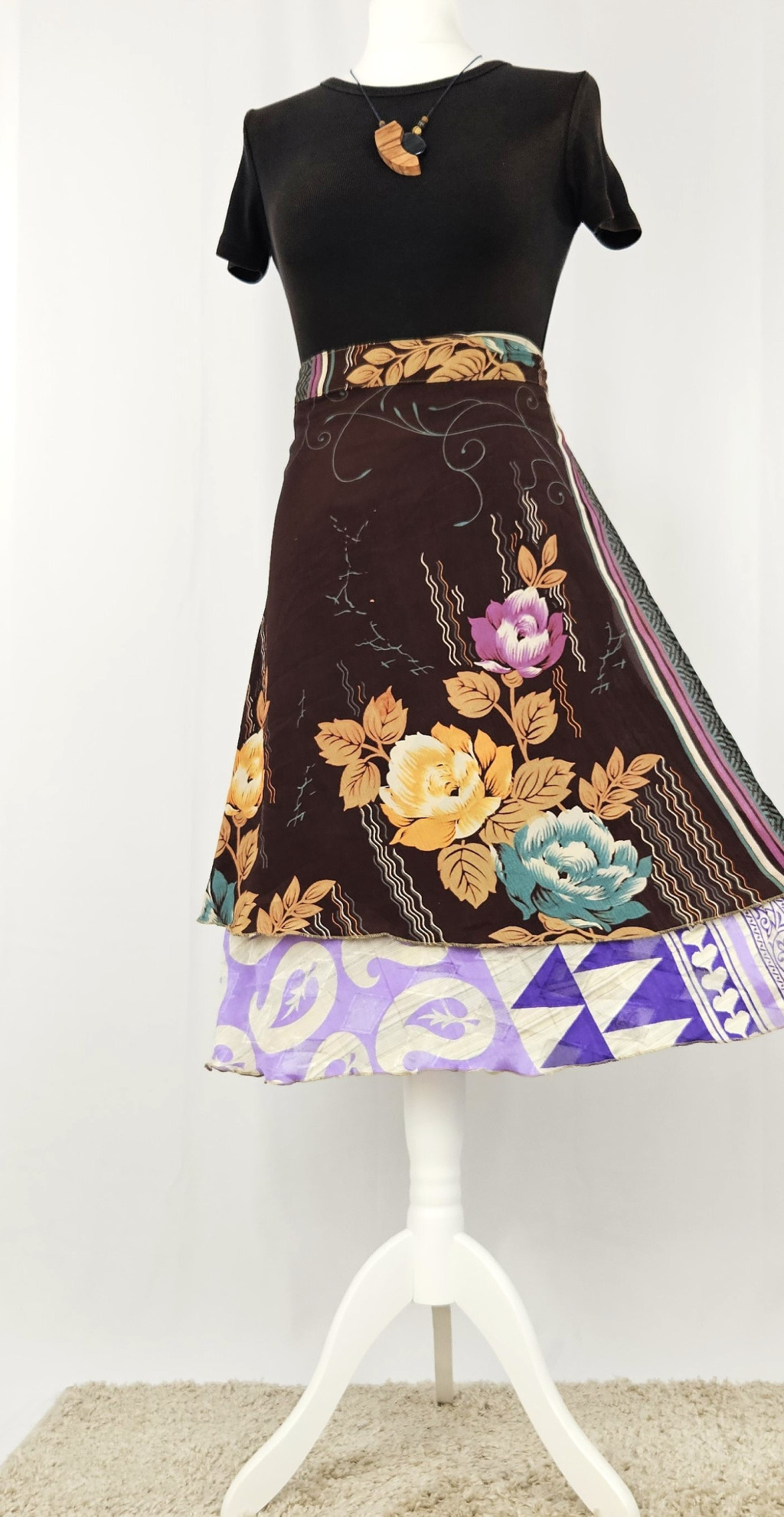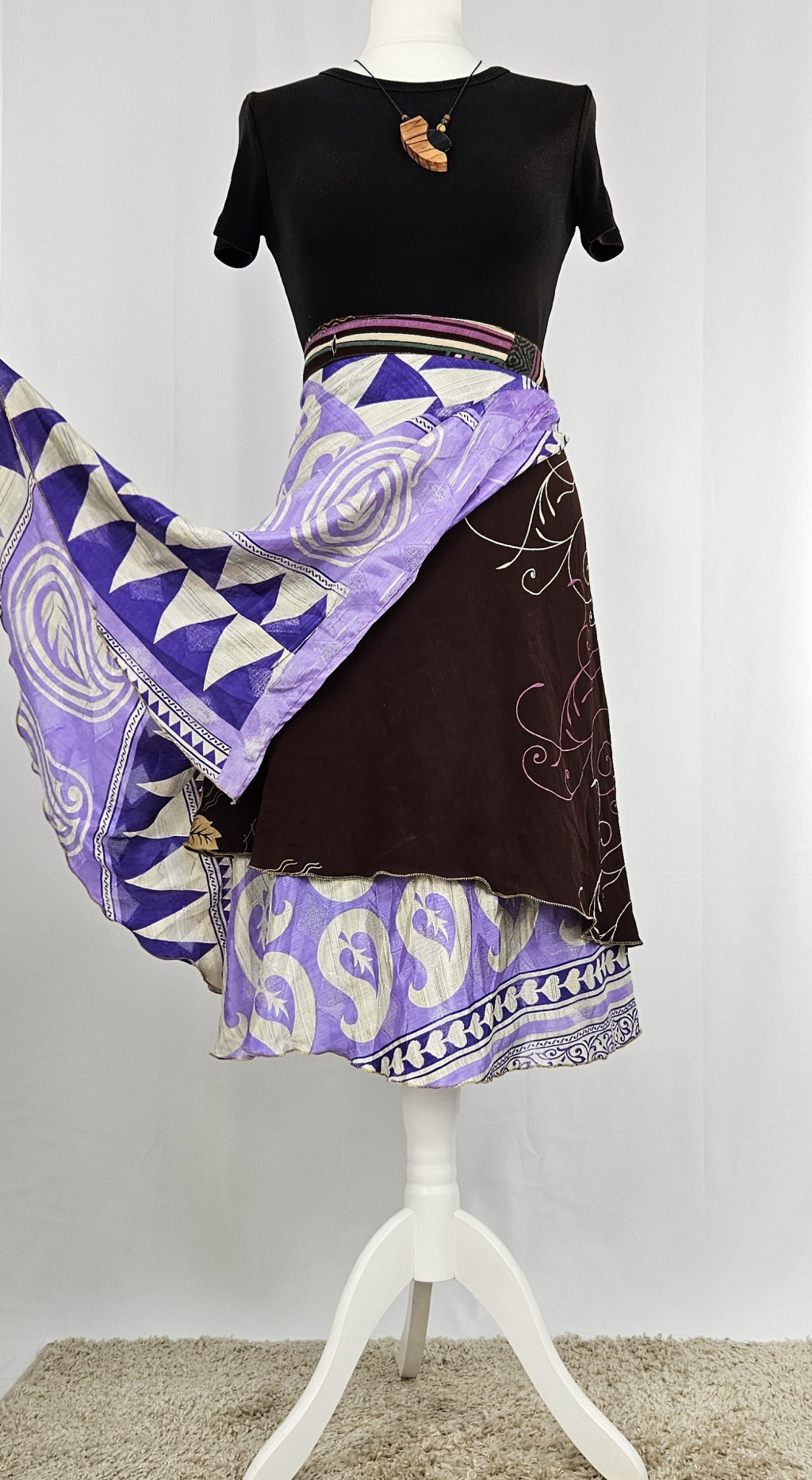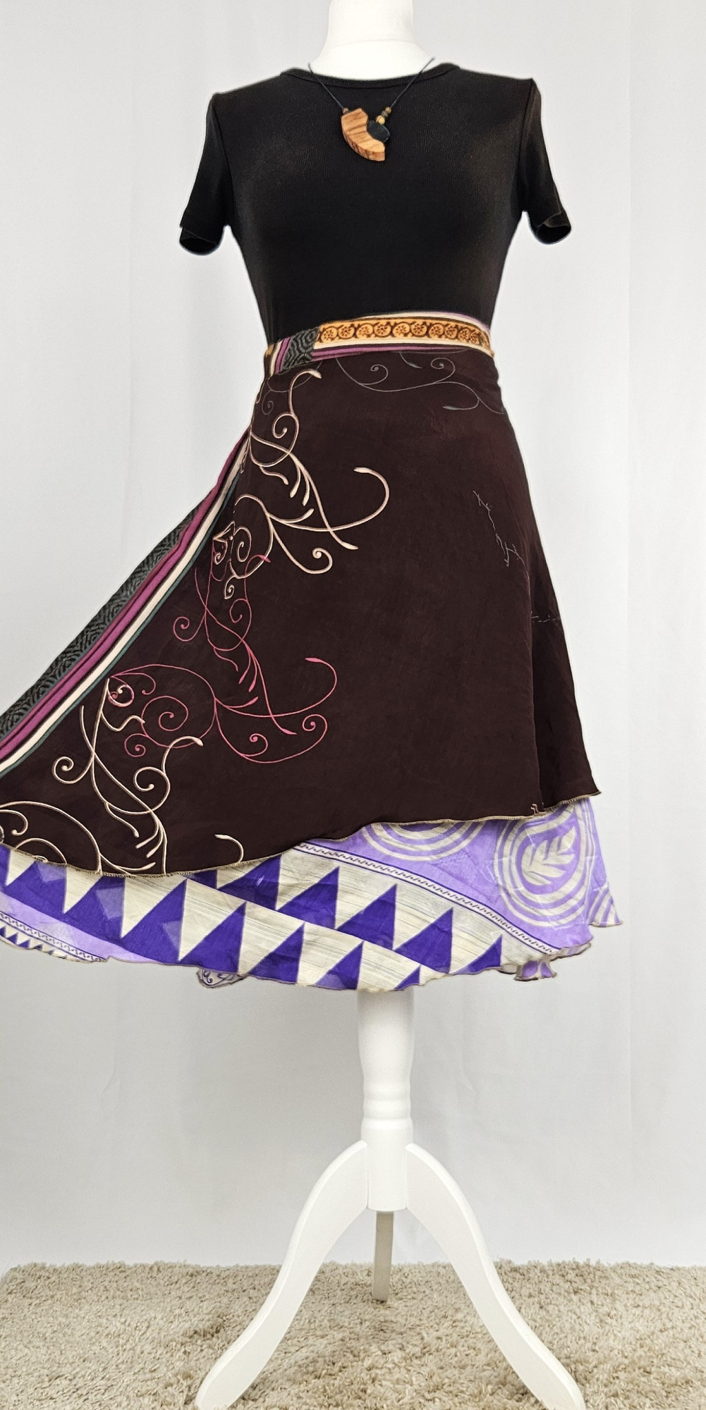 Lapszoknyáink újrahasznosított szárikból készülnek Indiában, egy hosszabb és egy rövidebb anyag derékban összevarrva! Kifordítható, mindkét oldala hordható, sokféleképpen köthető, variálható. Szoknyáinkból nincs két egyforma, mindegyikből csak EGY darab van, ha megtetszik, csapj le rá!