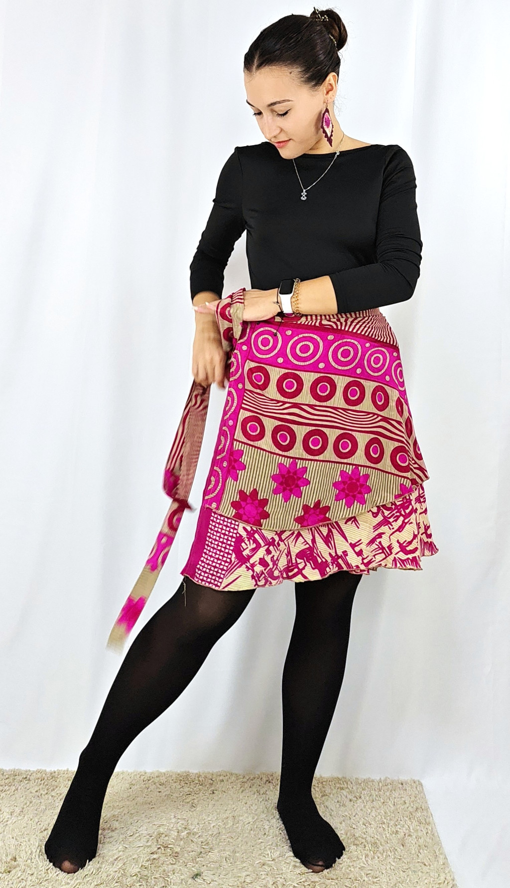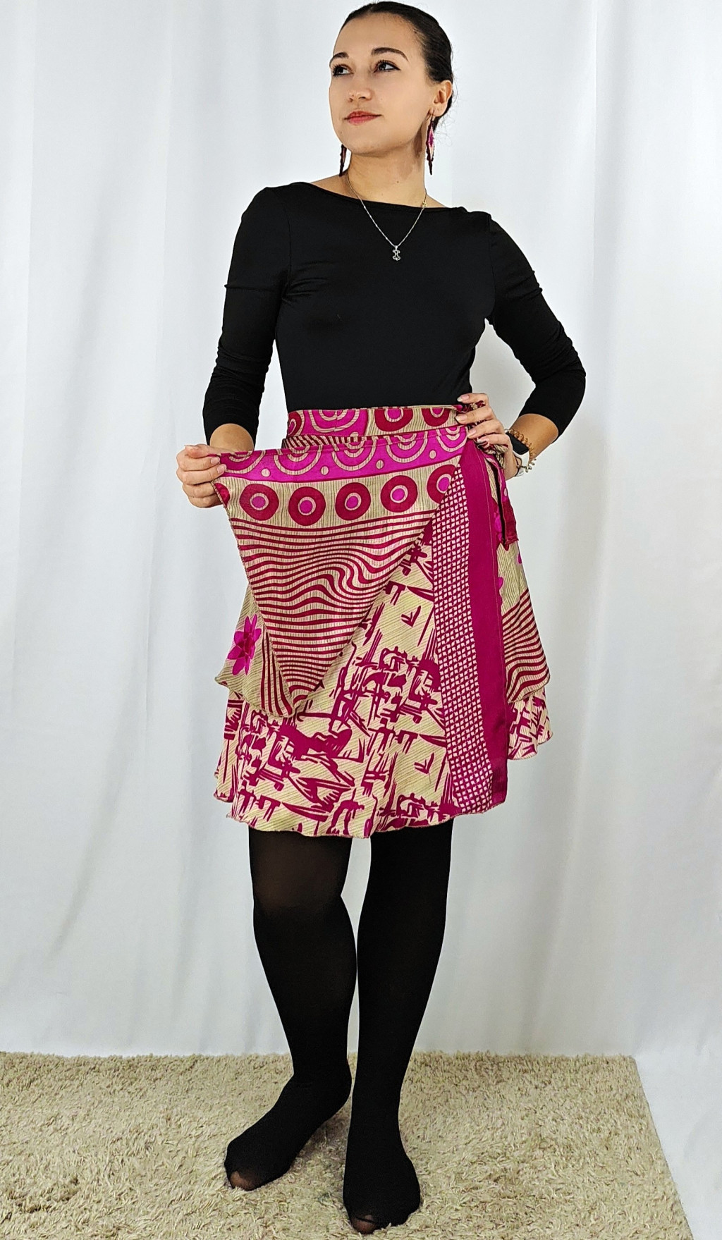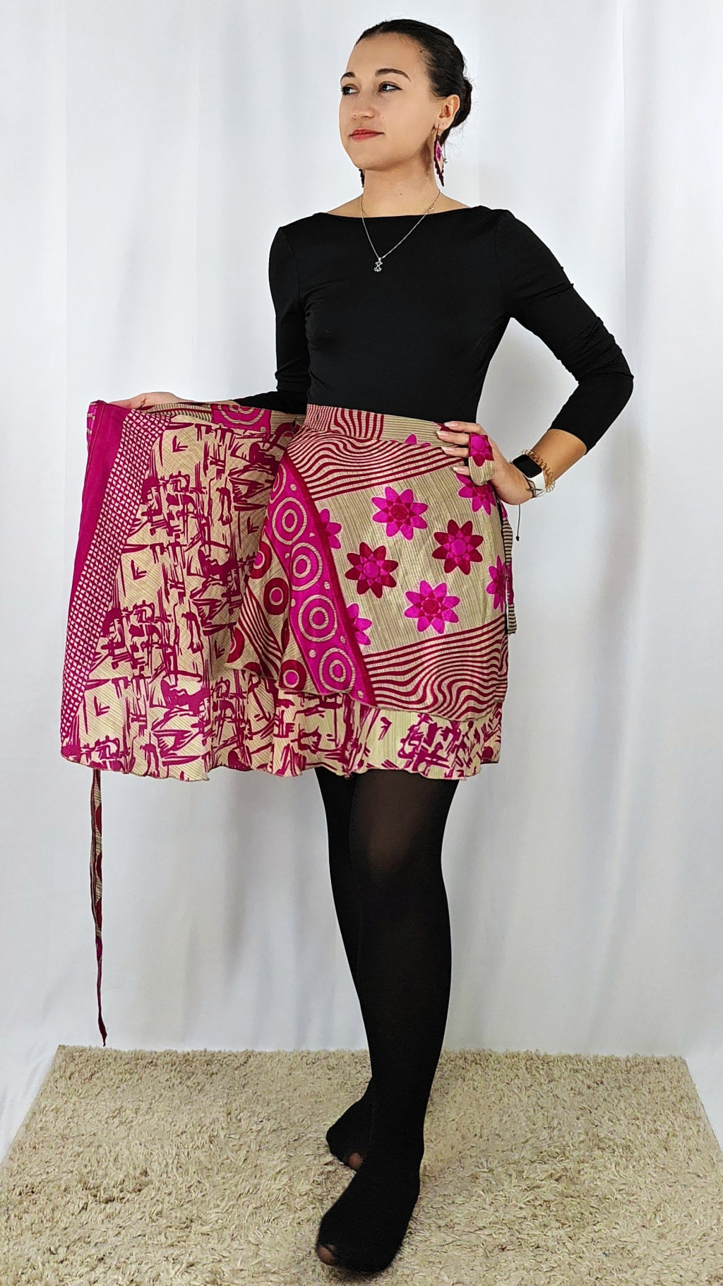 Lapszoknyáink újrahasznosított szárikból készülnek Indiában, egy hosszabb és egy rövidebb anyag derékban összevarrva! Két oldalú, kifordítható, mindkét oldala hordható, sokféleképpen köthető, variálható. Szoknyáinkból nincs két egyforma, mindegyikből csak EGY darab van, ha megtetszik, csapj le rá!