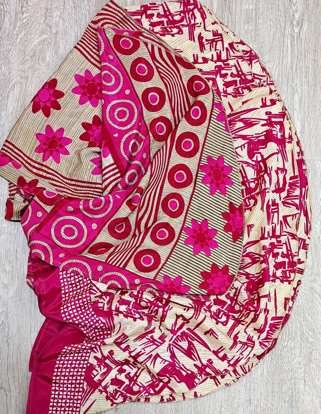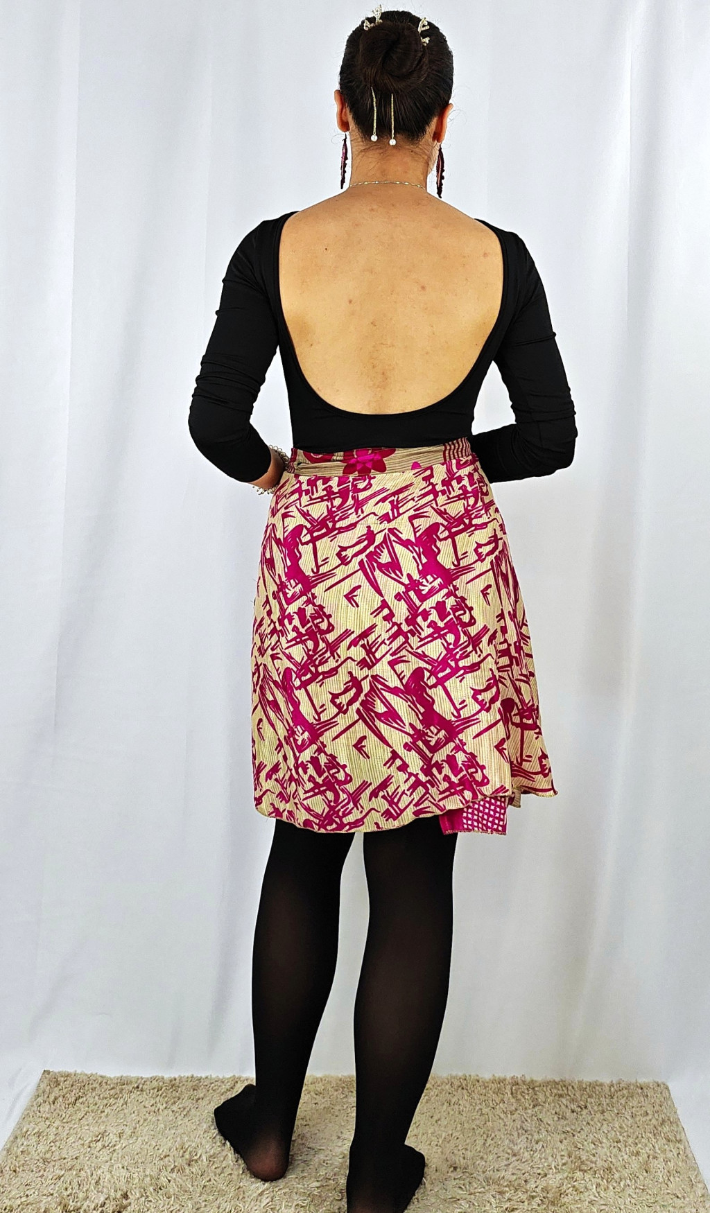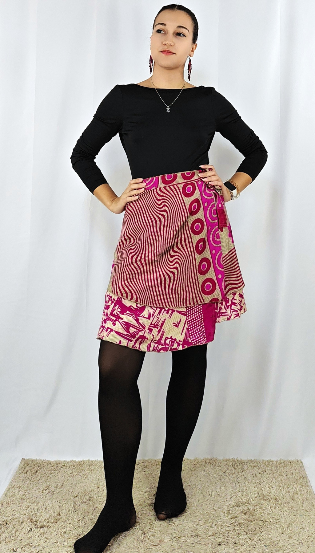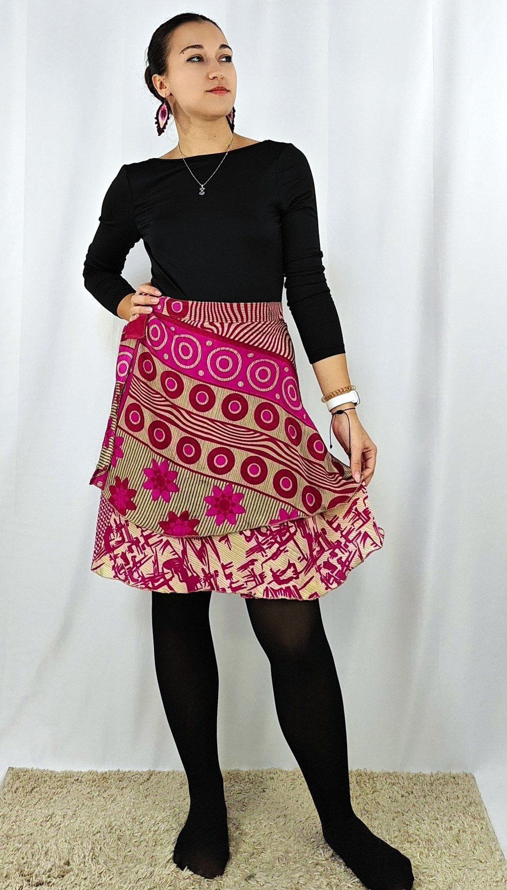 Lapszoknyáink újrahasznosított szárikból készülnek Indiában, egy hosszabb és egy rövidebb anyag derékban összevarrva! Két oldalú, kifordítható, mindkét oldala hordható, sokféleképpen köthető, variálható. Szoknyáinkból nincs két egyforma, mindegyikből csak EGY darab van, ha megtetszik, csapj le rá!