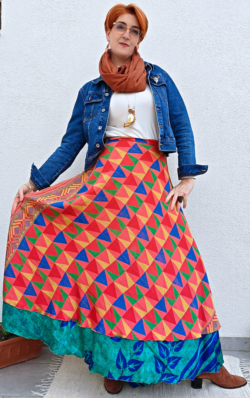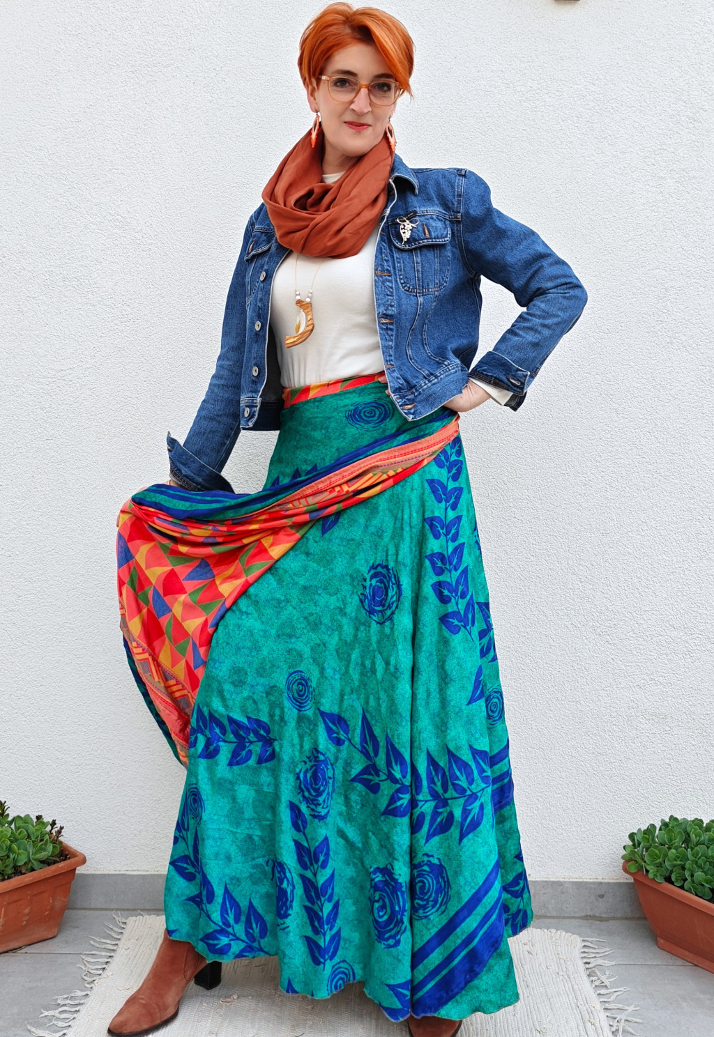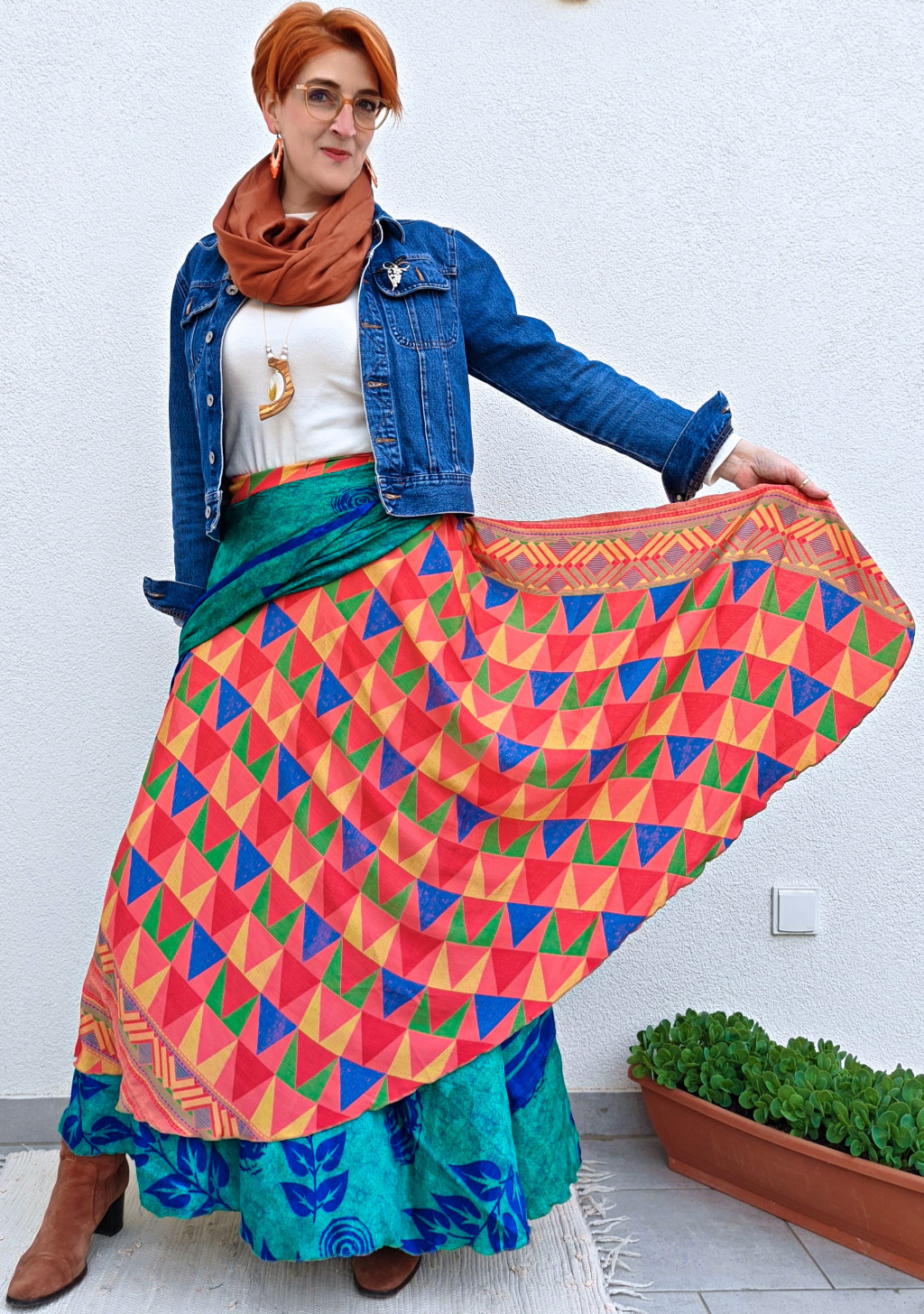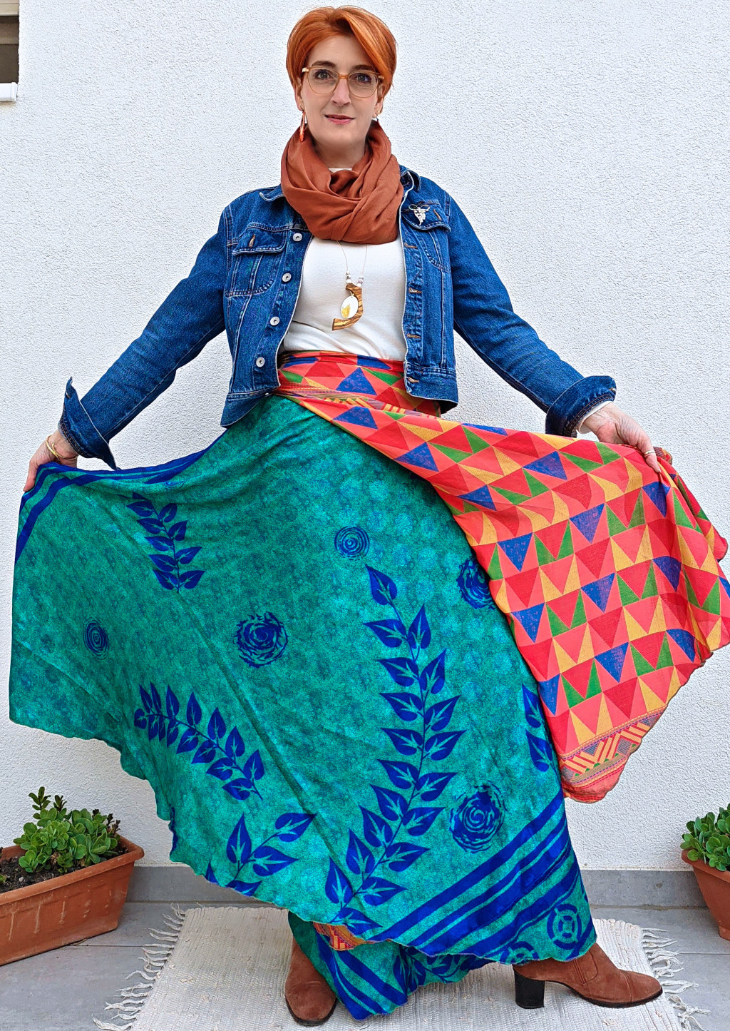 Lapszoknyáink újrahasznosított szárikból készülnek Indiában, egy hosszabb és egy rövidebb anyag derékban összevarrva! Két oldalú, kifordítható, mindkét oldala hordható, sokféleképpen köthető, variálható. Szoknyáinkból nincs két egyforma, mindegyikből csak EGY darab van, ha megtetszik, csapj le rá!