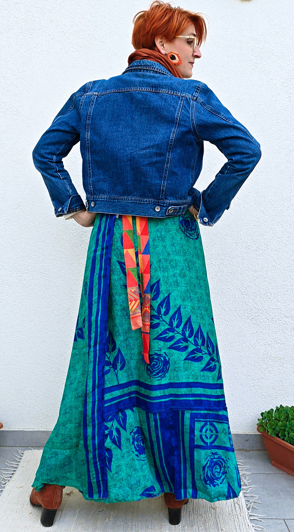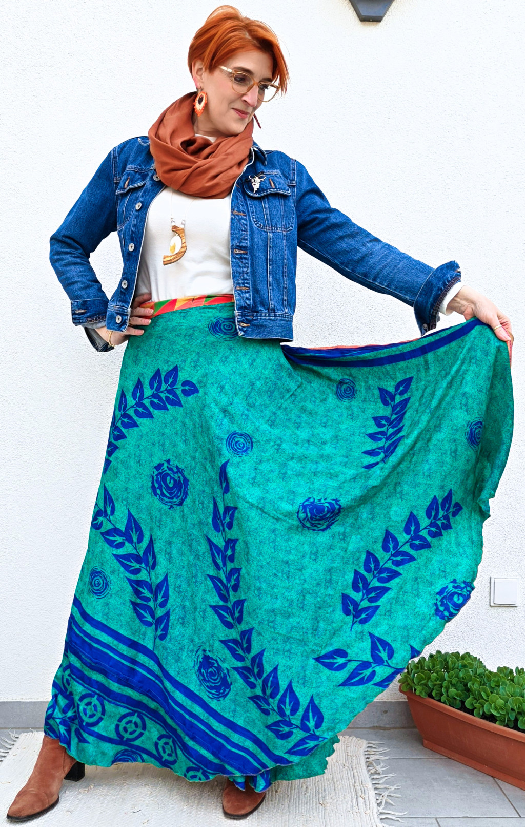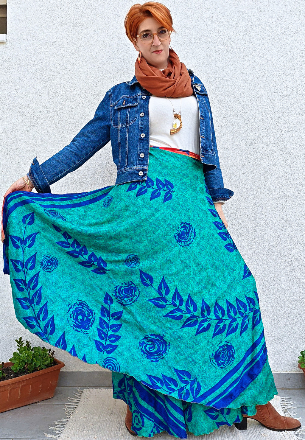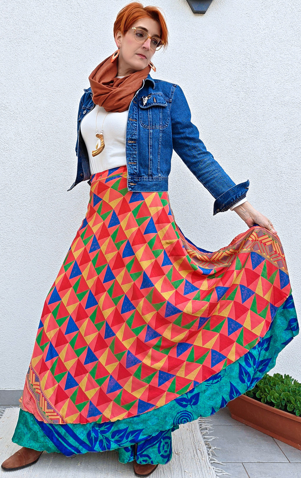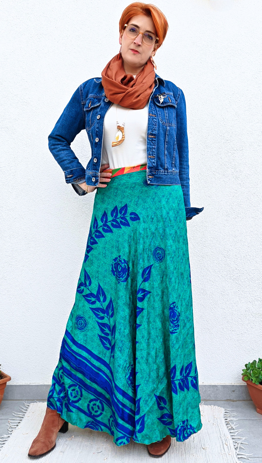 Lapszoknyáink újrahasznosított szárikból készülnek Indiában, egy hosszabb és egy rövidebb anyag derékban összevarrva! Két oldalú, kifordítható, mindkét oldala hordható, sokféleképpen köthető, variálható. Szoknyáinkból nincs két egyforma, mindegyikből csak EGY darab van, ha megtetszik, csapj le rá!