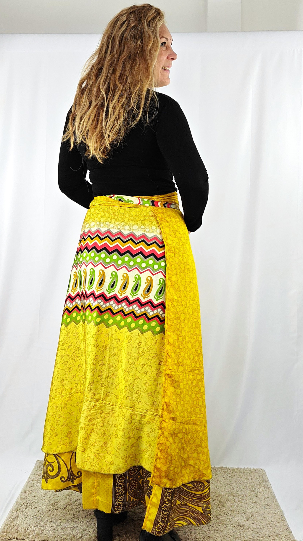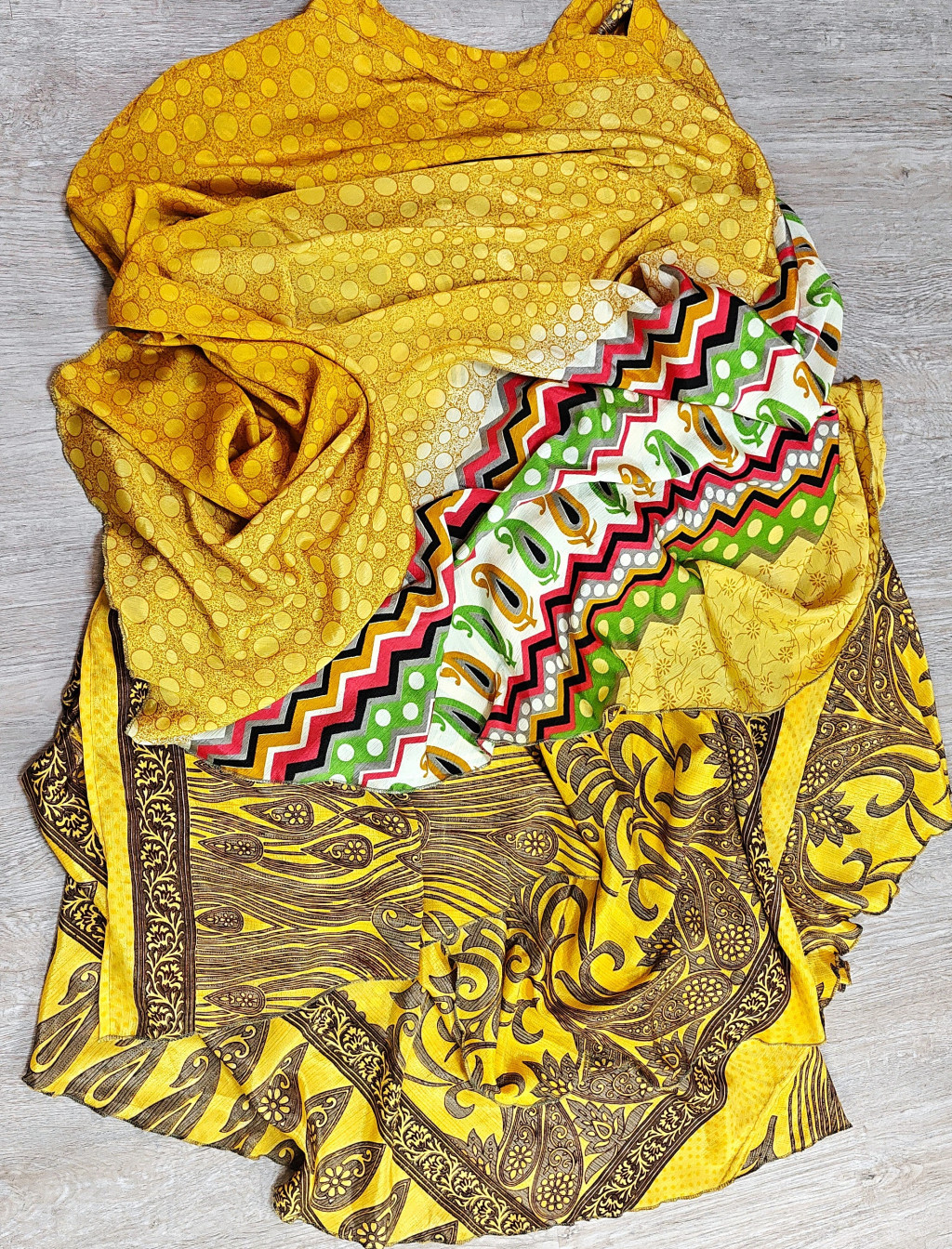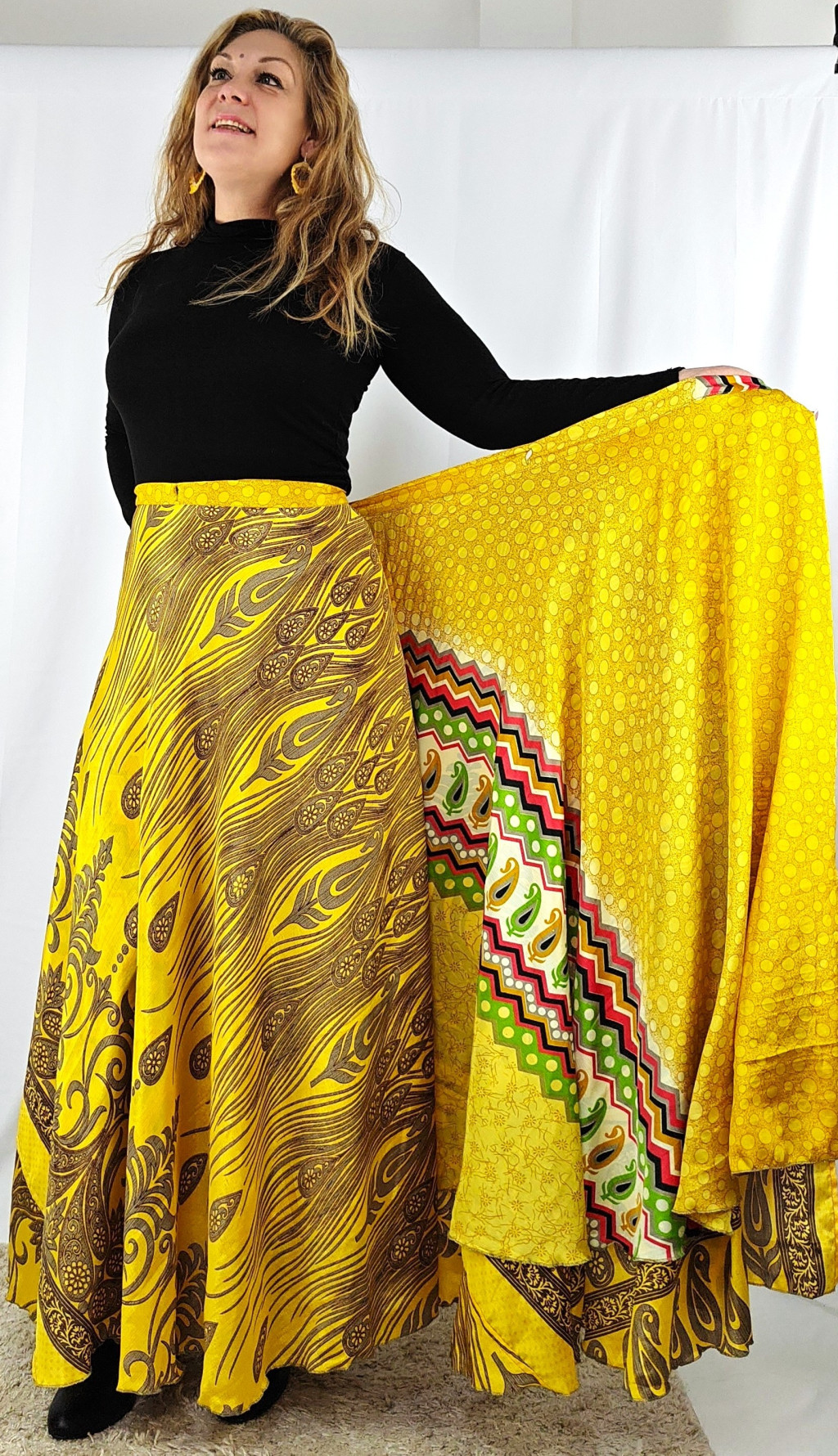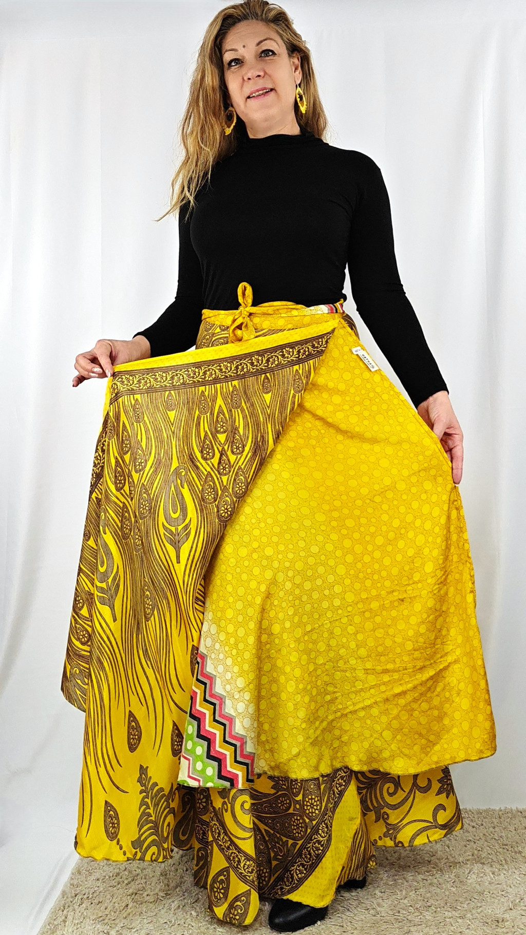 Lapszoknyáink újrahasznosított szárikból készülnek Indiában, egy hosszabb és egy rövidebb anyag derékban összevarrva! Két oldalú, kifordítható, mindkét oldala hordható, sokféleképpen köthető, variálható. Szoknyáinkból nincs két egyforma, mindegyikből csak EGY darab van, ha megtetszik, csapj le rá!
