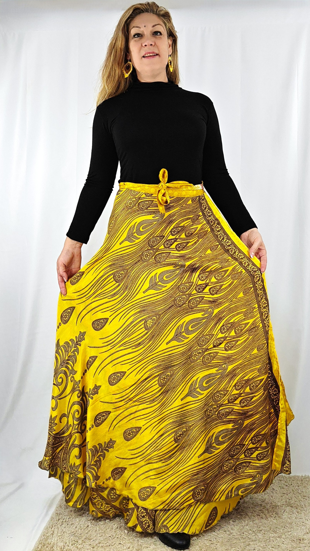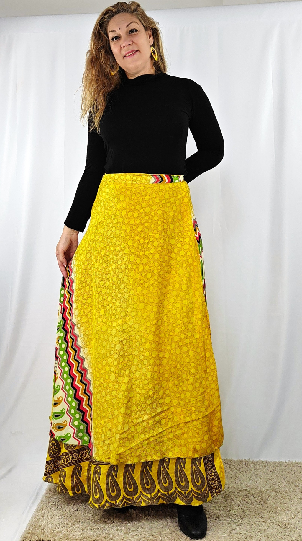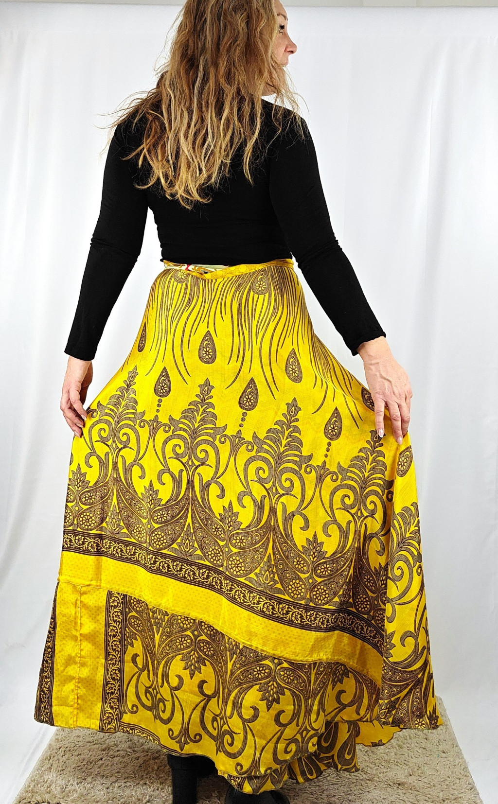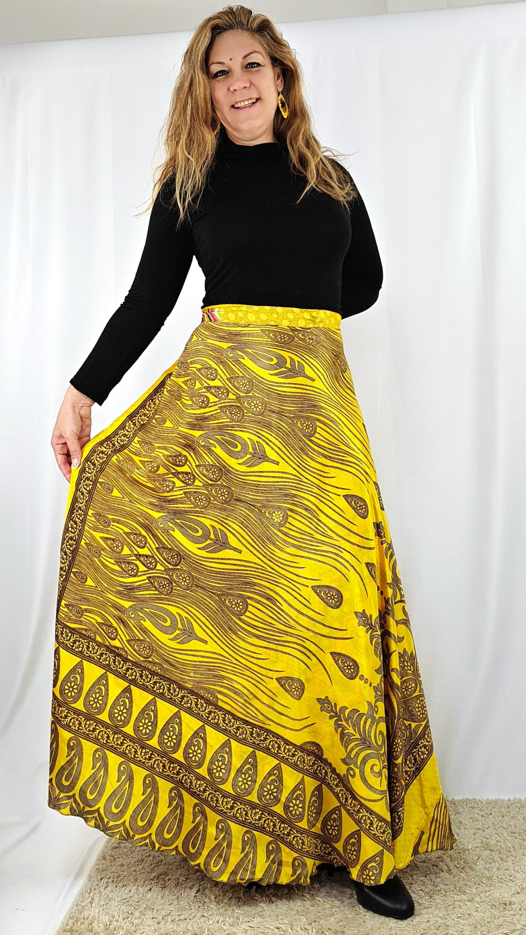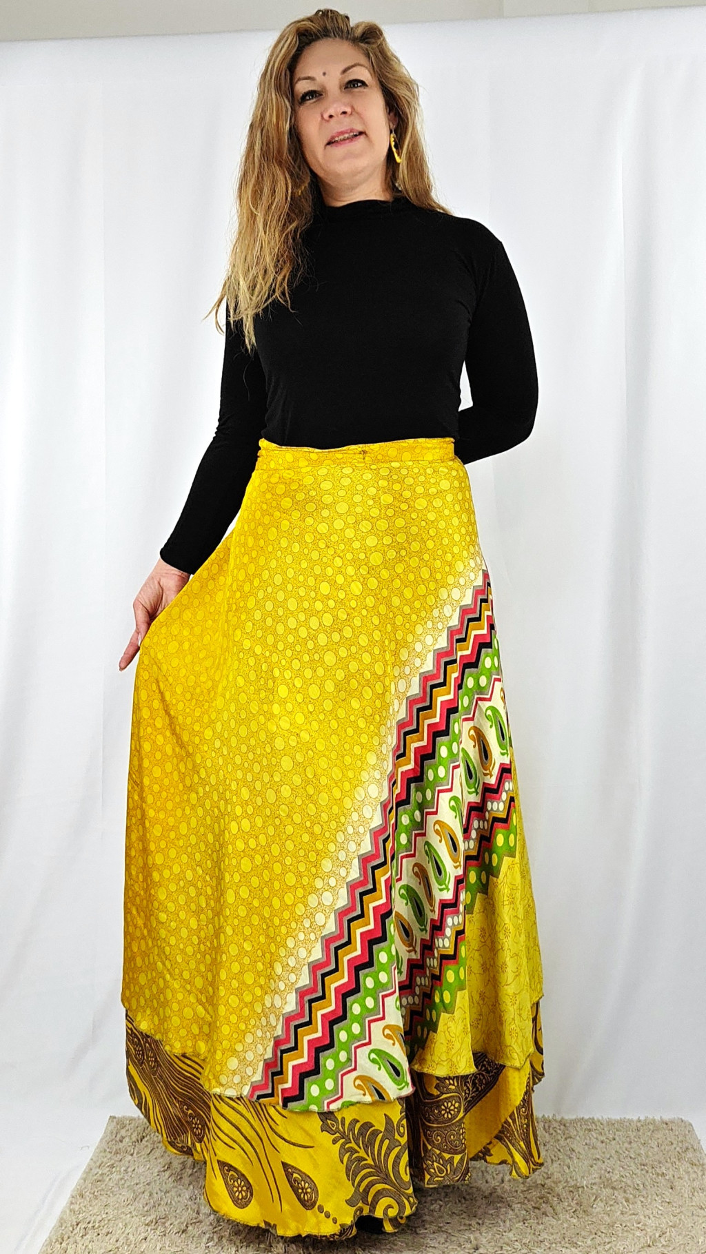 Lapszoknyáink újrahasznosított szárikból készülnek Indiában, egy hosszabb és egy rövidebb anyag derékban összevarrva! Két oldalú, kifordítható, mindkét oldala hordható, sokféleképpen köthető, variálható. Szoknyáinkból nincs két egyforma, mindegyikből csak EGY darab van, ha megtetszik, csapj le rá!