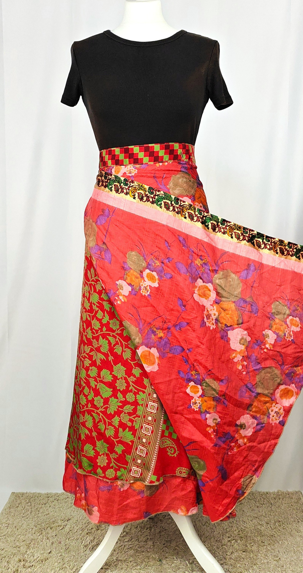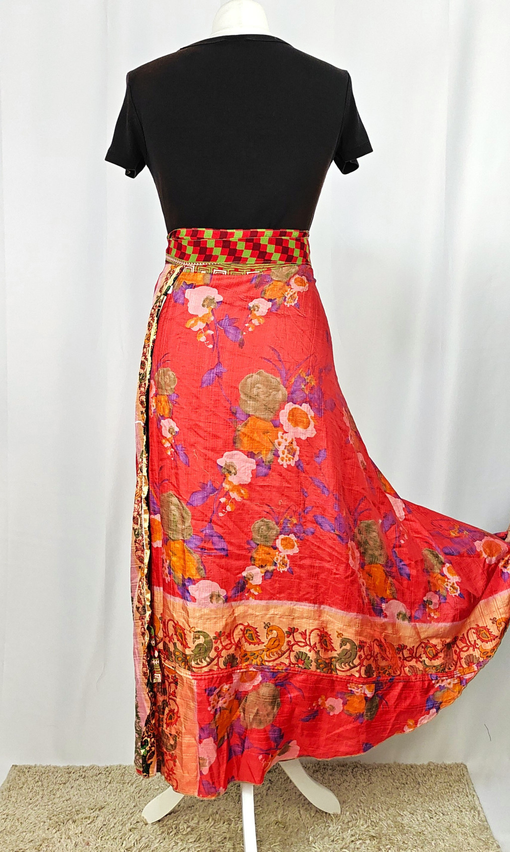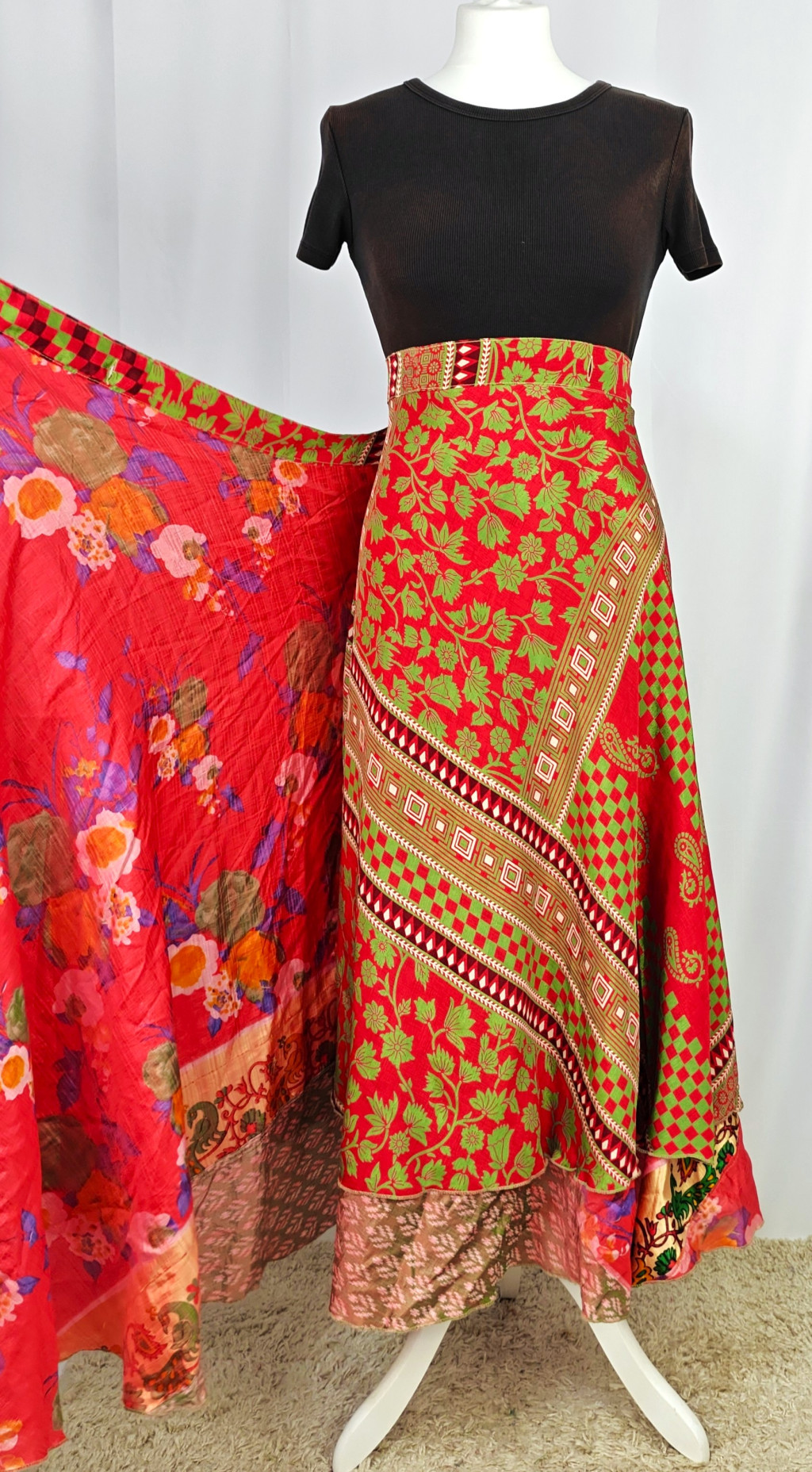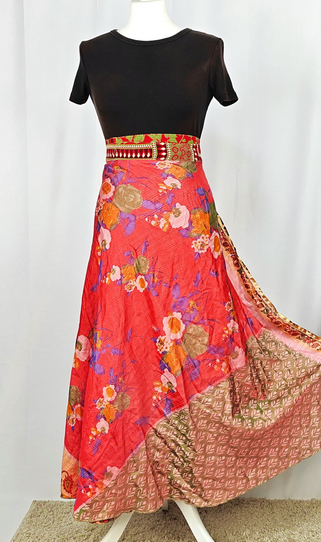 Lapszoknyáink újrahasznosított szárikból készülnek Indiában, egy hosszabb és egy rövidebb anyag derékban összevarrva! Két oldalú, kifordítható, mindkét oldala hordható, sokféleképpen köthető, variálható. Szoknyáinkból nincs két egyforma, mindegyikből csak EGY darab van, ha megtetszik, csapj le rá!
