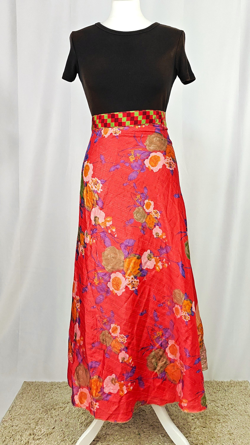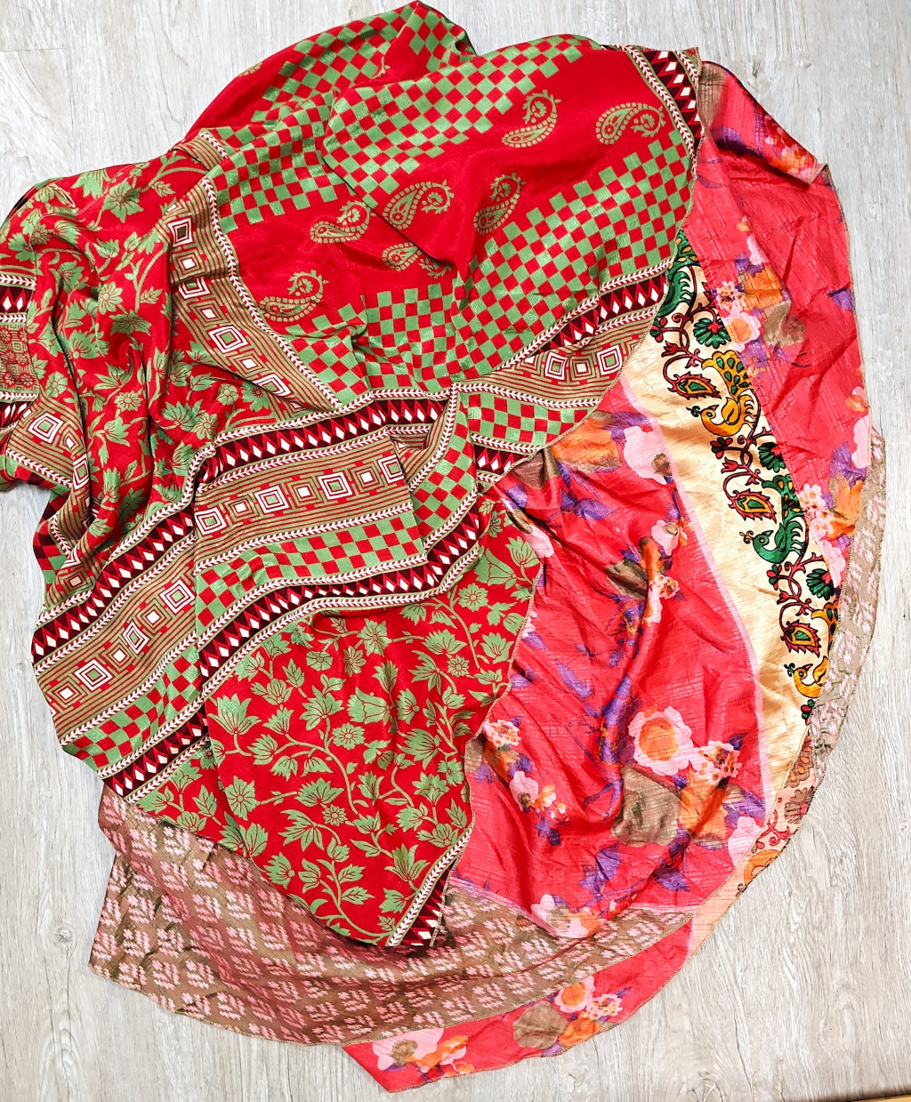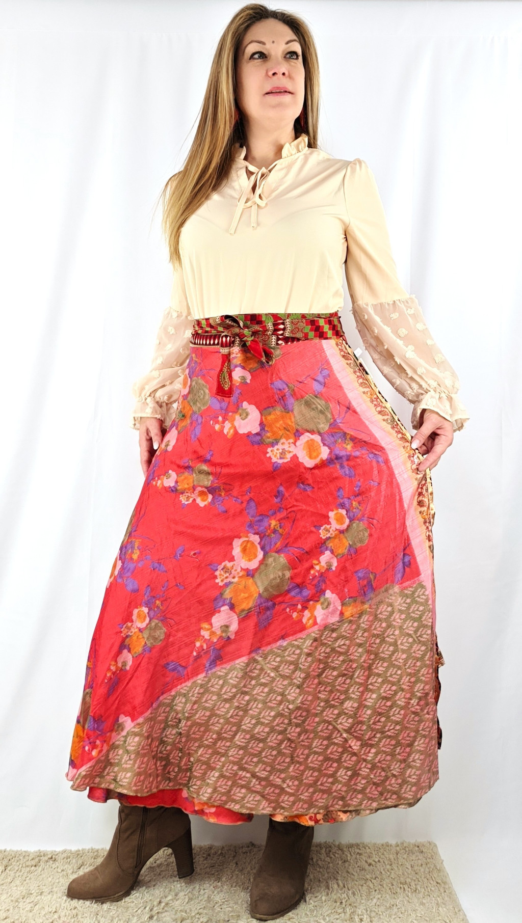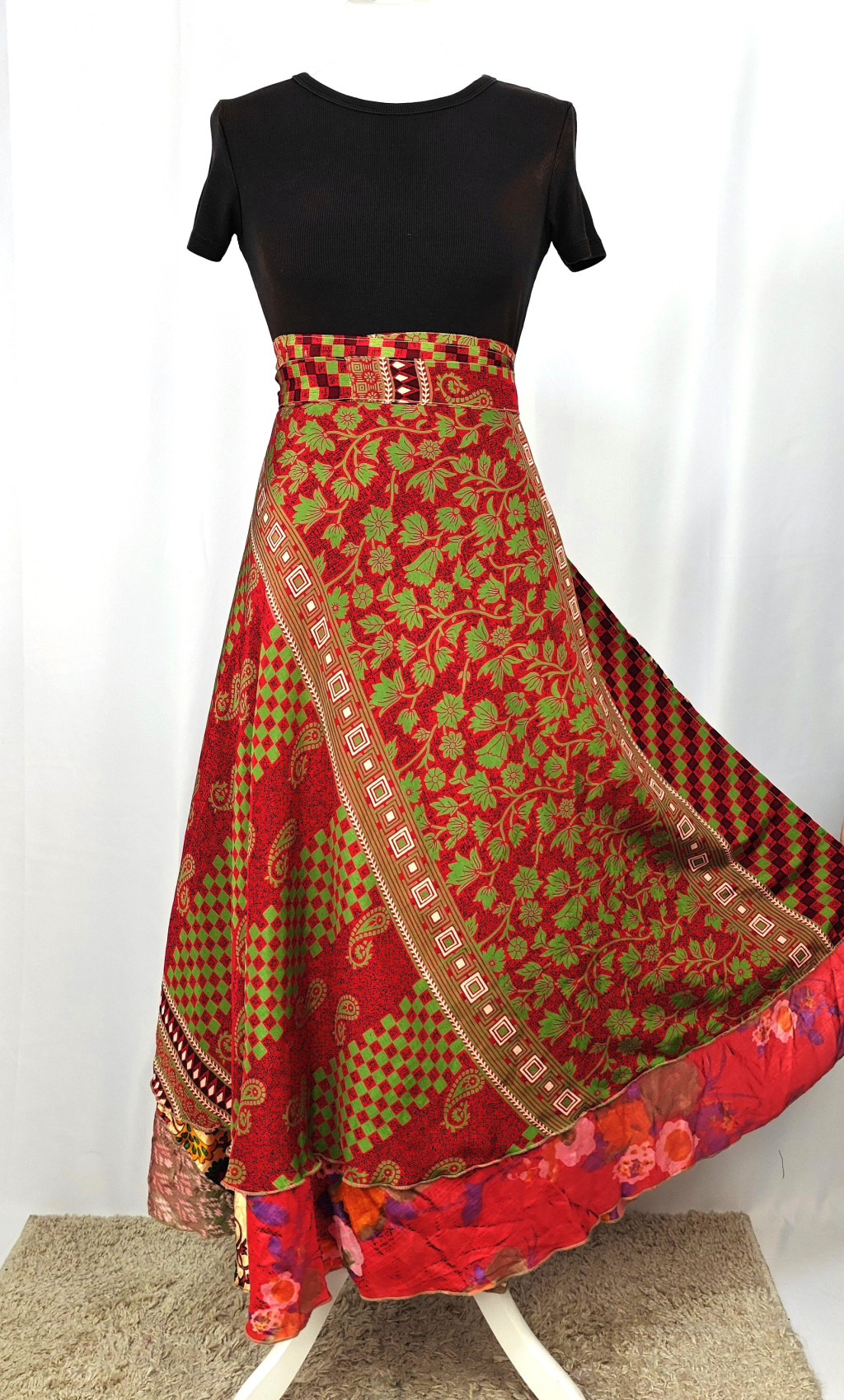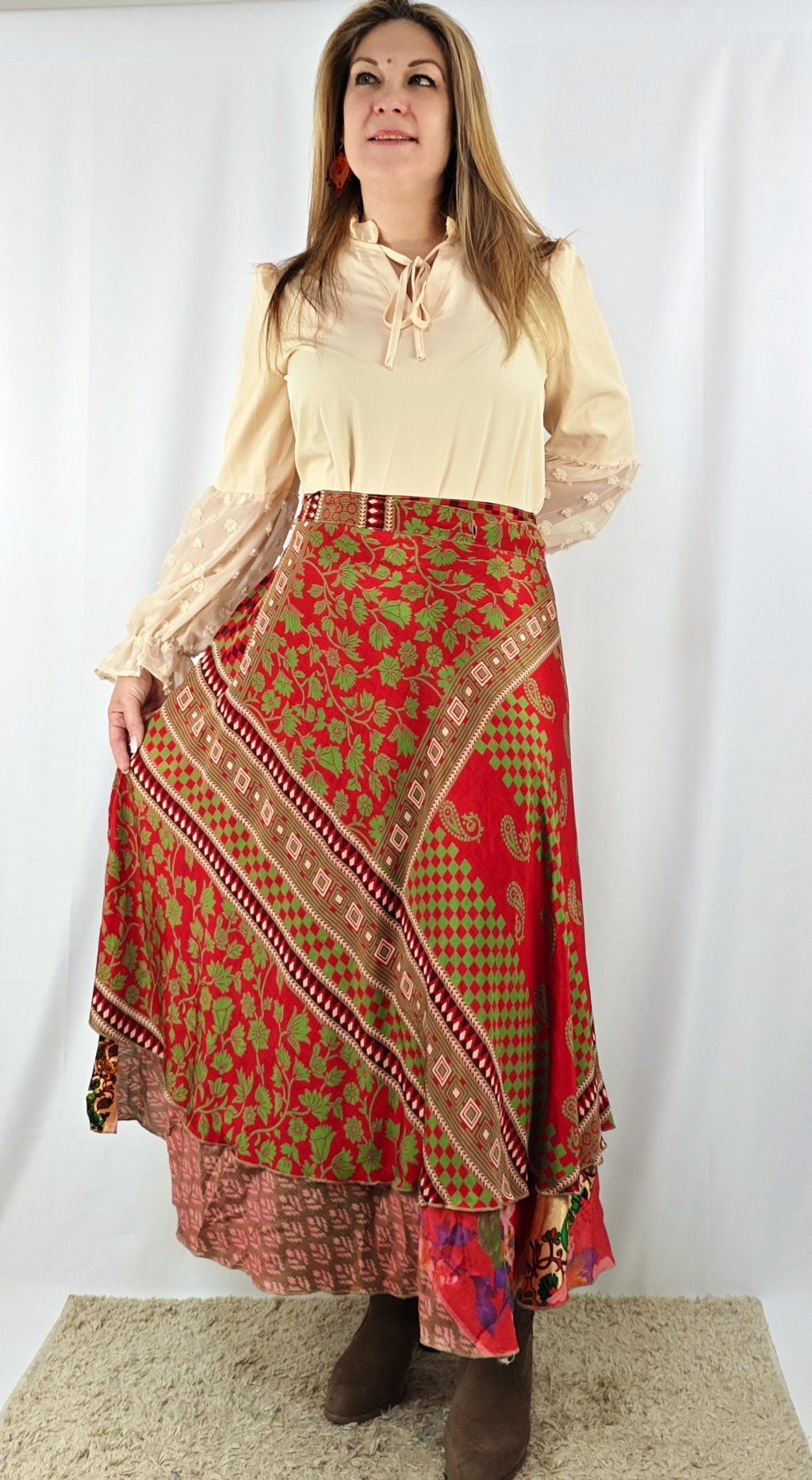 Lapszoknyáink újrahasznosított szárikból készülnek Indiában, egy hosszabb és egy rövidebb anyag derékban összevarrva! Két oldalú, kifordítható, mindkét oldala hordható, sokféleképpen köthető, variálható. Szoknyáinkból nincs két egyforma, mindegyikből csak EGY darab van, ha megtetszik, csapj le rá!