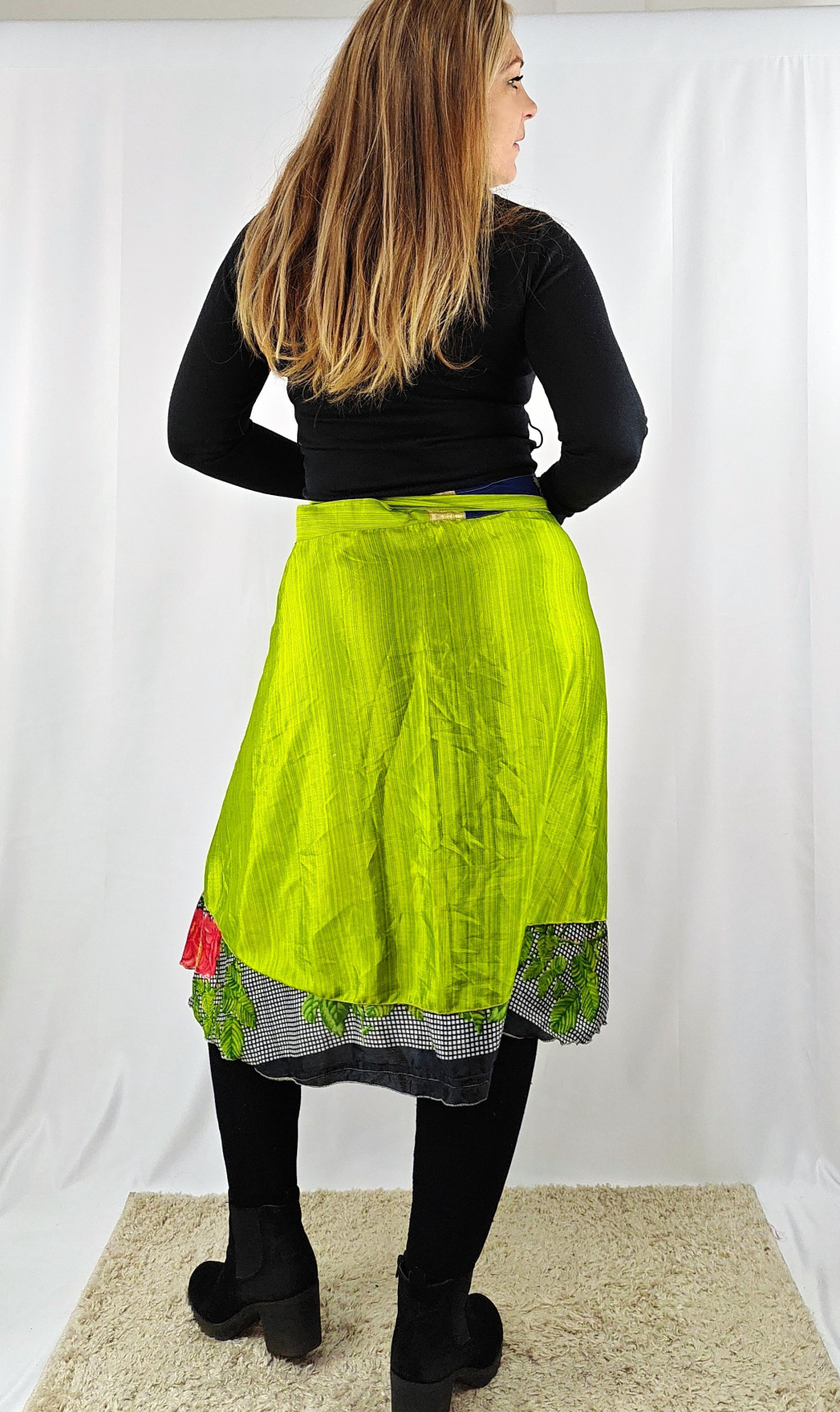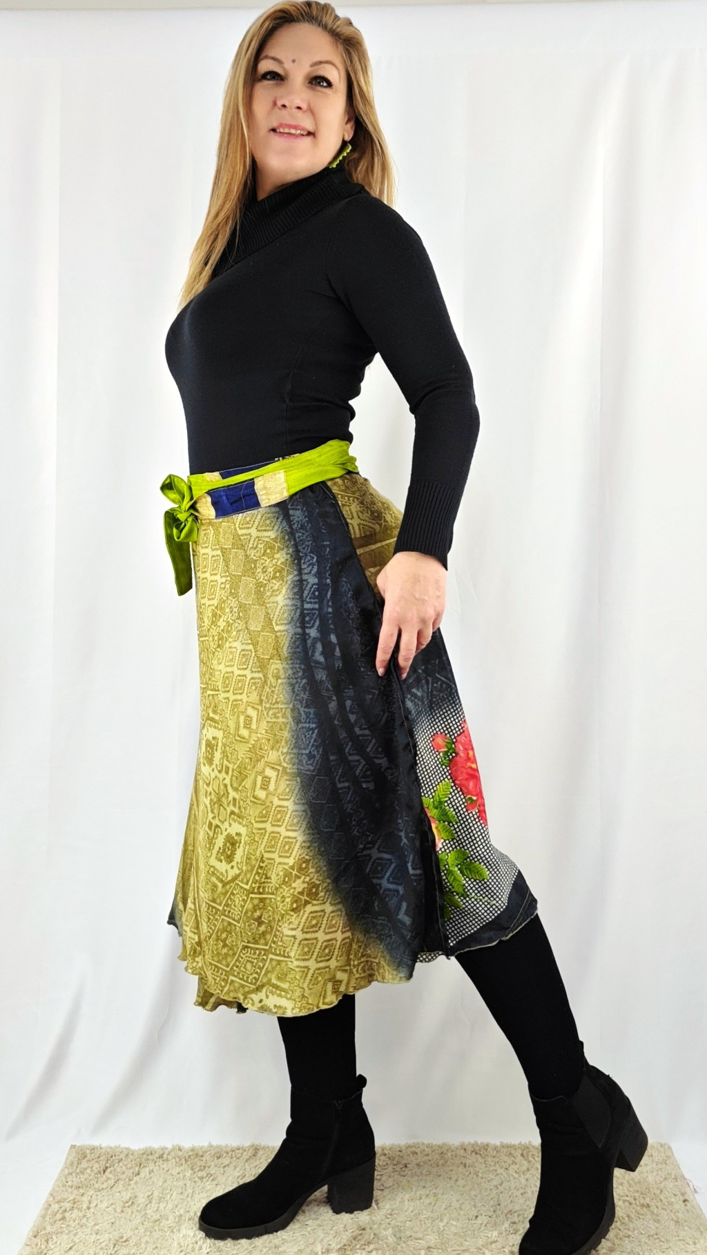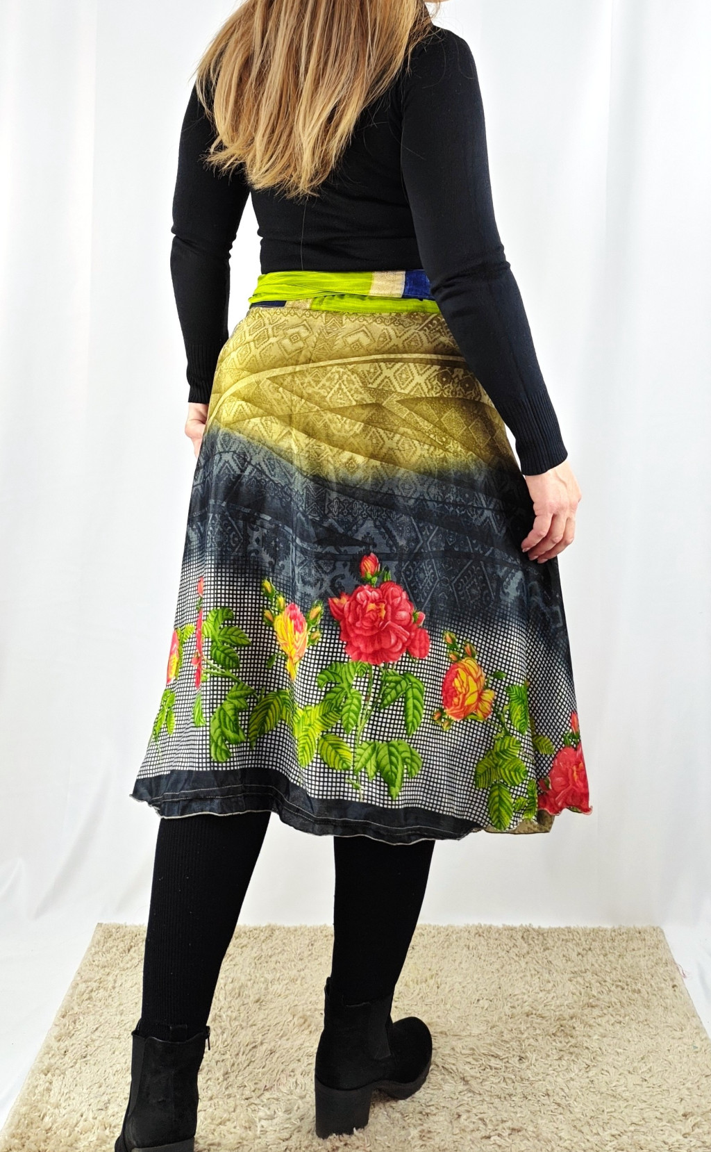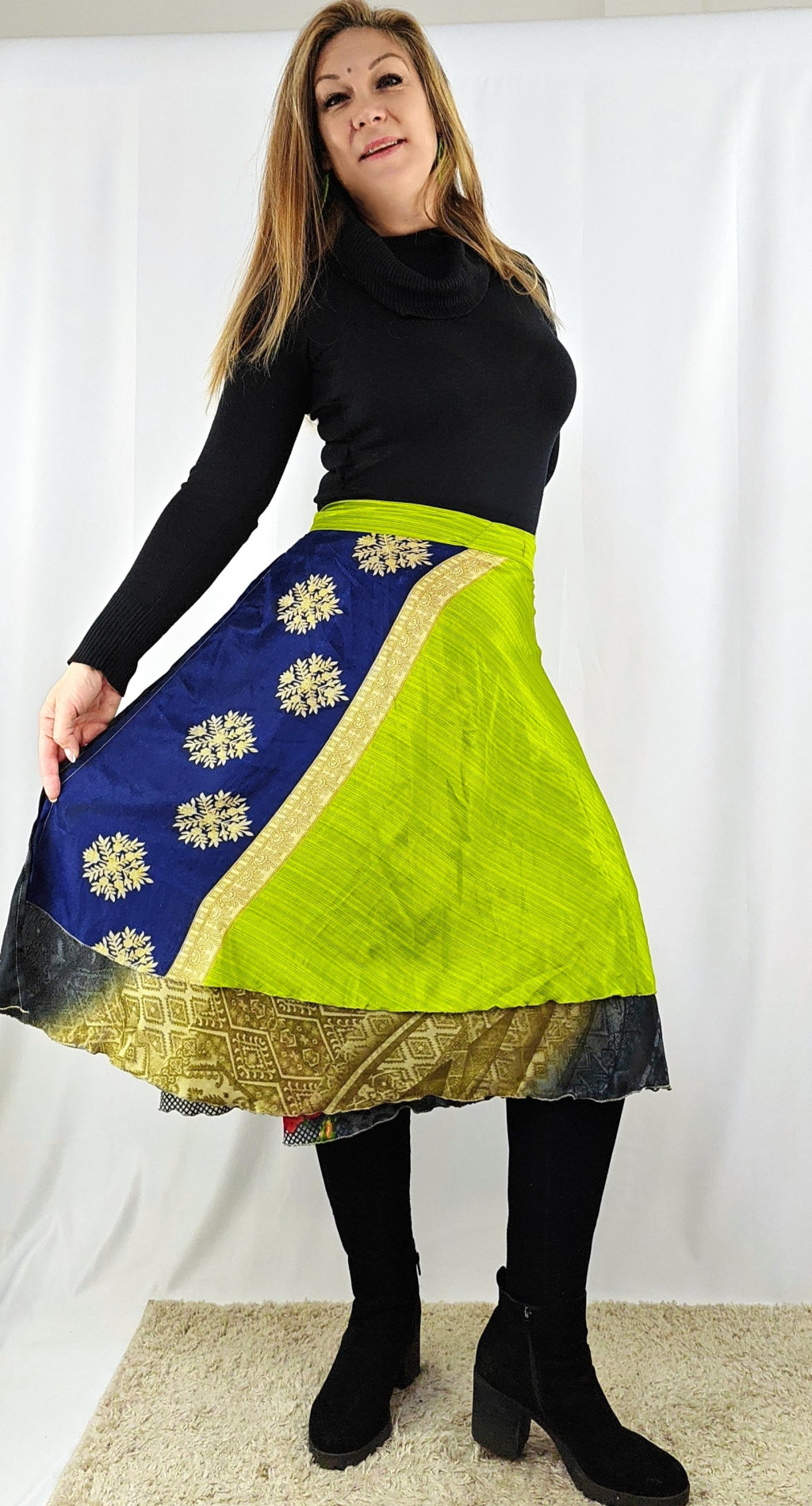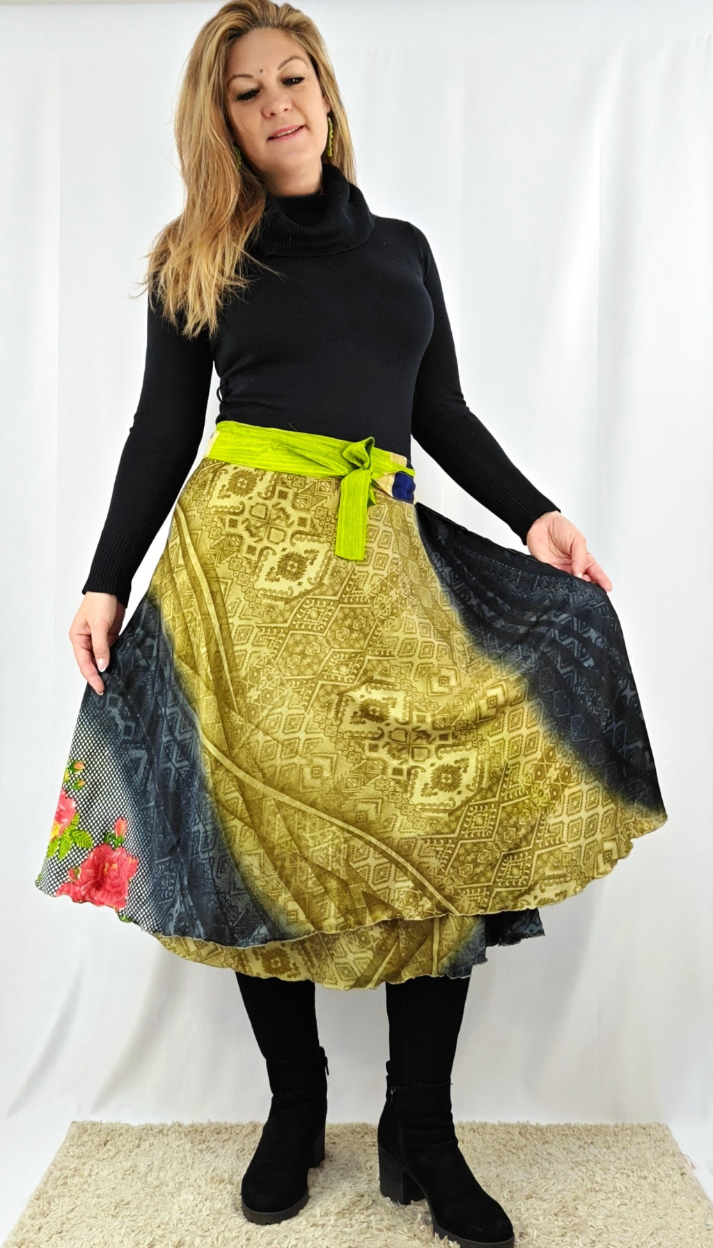 Lapszoknyáink újrahasznosított szárikból készülnek Indiában, egy hosszabb és egy rövidebb anyag derékban összevarrva! Két oldalú, kifordítható, mindkét oldala hordható, sokféleképpen köthető, variálható. Szoknyáinkból nincs két egyforma, mindegyikből csak EGY darab van, ha megtetszik, csapj le rá!