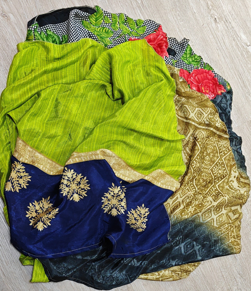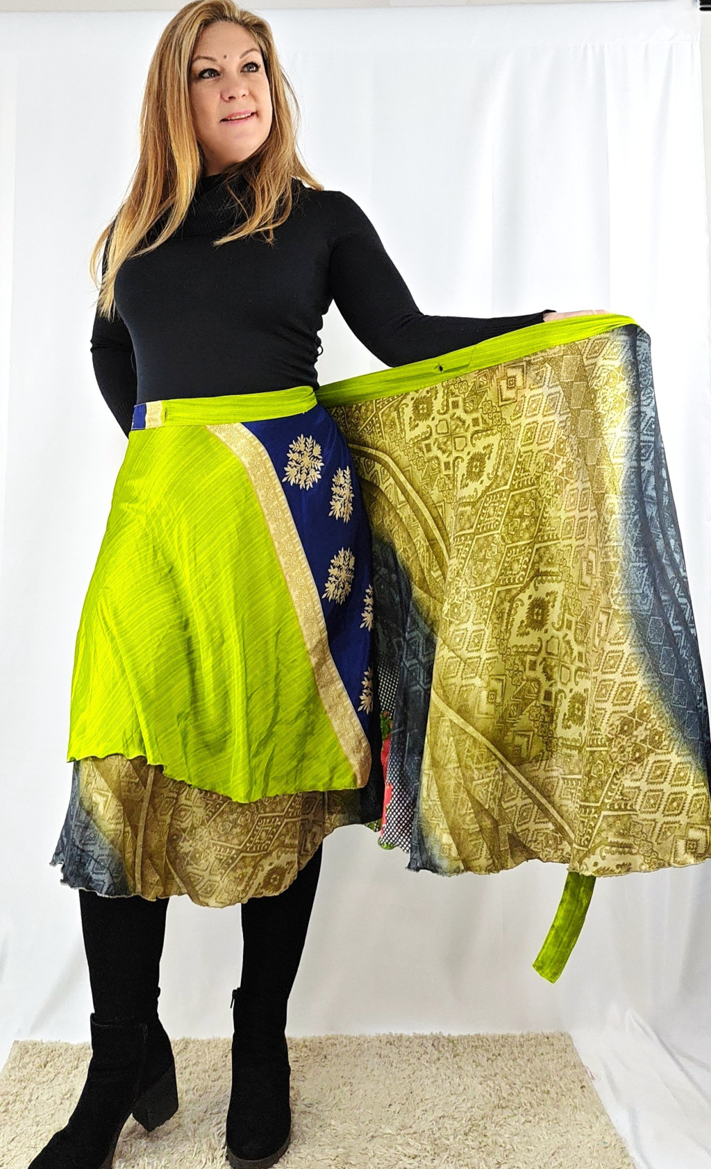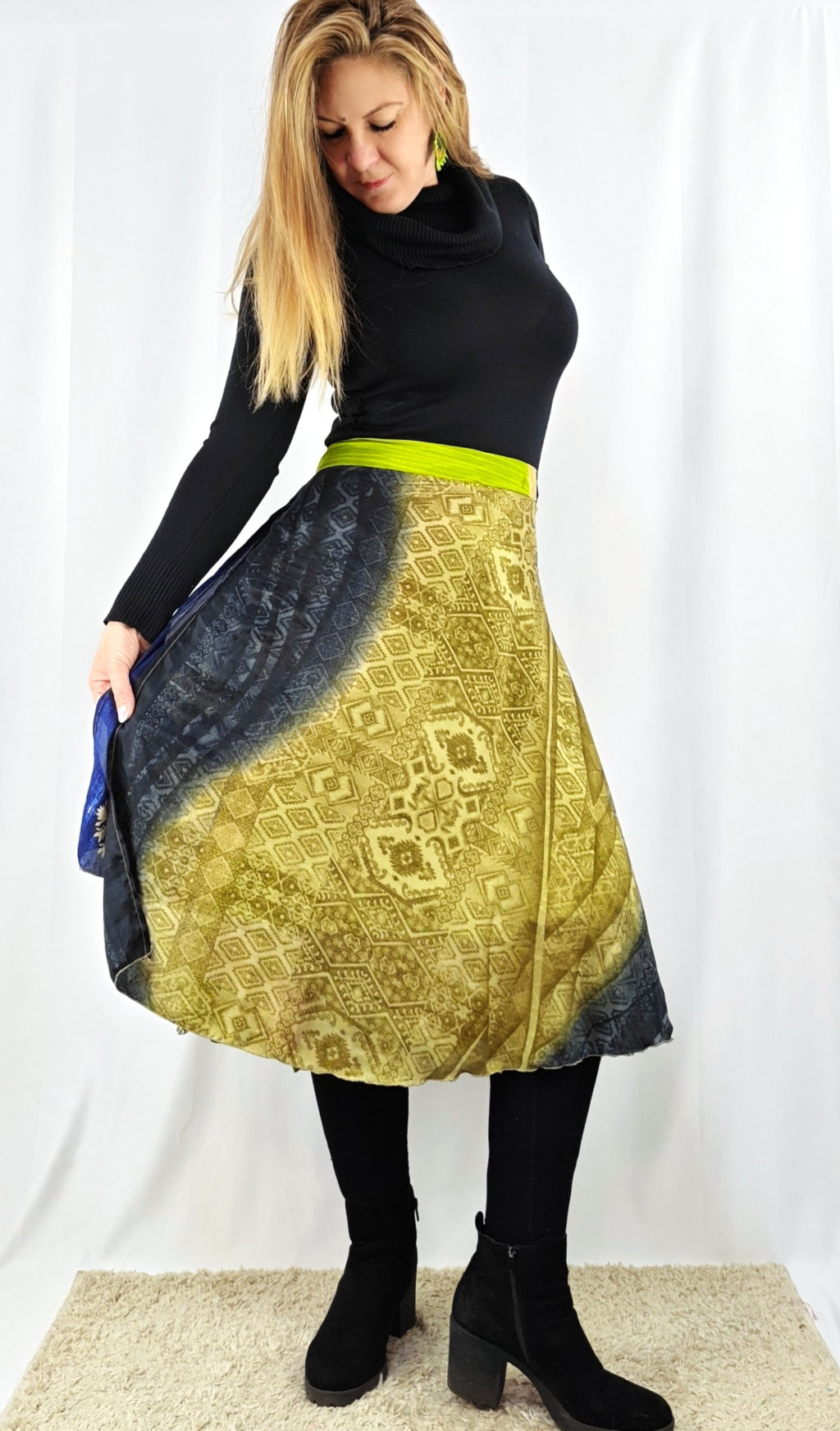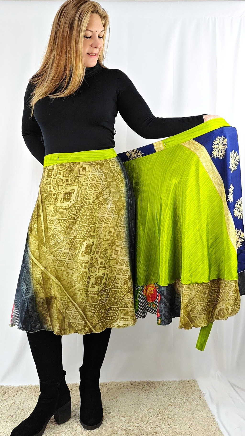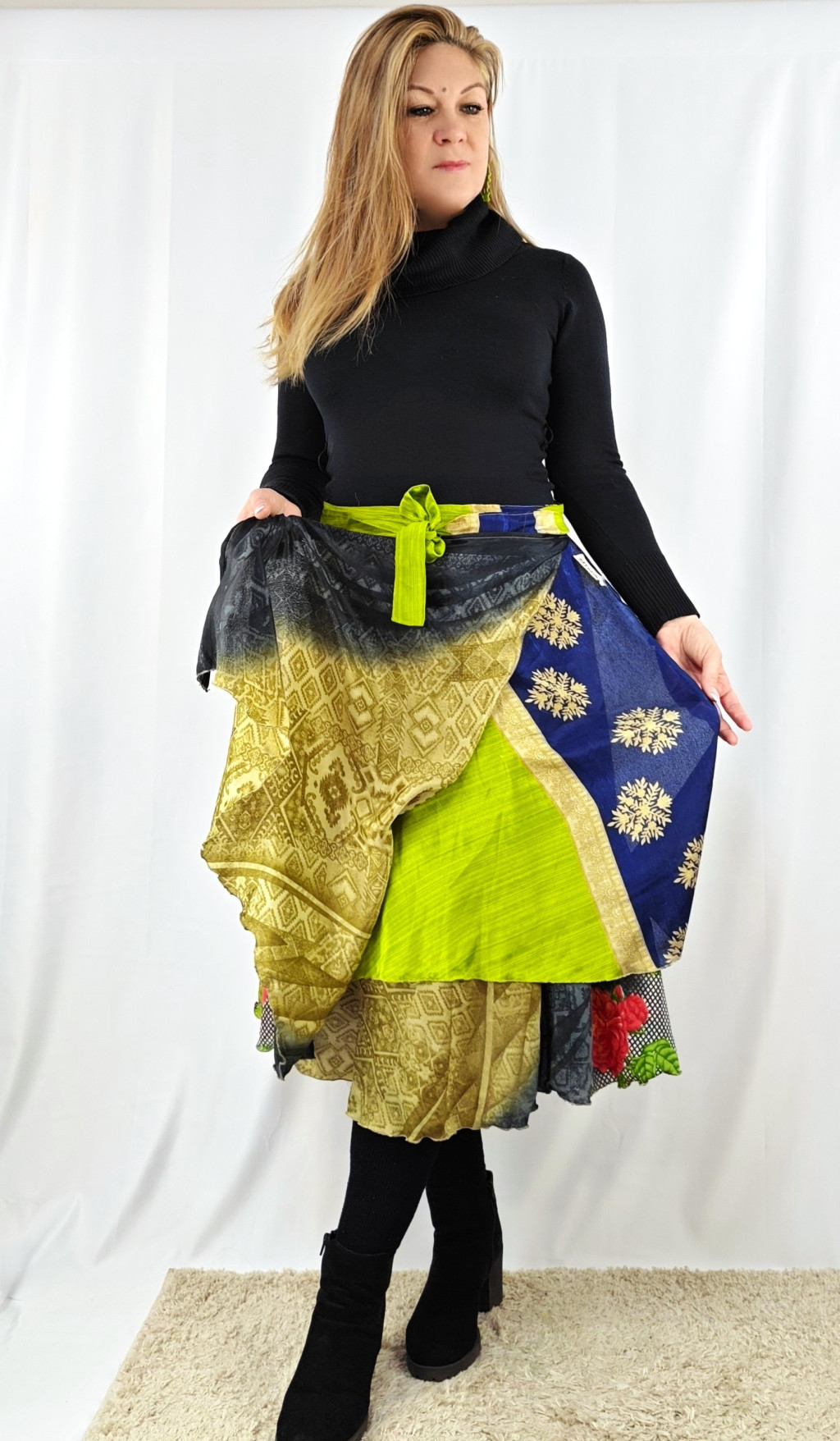 Lapszoknyáink újrahasznosított szárikból készülnek Indiában, egy hosszabb és egy rövidebb anyag derékban összevarrva! Két oldalú, kifordítható, mindkét oldala hordható, sokféleképpen köthető, variálható. Szoknyáinkból nincs két egyforma, mindegyikből csak EGY darab van, ha megtetszik, csapj le rá!