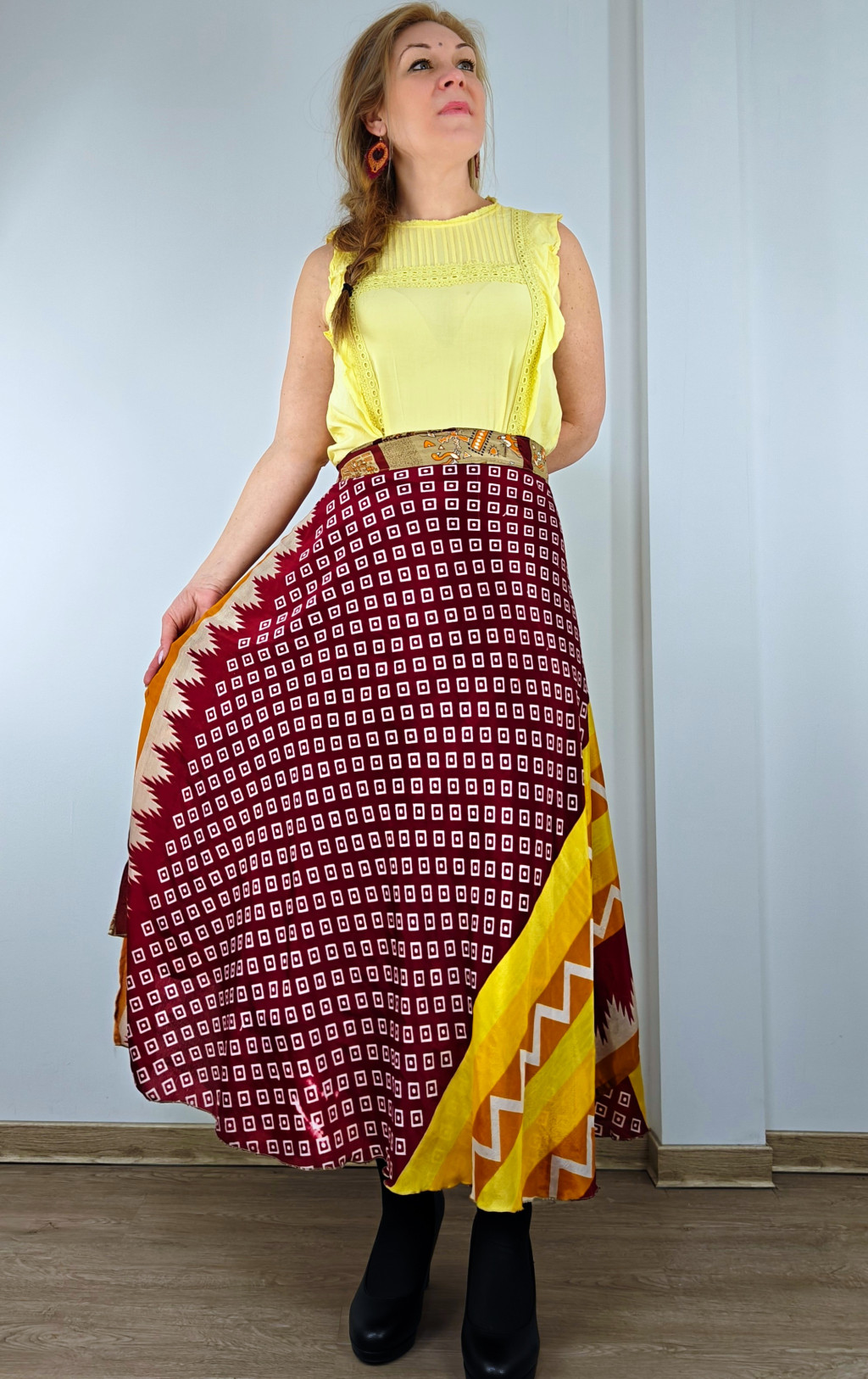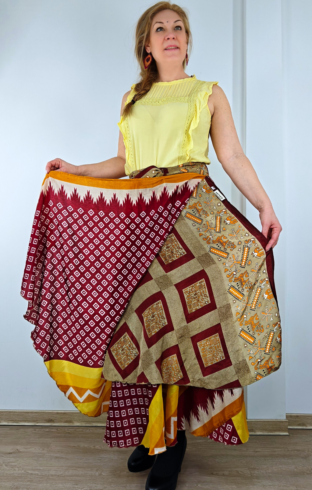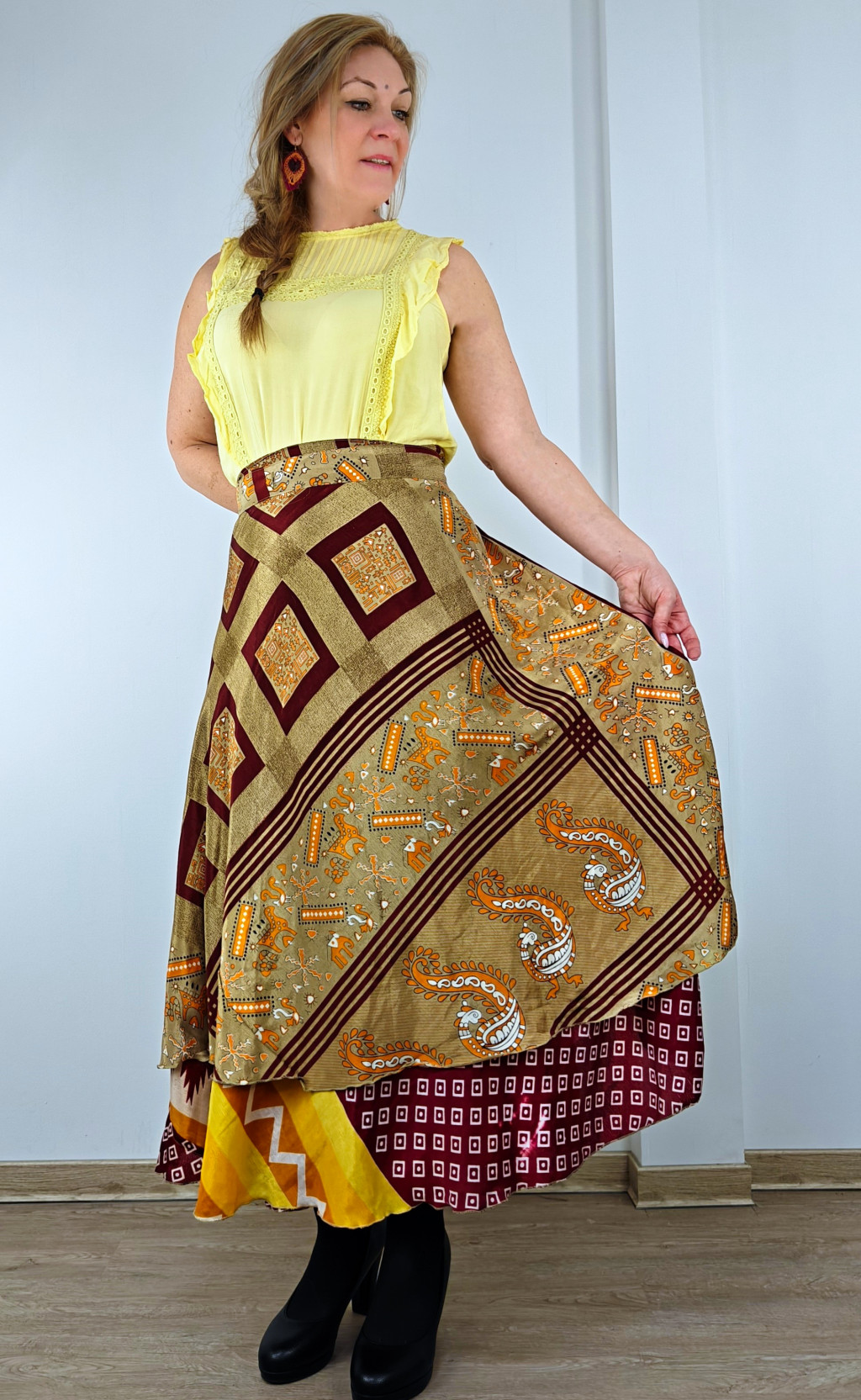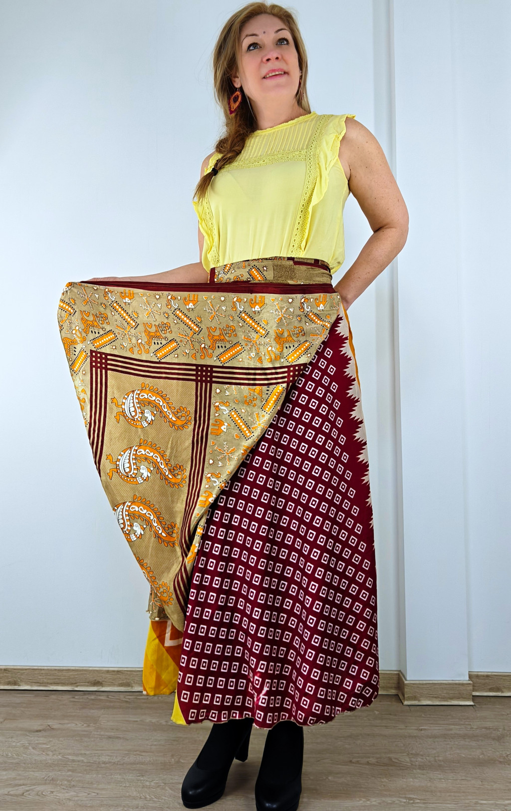 Lapszoknyáink újrahasznosított szárikból készülnek Indiában, egy hosszabb és egy rövidebb anyag derékban összevarrva! Két oldalú, kifordítható, mindkét oldala hordható, sokféleképpen köthető, variálható. Szoknyáinkból nincs két egyforma, mindegyikből csak EGY darab van, ha megtetszik, csapj le rá!