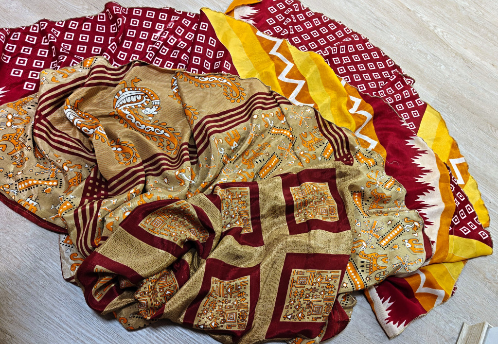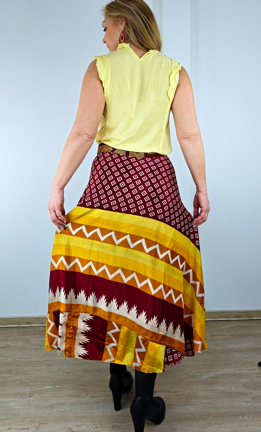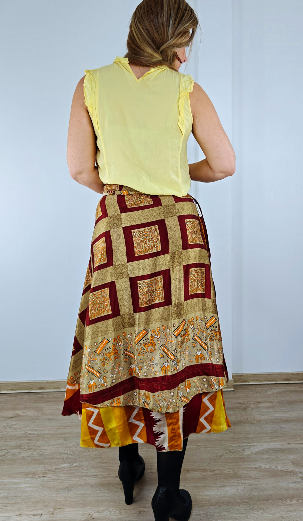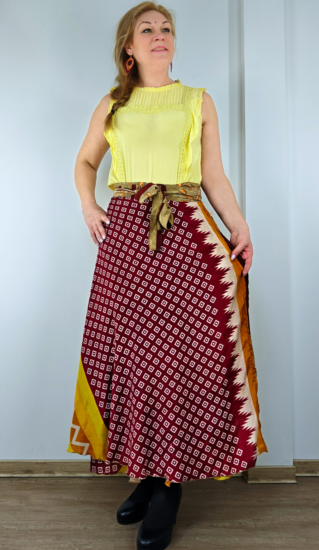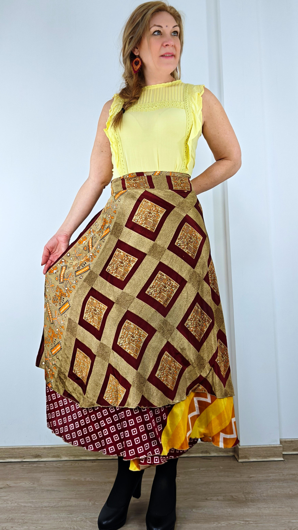 Lapszoknyáink újrahasznosított szárikból készülnek Indiában, egy hosszabb és egy rövidebb anyag derékban összevarrva! Két oldalú, kifordítható, mindkét oldala hordható, sokféleképpen köthető, variálható. Szoknyáinkból nincs két egyforma, mindegyikből csak EGY darab van, ha megtetszik, csapj le rá!
