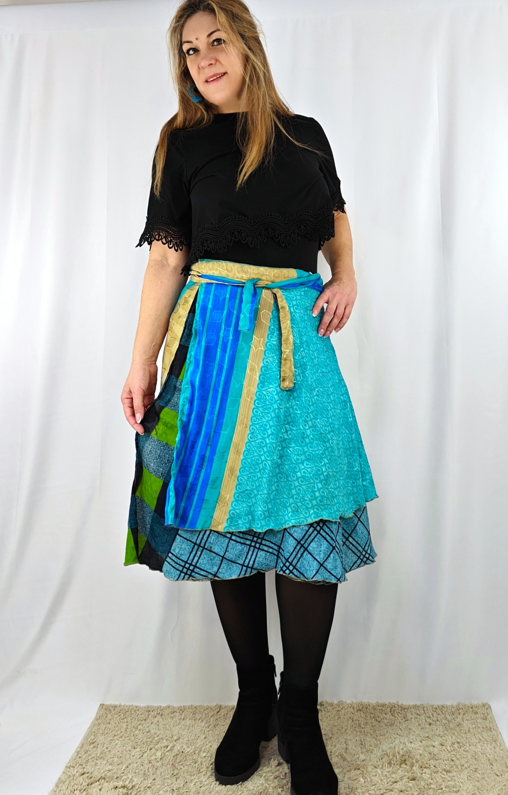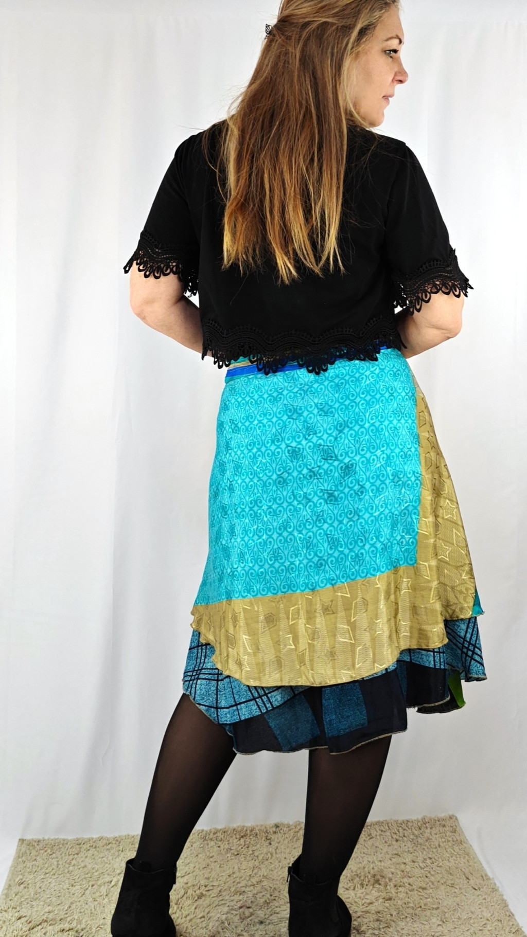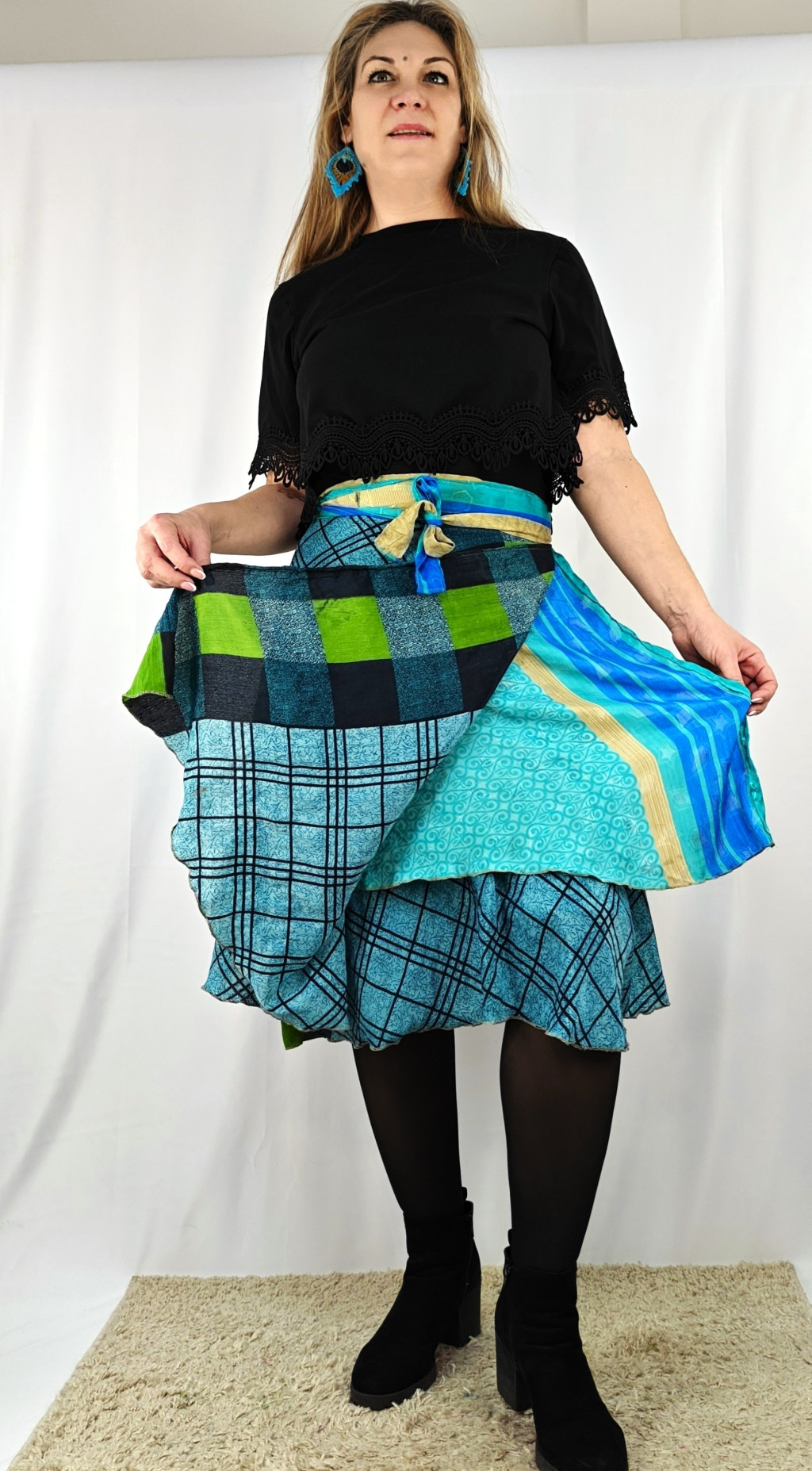 Lapszoknyáink újrahasznosított szárikból készülnek Indiában, egy hosszabb és egy rövidebb anyag derékban összevarrva! Két oldalú, kifordítható, mindkét oldala hordható, sokféleképpen köthető, variálható. Szoknyáinkból nincs két egyforma, mindegyikből csak EGY darab van, ha megtetszik, csapj le rá!