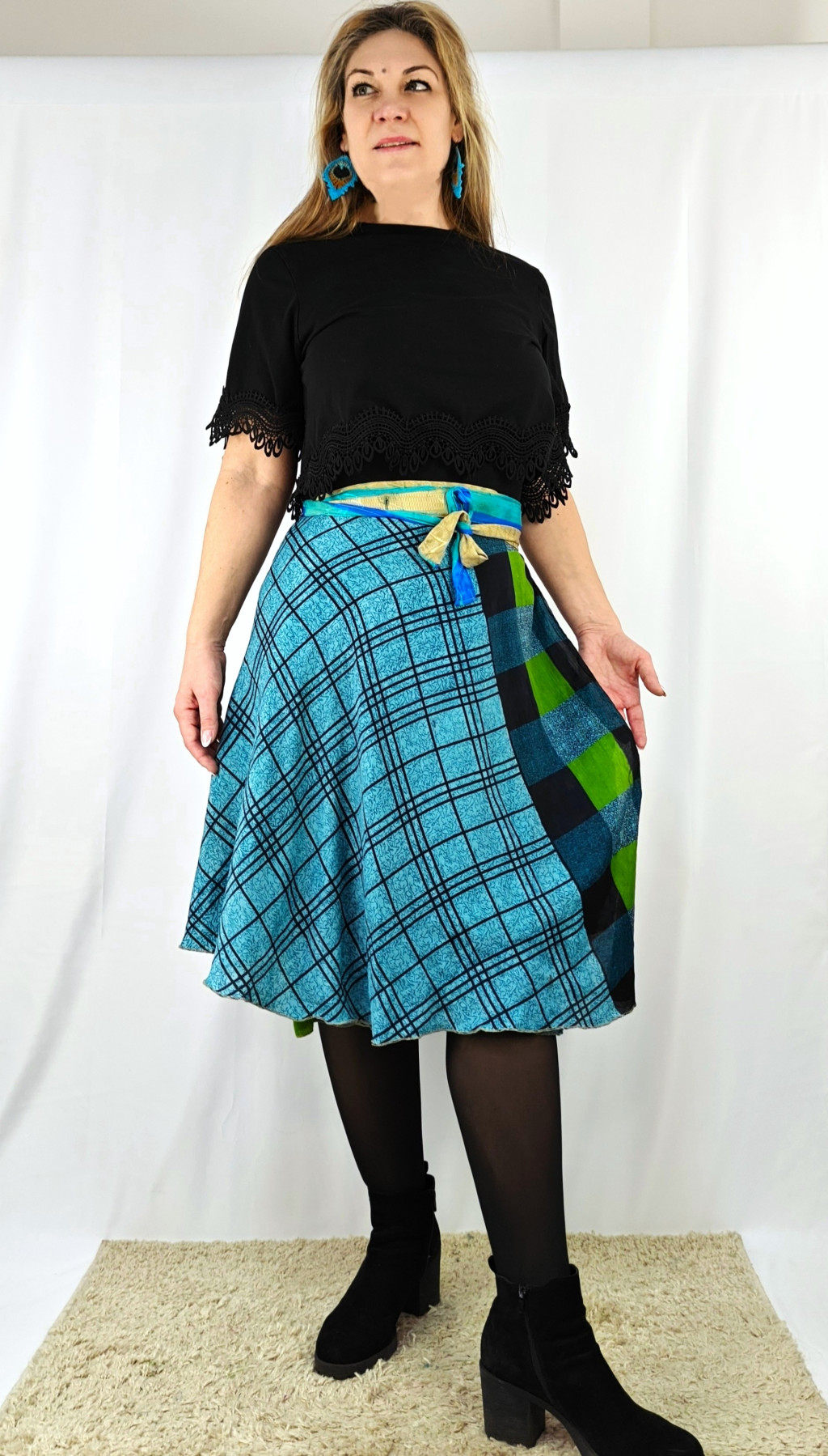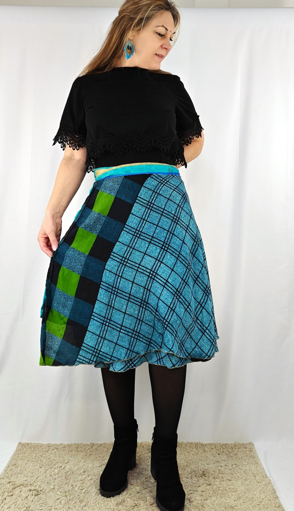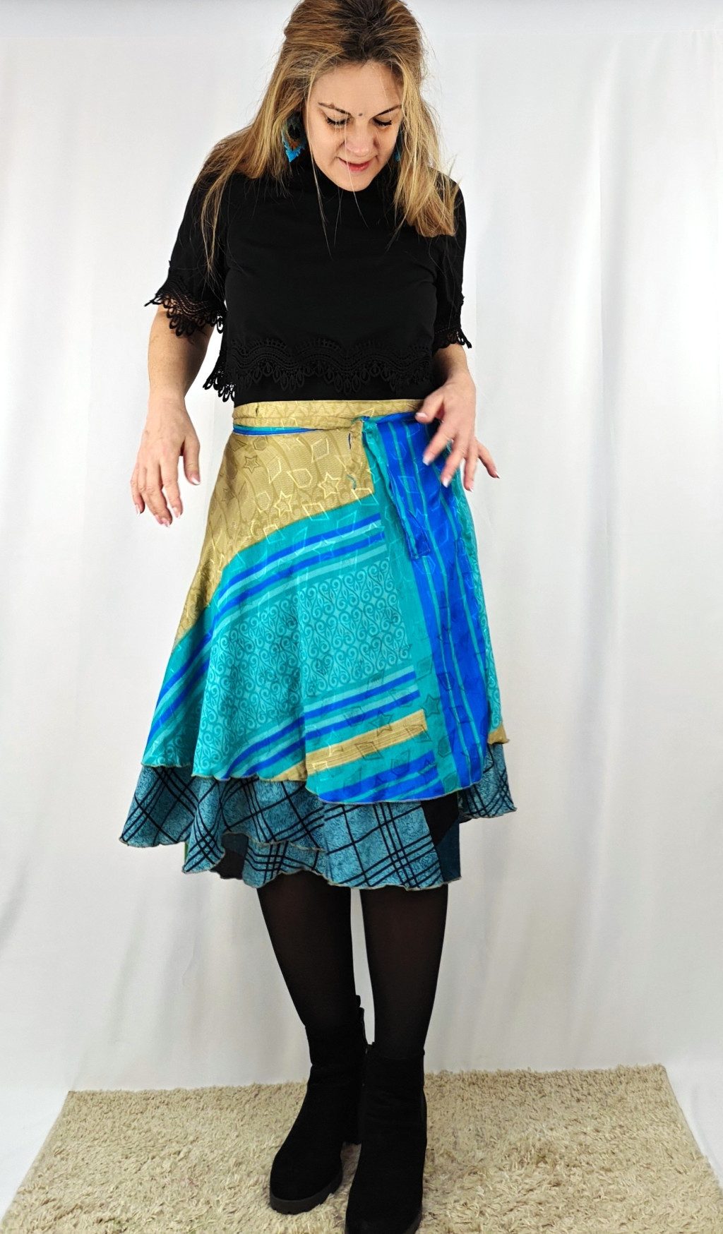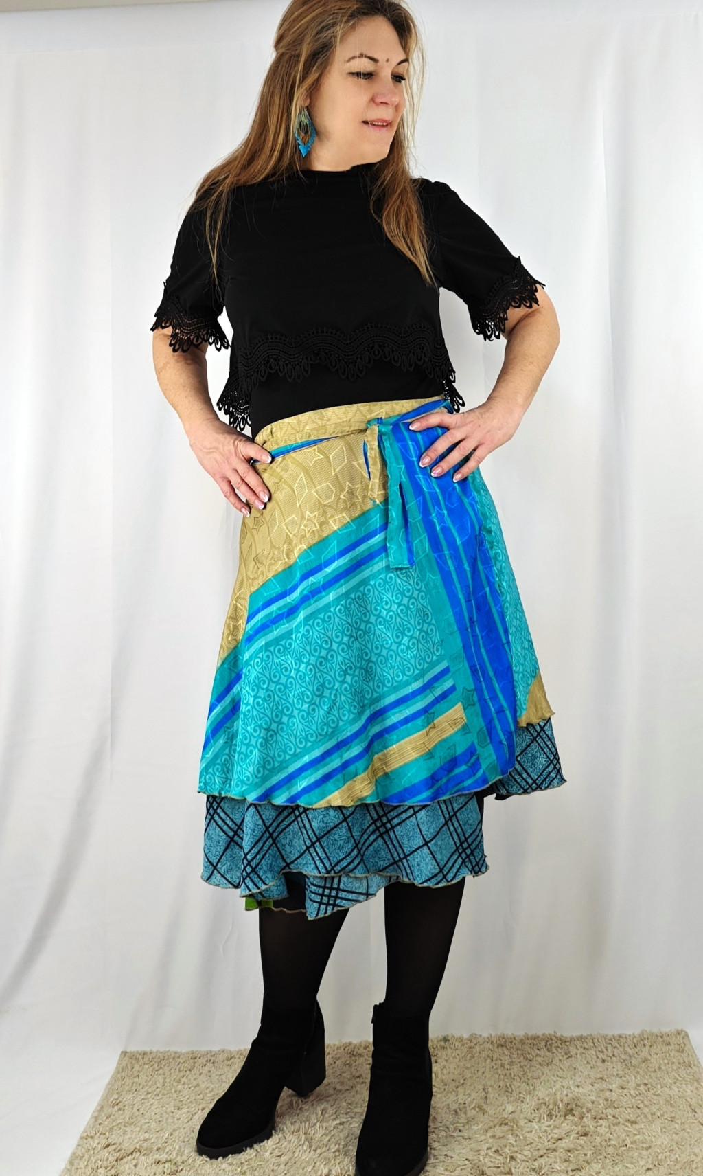 Lapszoknyáink újrahasznosított szárikból készülnek Indiában, egy hosszabb és egy rövidebb anyag derékban összevarrva! Két oldalú, kifordítható, mindkét oldala hordható, sokféleképpen köthető, variálható. Szoknyáinkból nincs két egyforma, mindegyikből csak EGY darab van, ha megtetszik, csapj le rá!