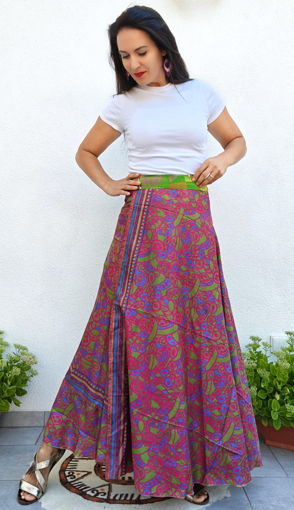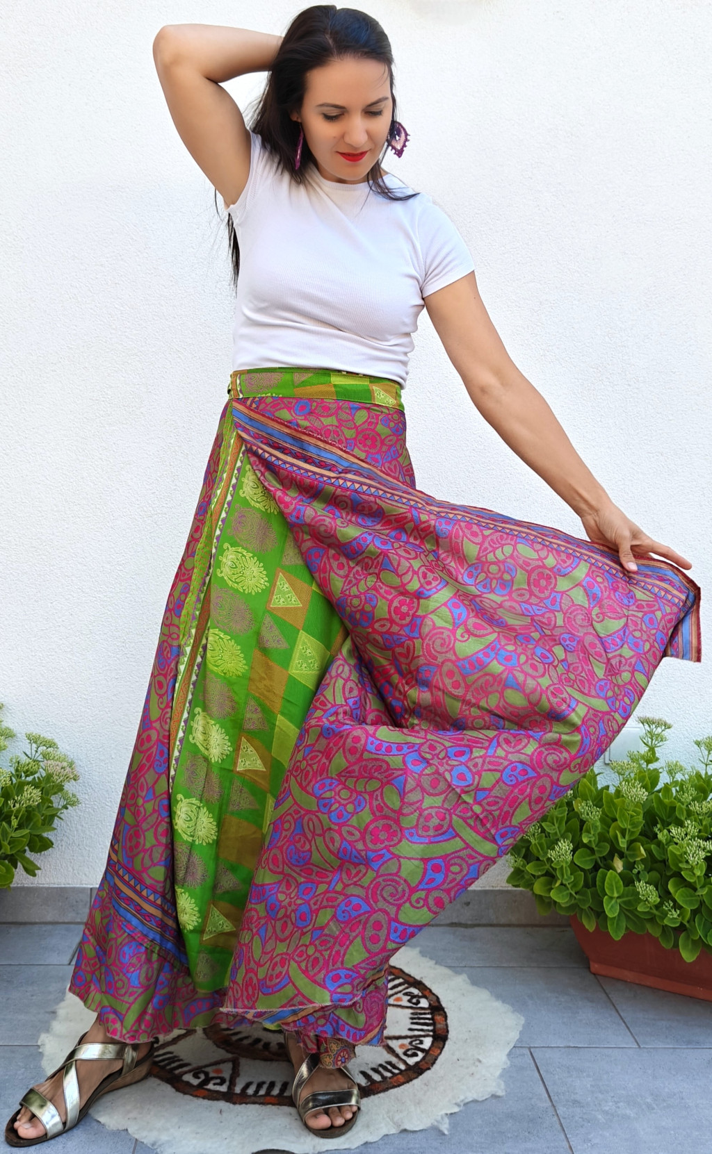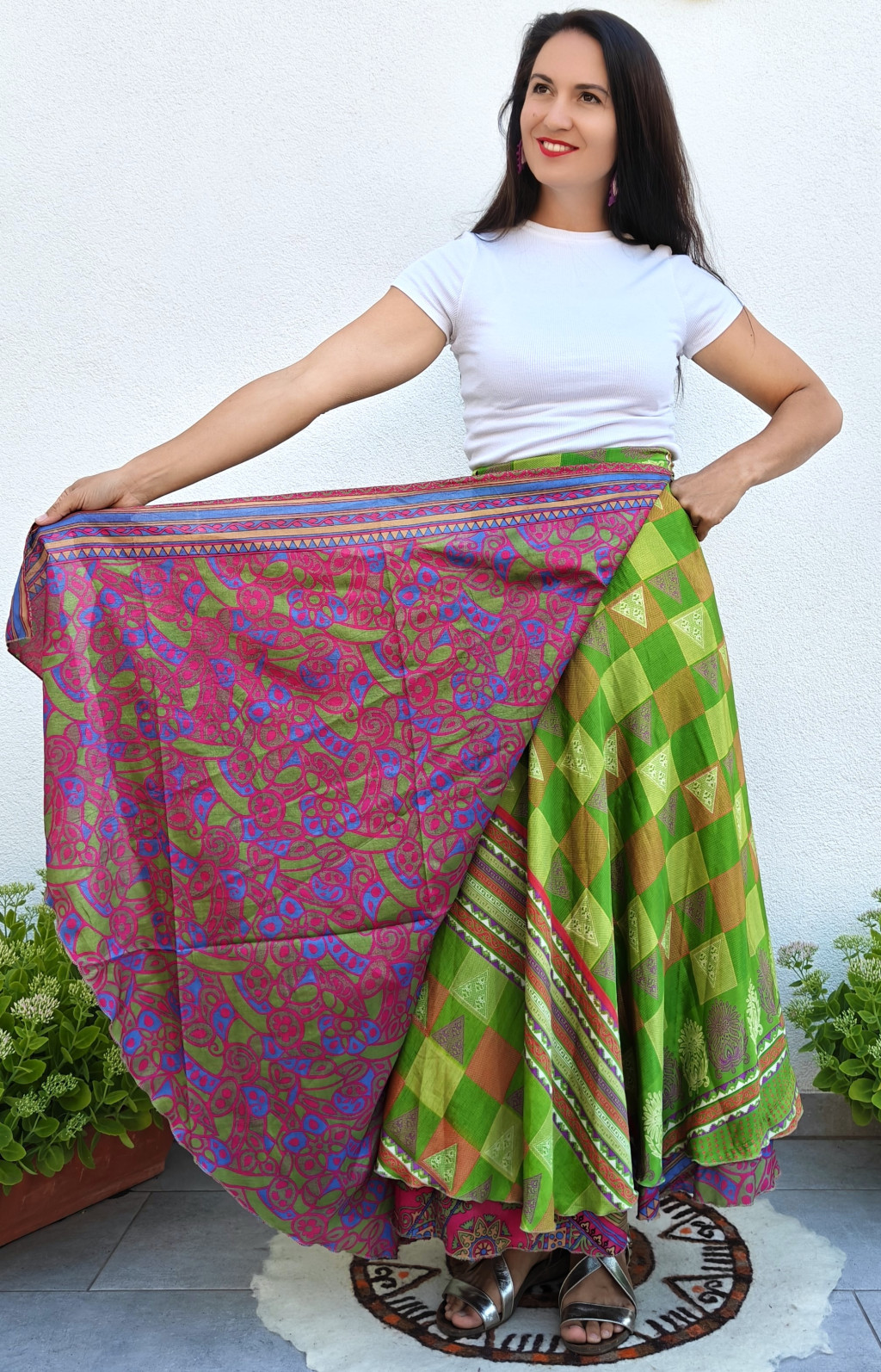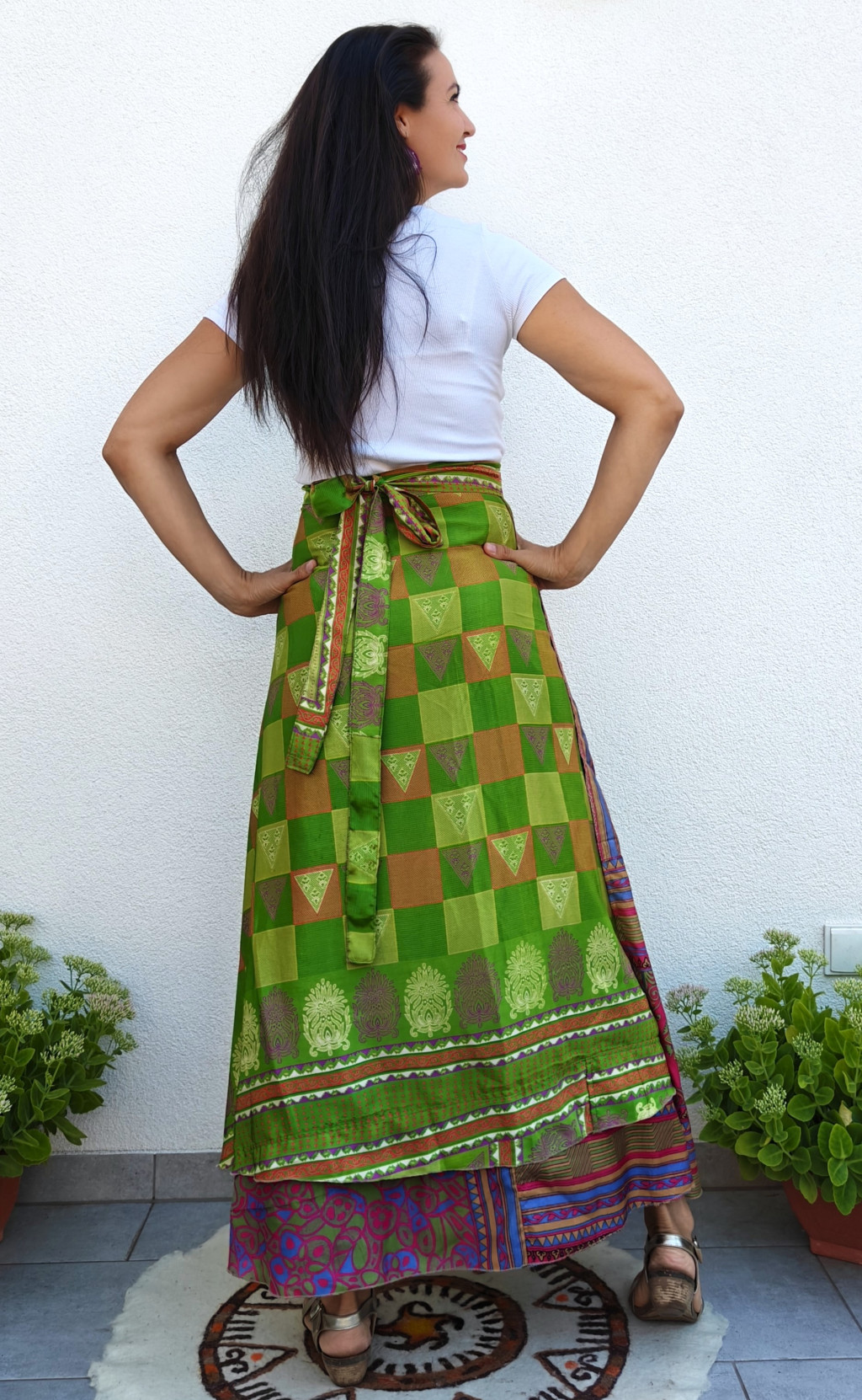 Lapszoknyáink újrahasznosított szárikból készülnek Indiában, egy hosszabb és egy rövidebb anyag derékban összevarrva! Két oldalú, kifordítható, mindkét oldala hordható, sokféleképpen köthető, variálható. Szoknyáinkból nincs két egyforma, mindegyikből csak EGY darab van, ha megtetszik, csapj le rá!