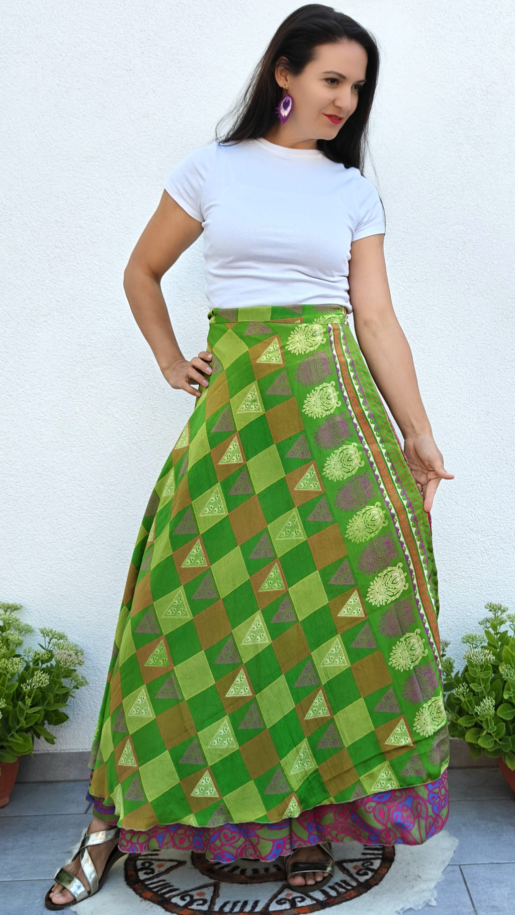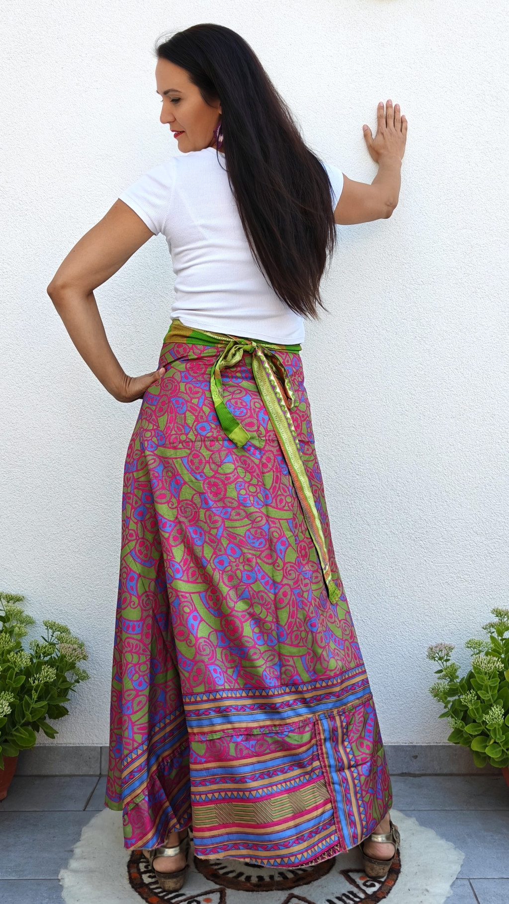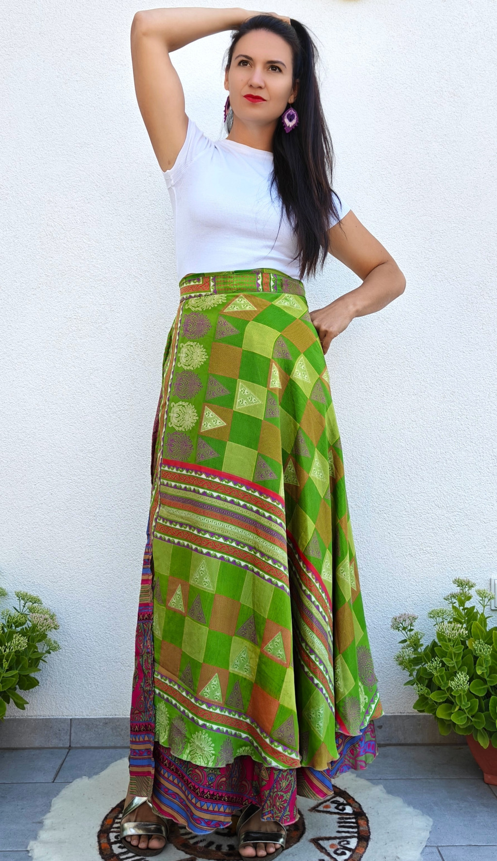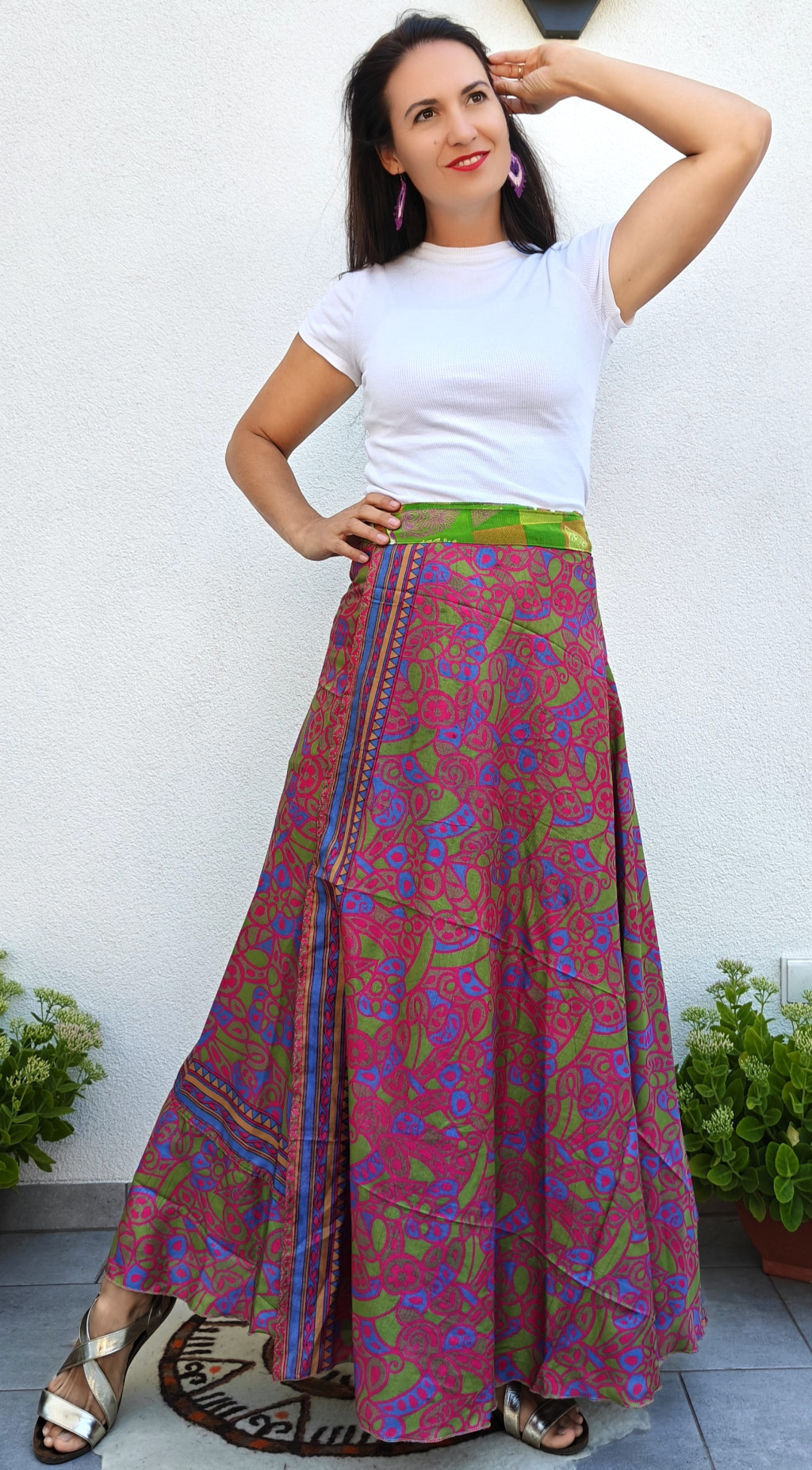 Lapszoknyáink újrahasznosított szárikból készülnek Indiában, egy hosszabb és egy rövidebb anyag derékban összevarrva! Két oldalú, kifordítható, mindkét oldala hordható, sokféleképpen köthető, variálható. Szoknyáinkból nincs két egyforma, mindegyikből csak EGY darab van, ha megtetszik, csapj le rá!