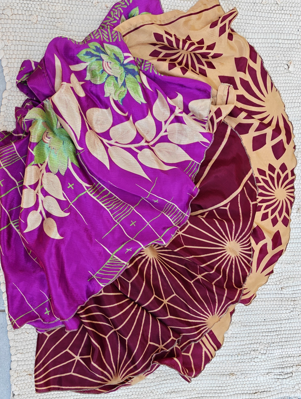 Lapszoknyáink újrahasznosított szárikból készülnek Indiában, egy hosszabb és egy rövidebb anyag derékban összevarrva! Két oldalú, kifordítható, mindkét oldala hordható, sokféleképpen köthető, variálható. Szoknyáinkból nincs két egyforma, mindegyikből csak EGY darab van, ha megtetszik, csapj le rá!