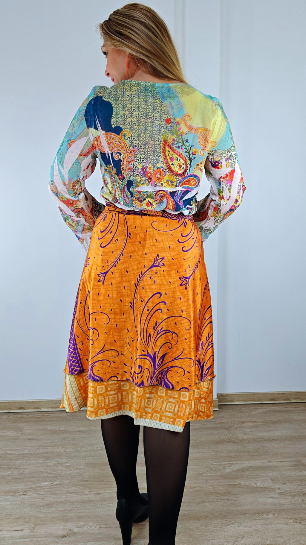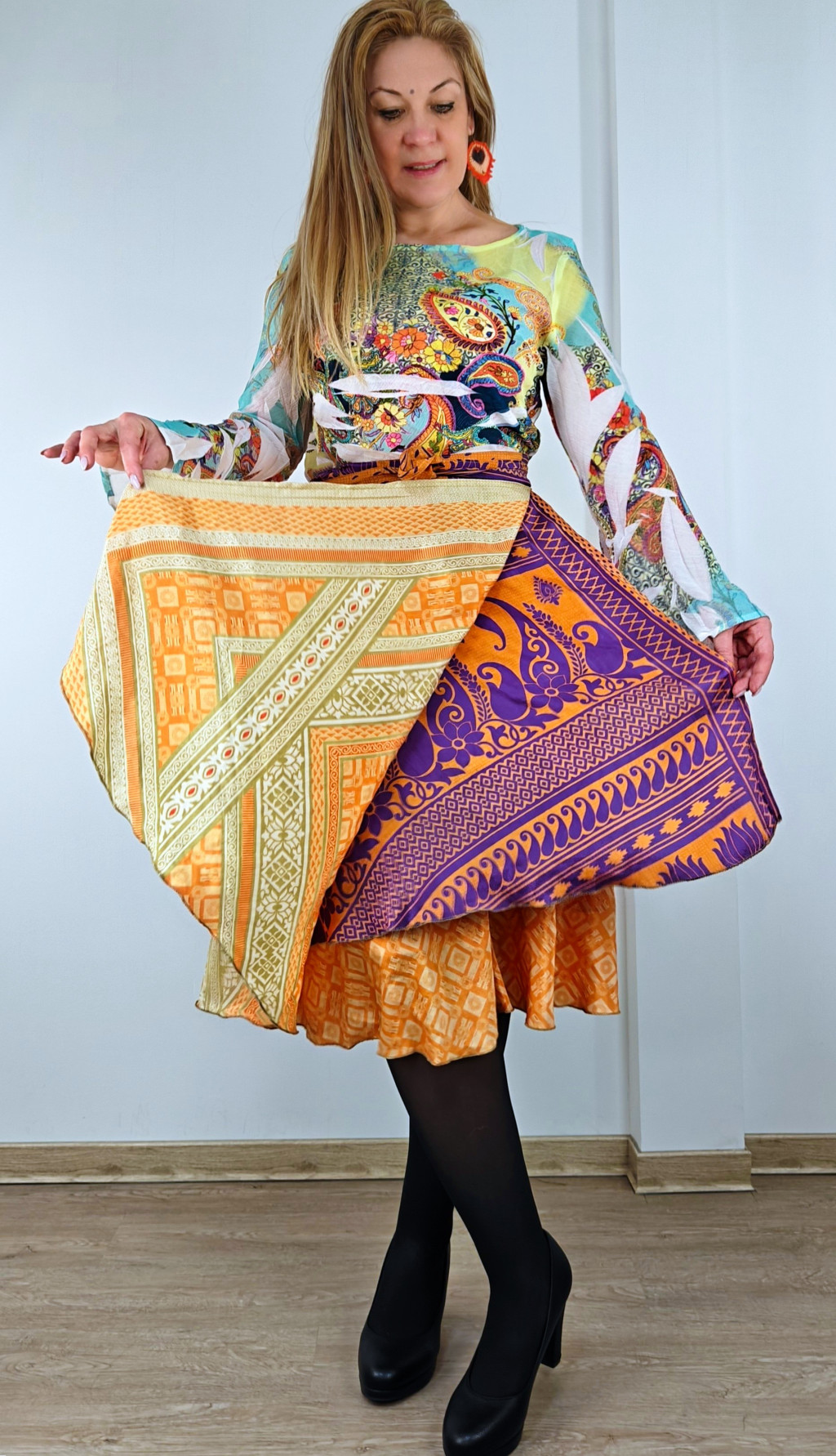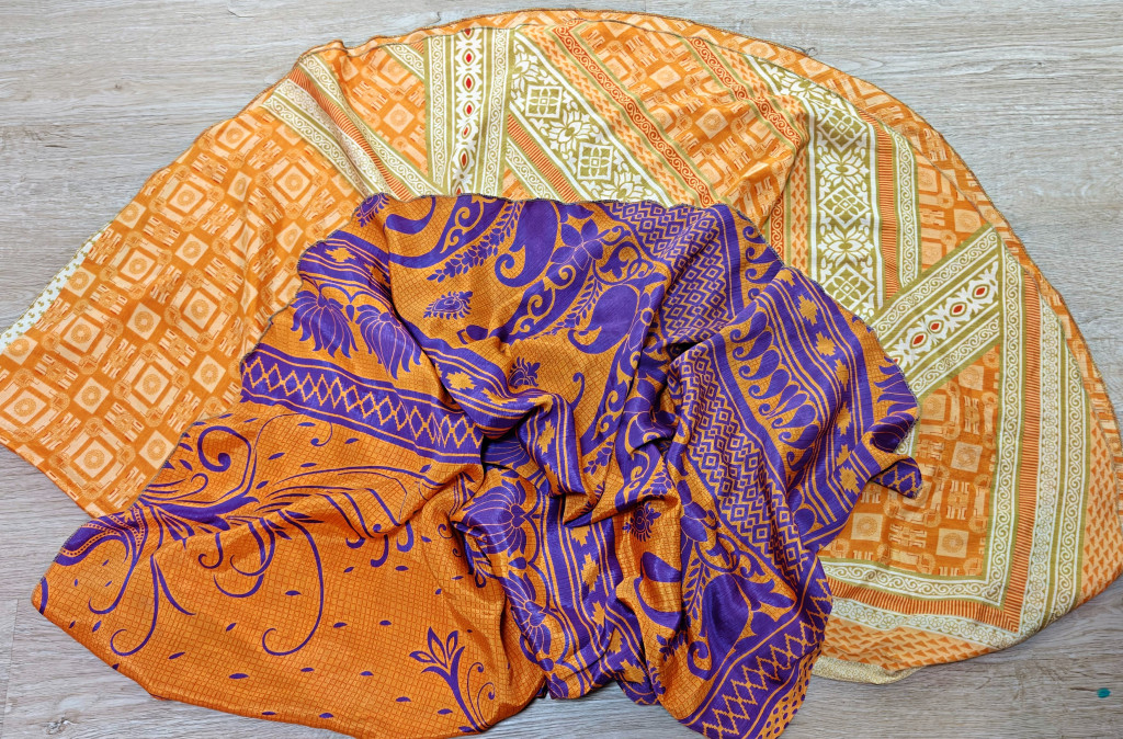 Lapszoknyáink újrahasznosított szárikból készülnek Indiában, egy hosszabb és egy rövidebb anyag derékban összevarrva! Két oldalú, kifordítható, mindkét oldala hordható, sokféleképpen köthető, variálható. Szoknyáinkból nincs két egyforma, mindegyikből csak EGY darab van, ha megtetszik, csapj le rá!