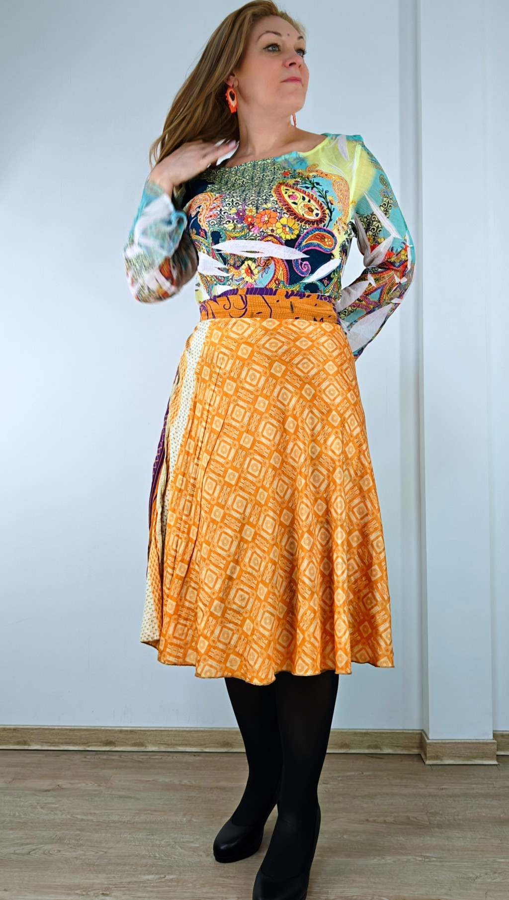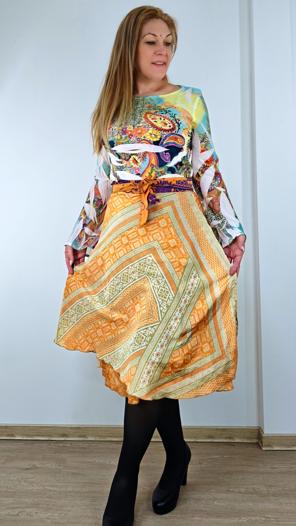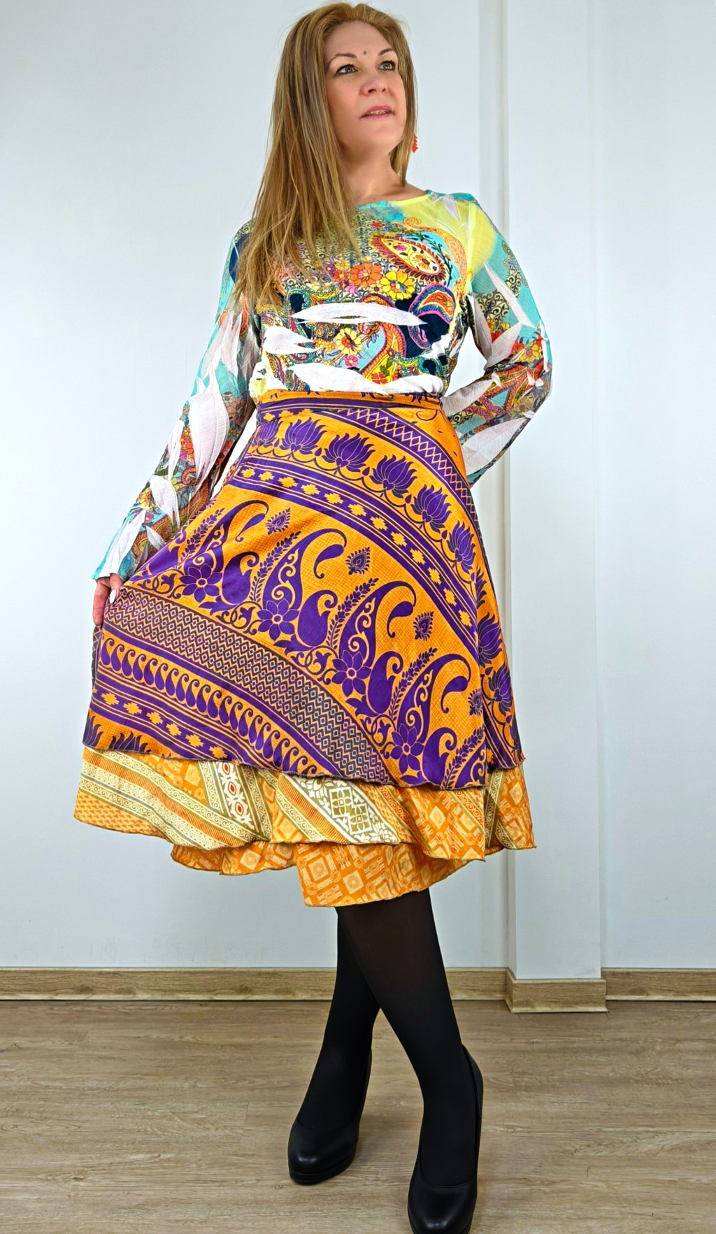 Lapszoknyáink újrahasznosított szárikból készülnek Indiában, egy hosszabb és egy rövidebb anyag derékban összevarrva! Két oldalú, kifordítható, mindkét oldala hordható, sokféleképpen köthető, variálható. Szoknyáinkból nincs két egyforma, mindegyikből csak EGY darab van, ha megtetszik, csapj le rá!