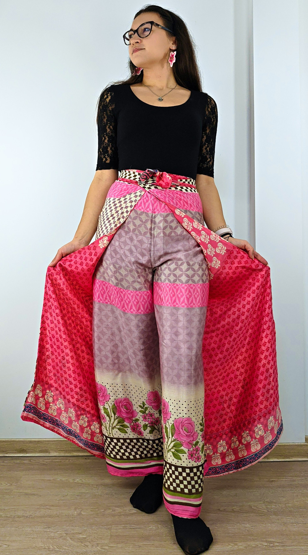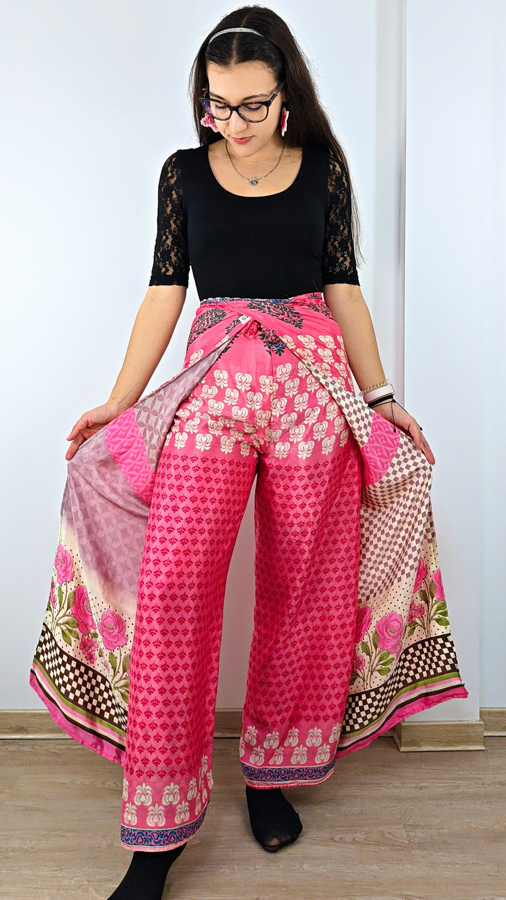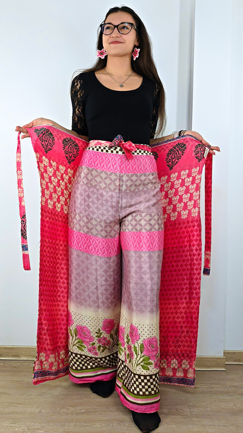 Lapnadrágjaink újrahasznosított szárikból készülnek Indiában. Két különböző csodás anyagot varrnak össze, így a külső és belső fele is hordható!