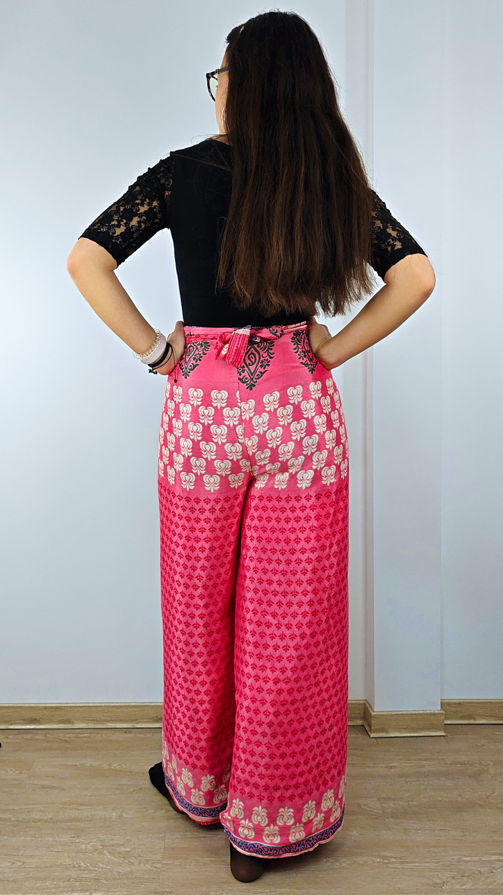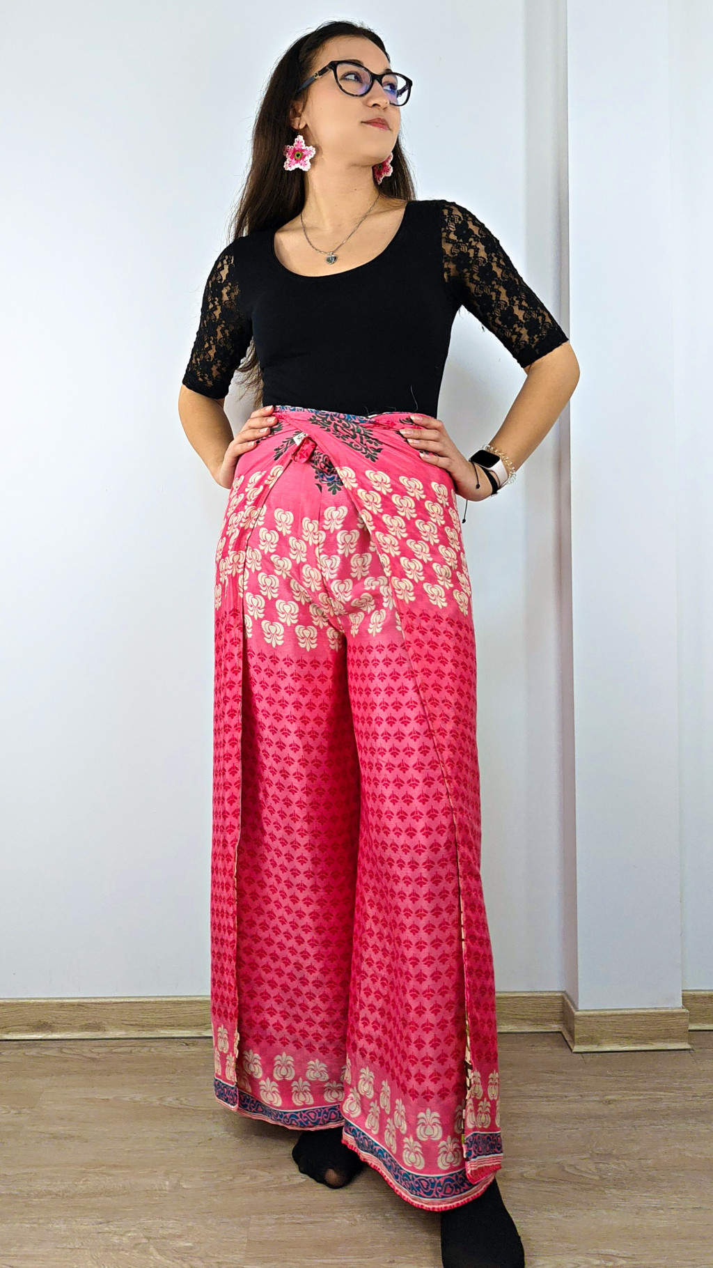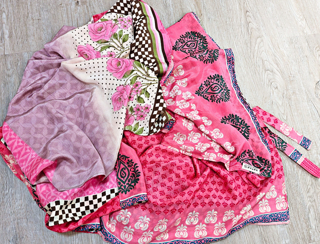 Lapnadrágjaink újrahasznosított szárikból készülnek Indiában. Két különböző csodás anyagot varrnak össze, így a külső és belső fele is hordható!