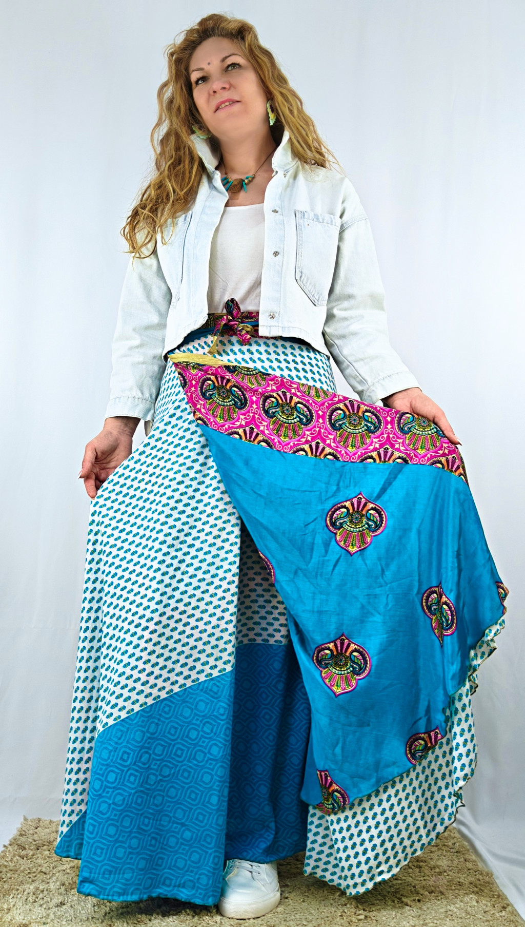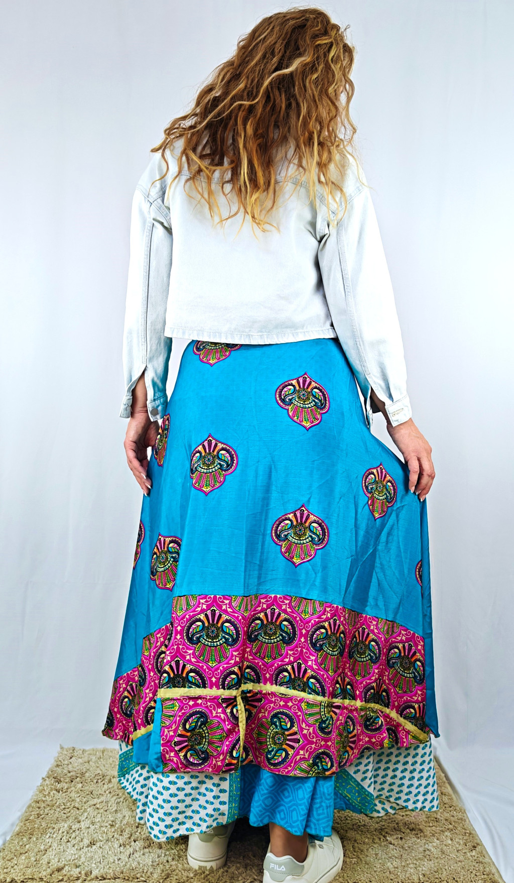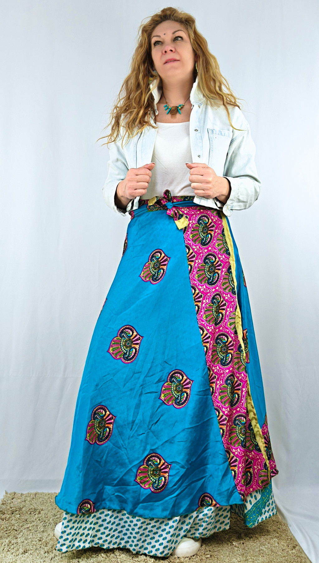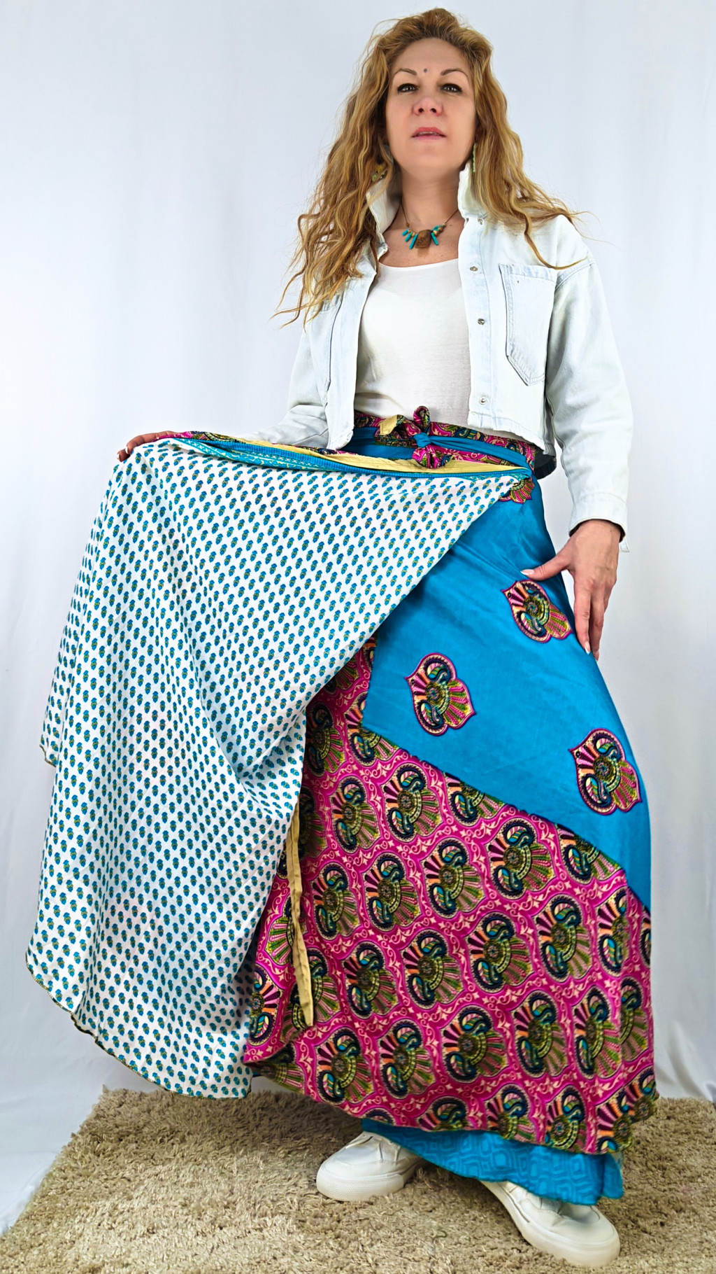 Lapszoknyáink újrahasznosított szárikból készülnek Indiában, egy hosszabb és egy rövidebb anyag derékban összevarrva! Két oldalú, kifordítható, mindkét oldala hordható, sokféleképpen köthető, variálható. Szoknyáinkból nincs két egyforma, mindegyikből csak EGY darab van, ha megtetszik, csapj le rá!