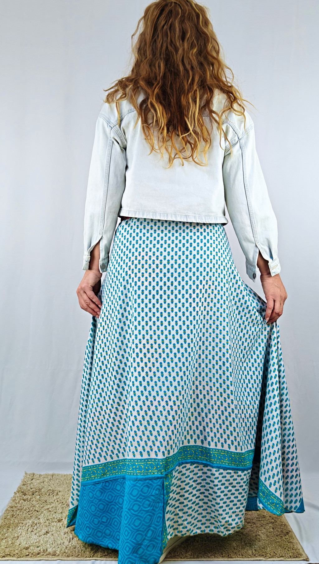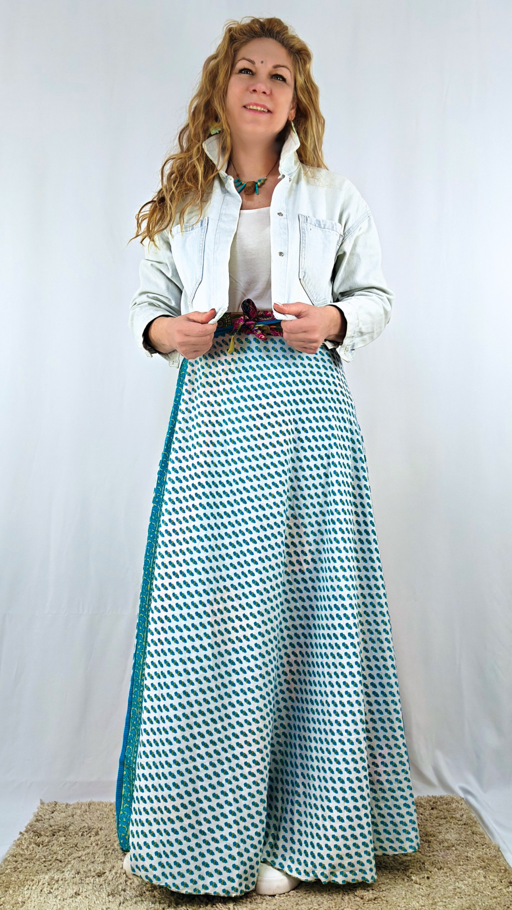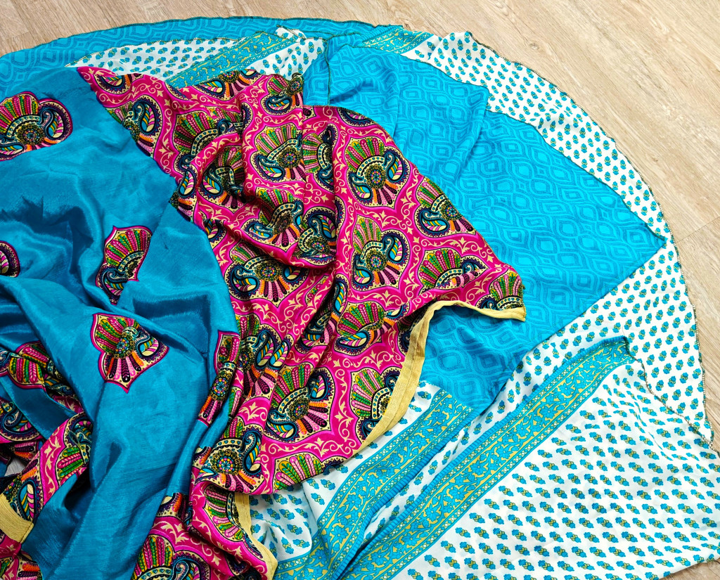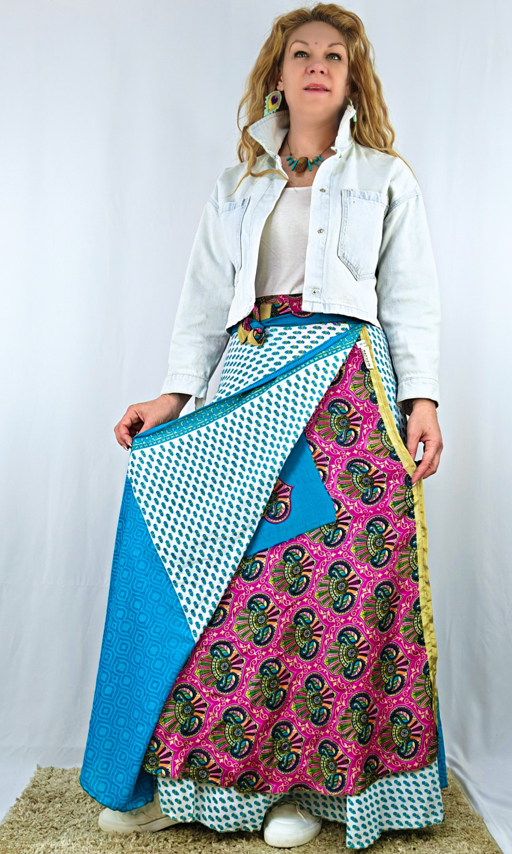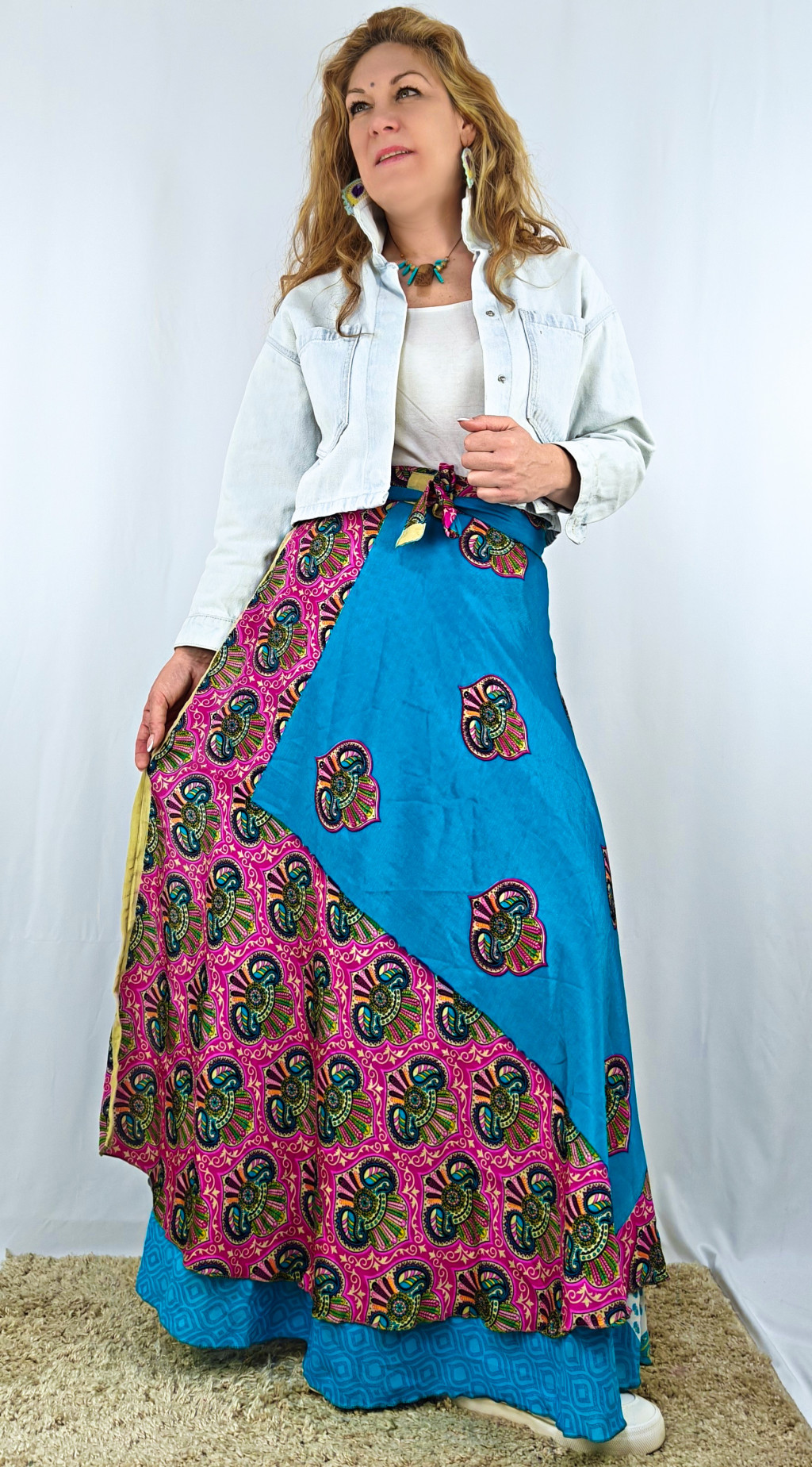 Lapszoknyáink újrahasznosított szárikból készülnek Indiában, egy hosszabb és egy rövidebb anyag derékban összevarrva! Két oldalú, kifordítható, mindkét oldala hordható, sokféleképpen köthető, variálható. Szoknyáinkból nincs két egyforma, mindegyikből csak EGY darab van, ha megtetszik, csapj le rá!