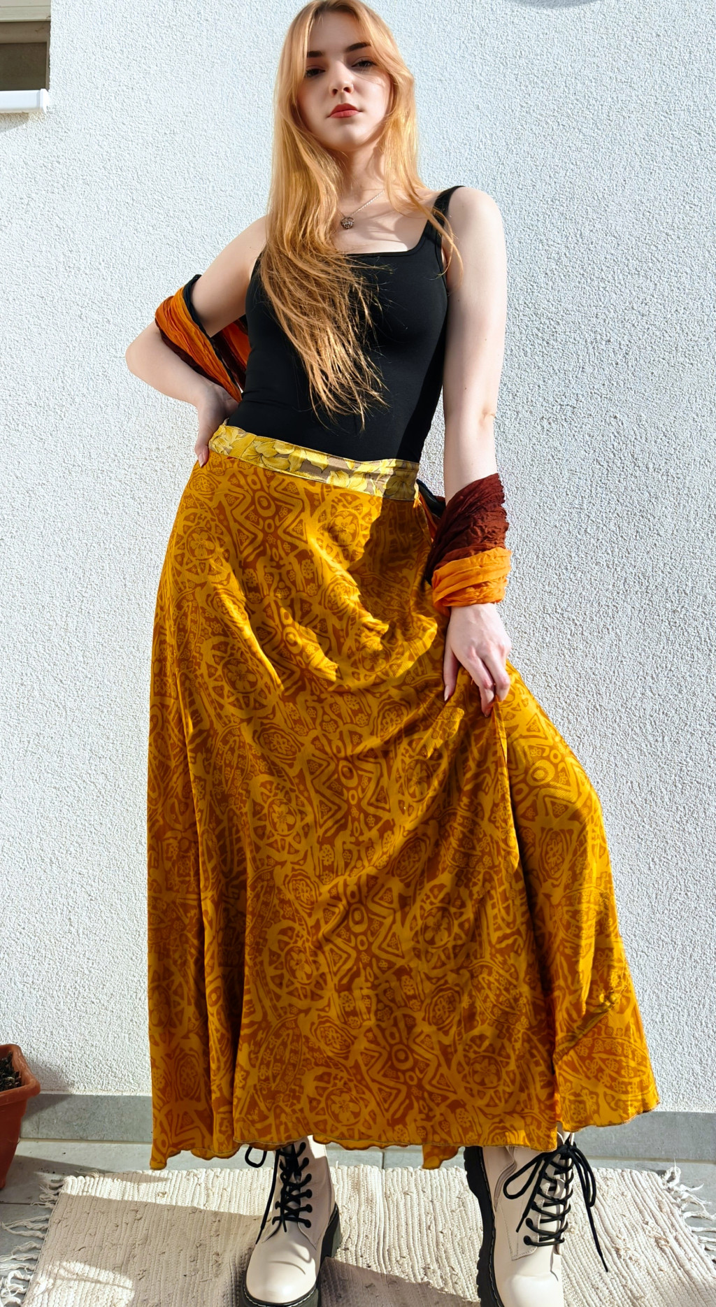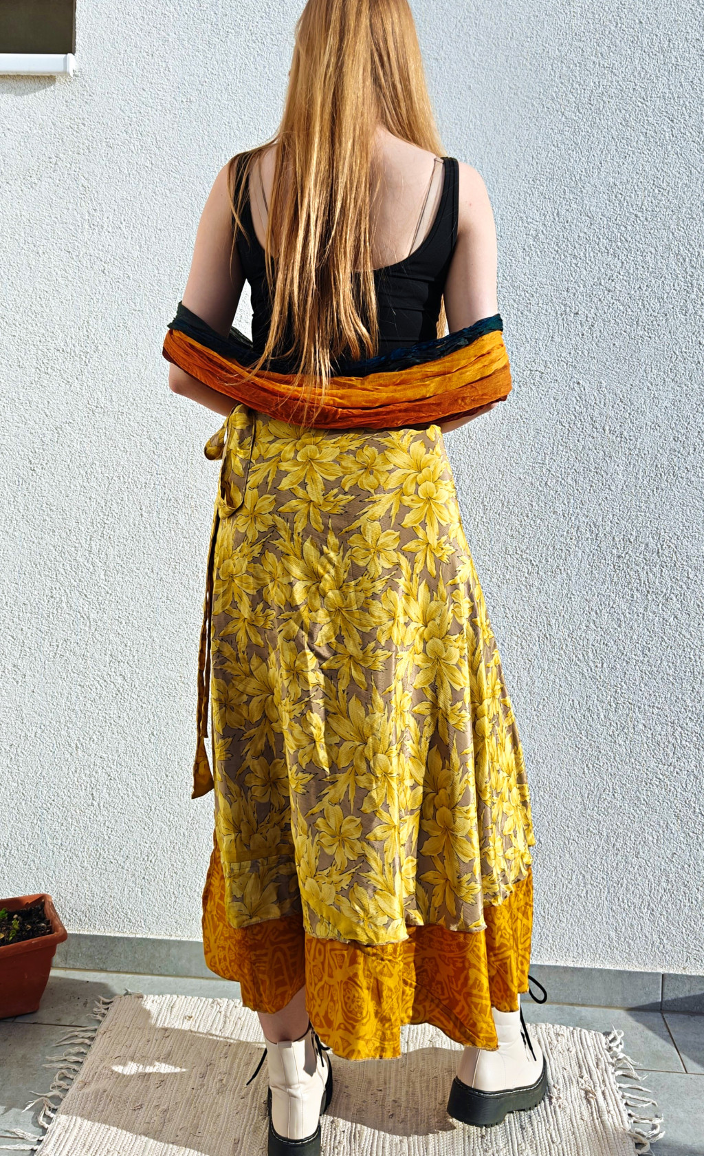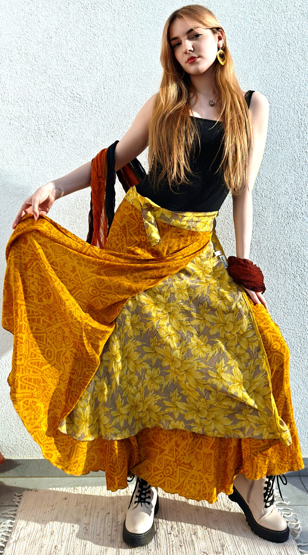 Lapszoknyáink újrahasznosított szárikból készülnek Indiában, egy hosszabb és egy rövidebb anyag derékban összevarrva! Két oldalú, kifordítható, mindkét oldala hordható, sokféleképpen köthető, variálható. Szoknyáinkból nincs két egyforma, mindegyikből csak EGY darab van, ha megtetszik, csapj le rá!