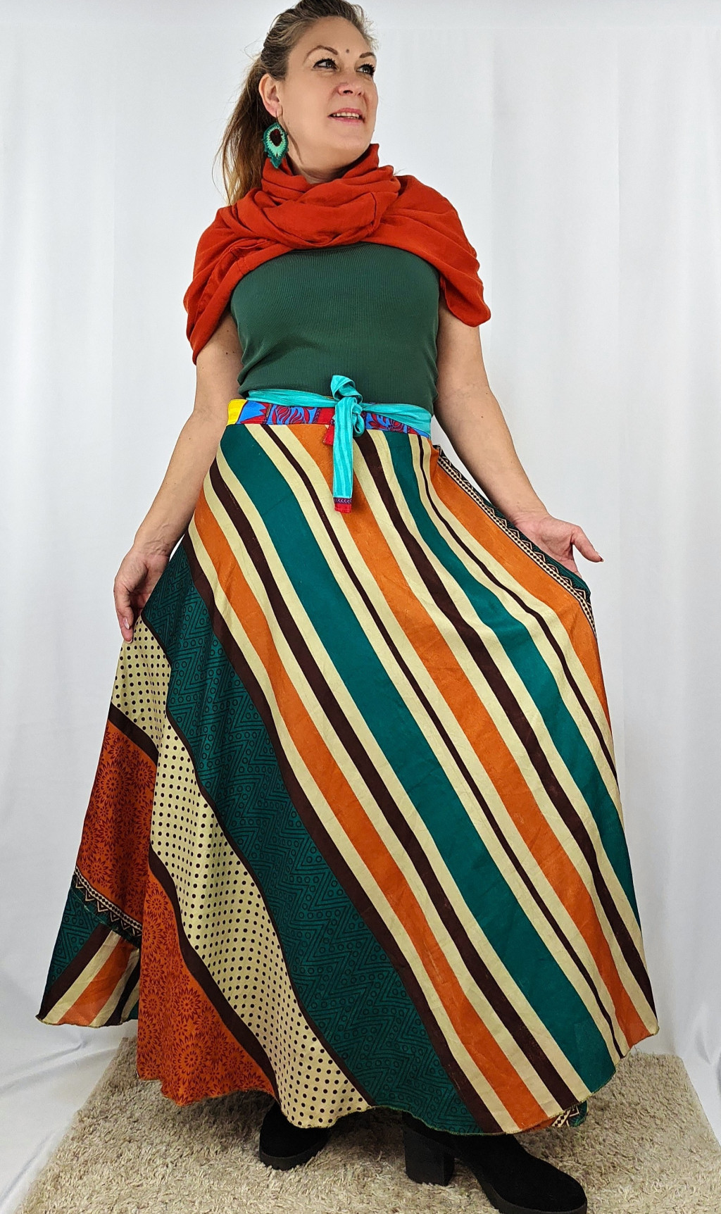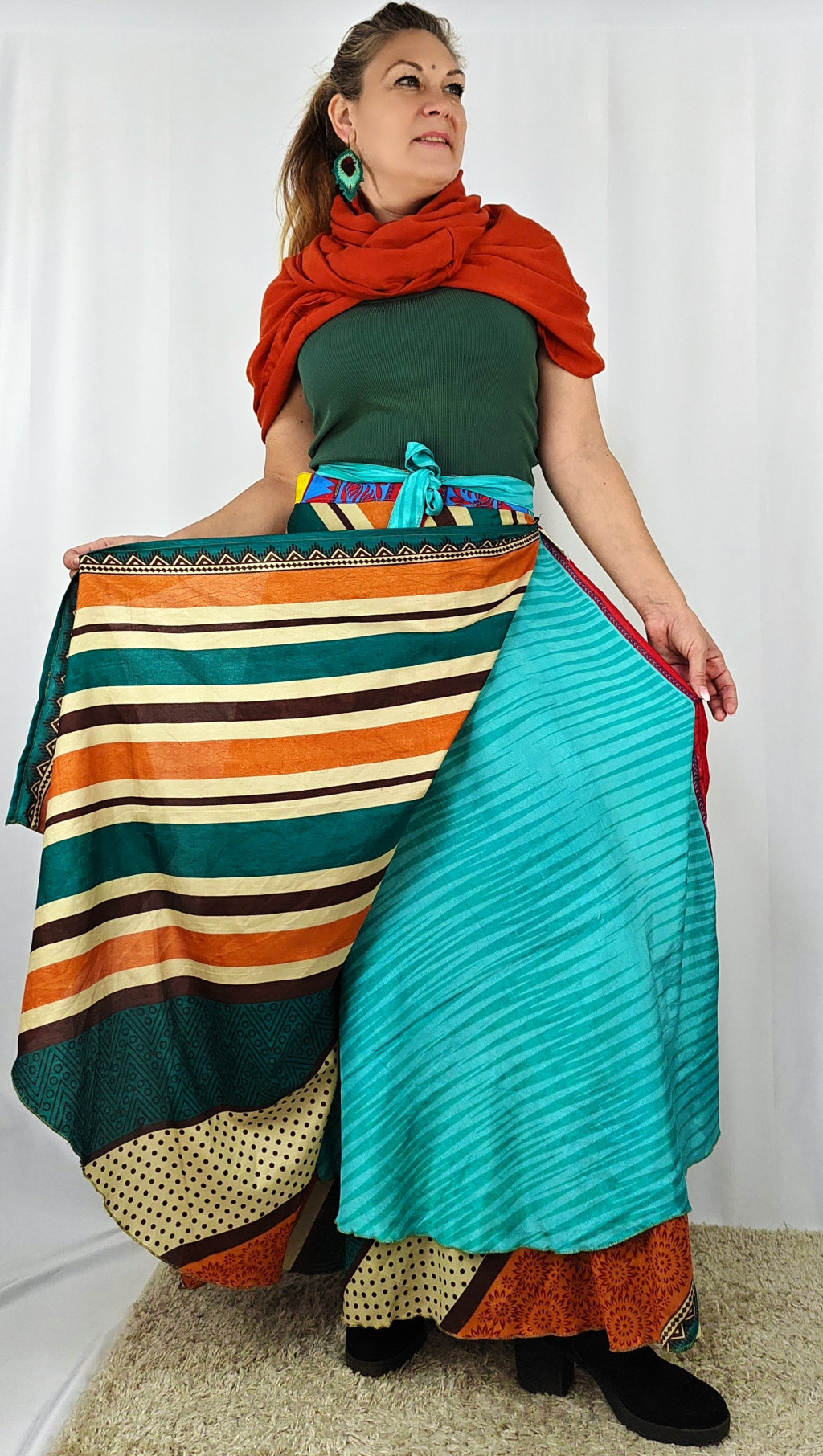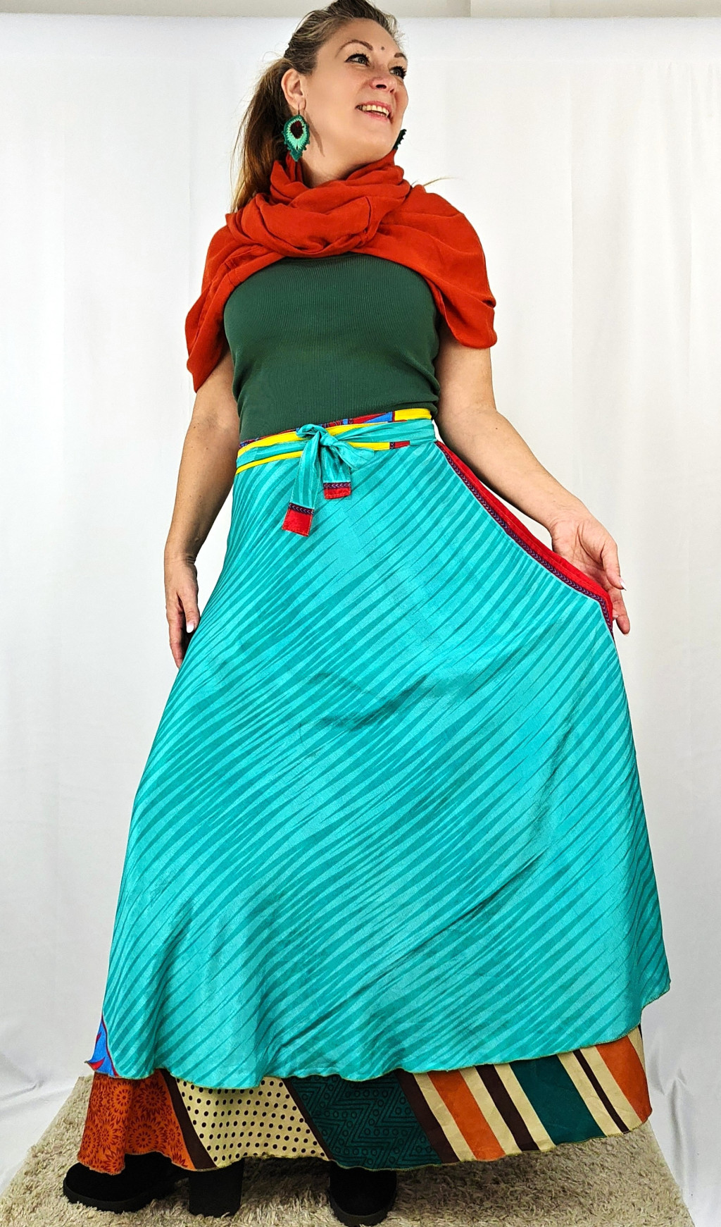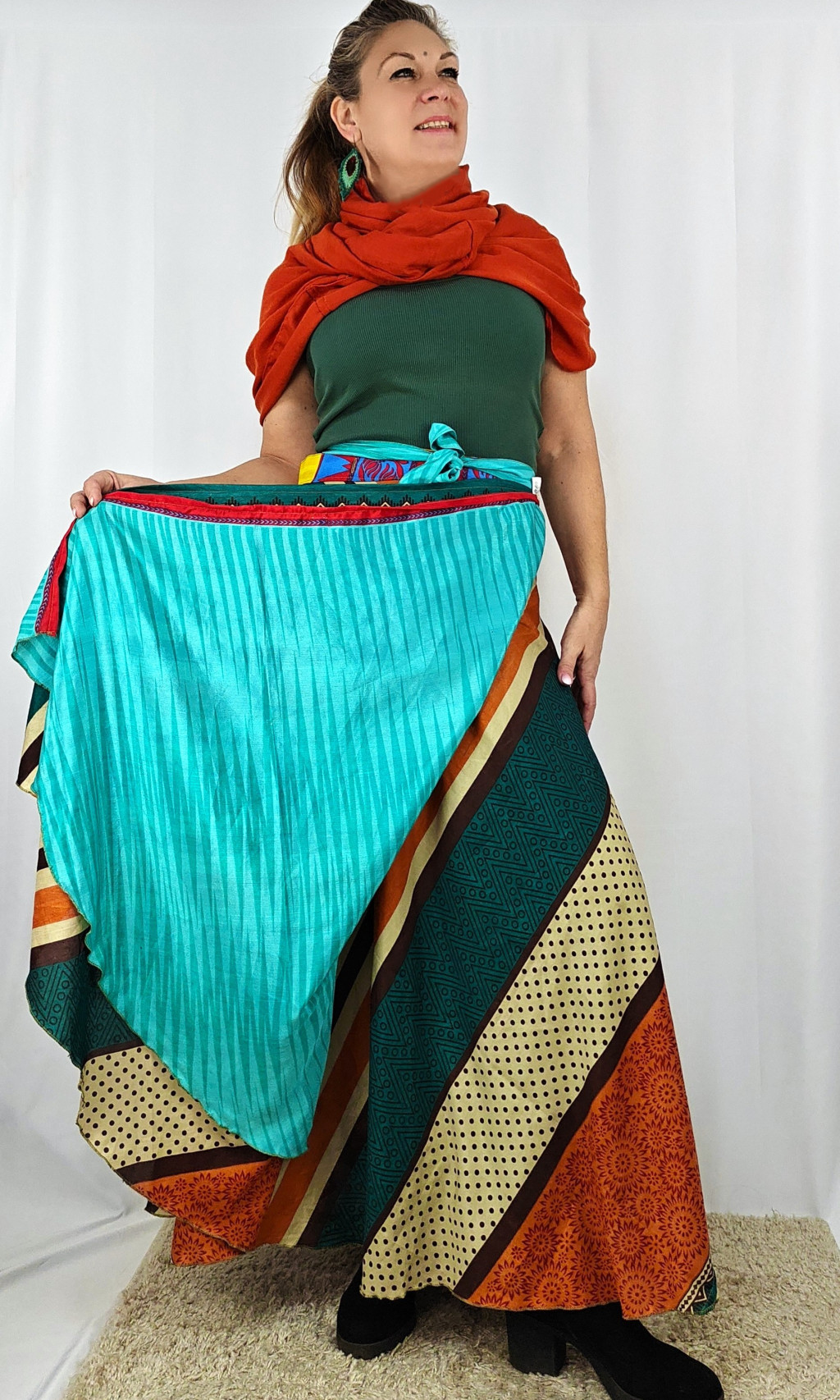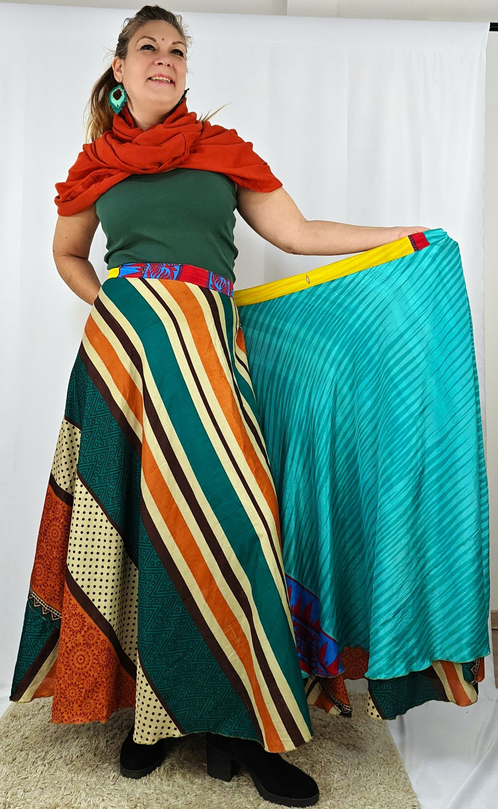 Lapszoknyáink újrahasznosított szárikból készülnek Indiában, egy hosszabb és egy rövidebb anyag derékban összevarrva! Két oldalú, kifordítható, mindkét oldala hordható, sokféleképpen köthető, variálható. Szoknyáinkból nincs két egyforma, mindegyikből csak EGY darab van, ha megtetszik, csapj le rá!