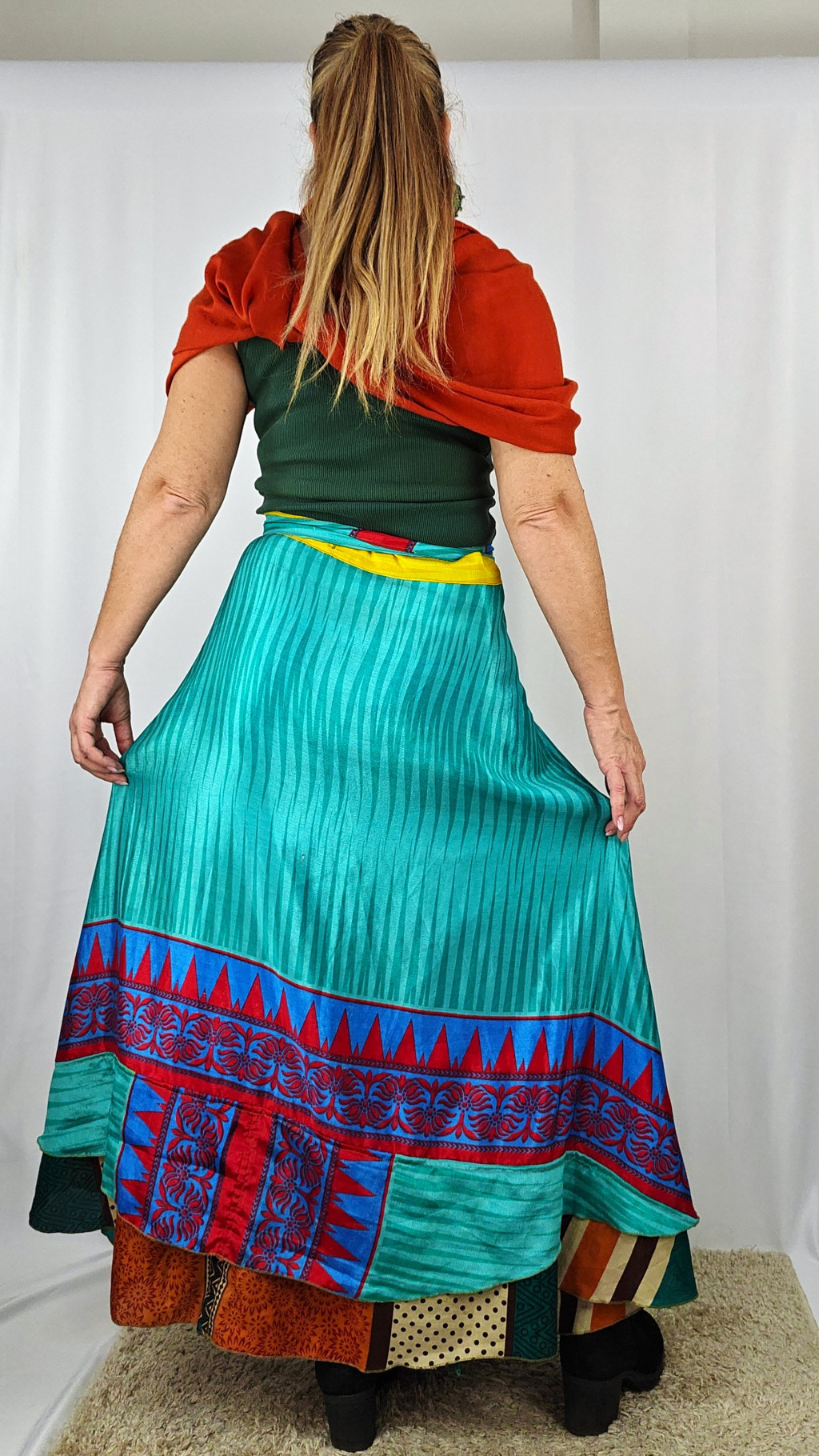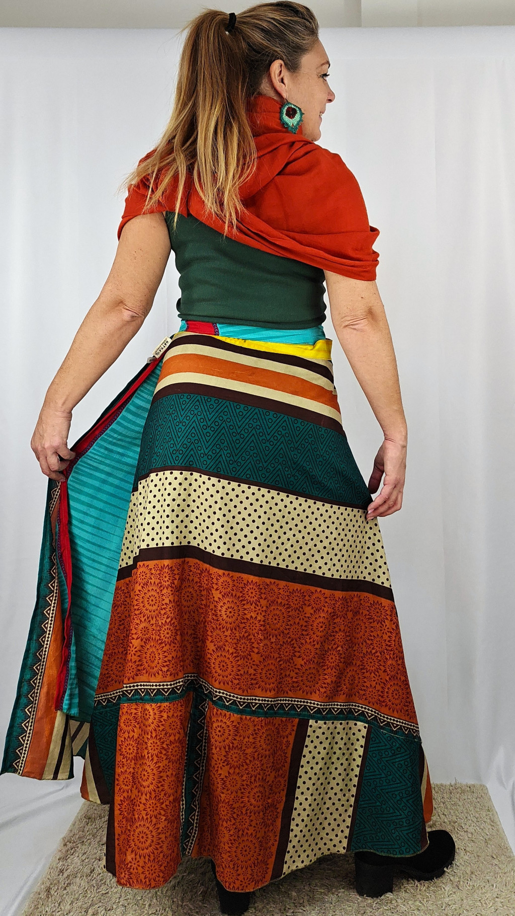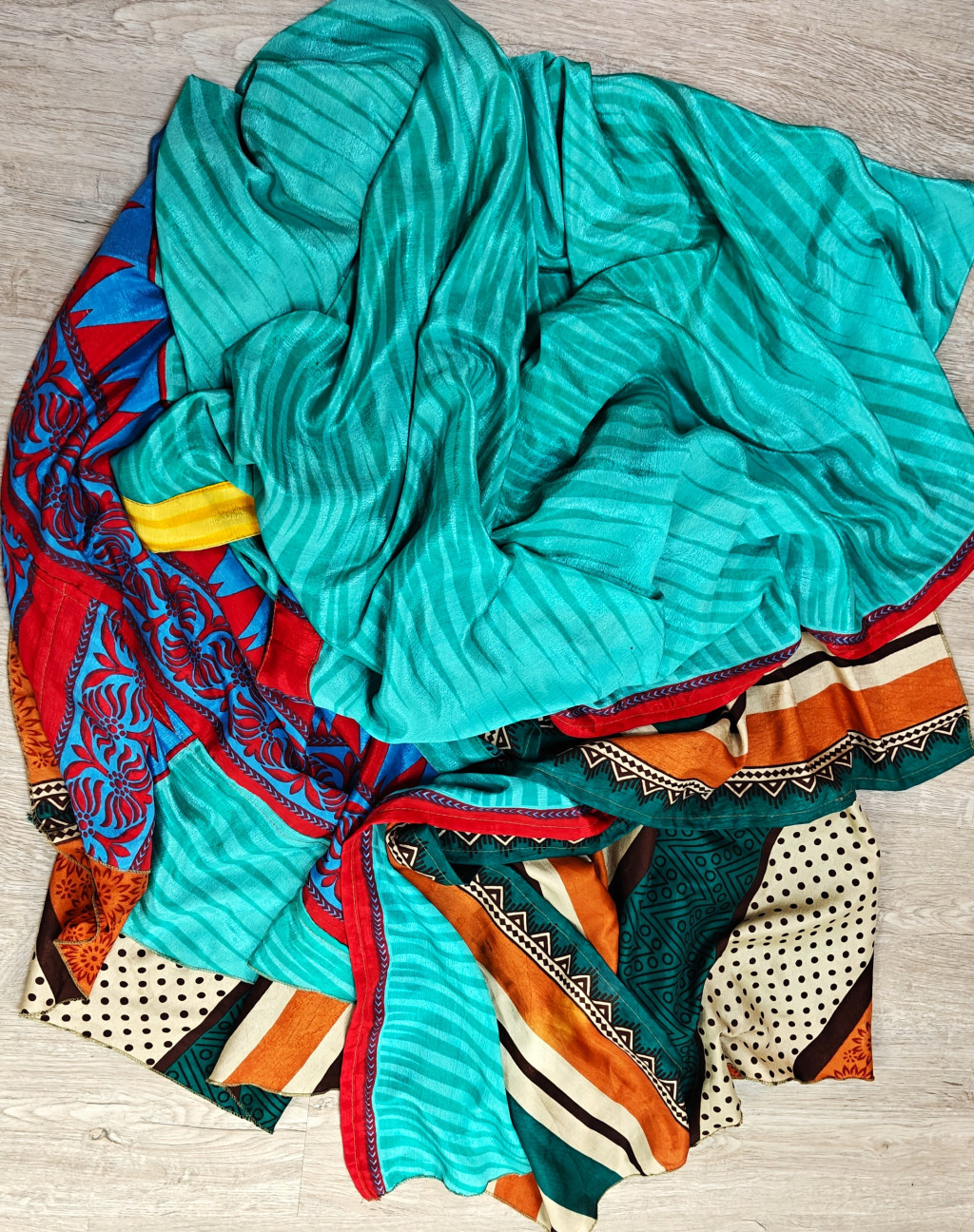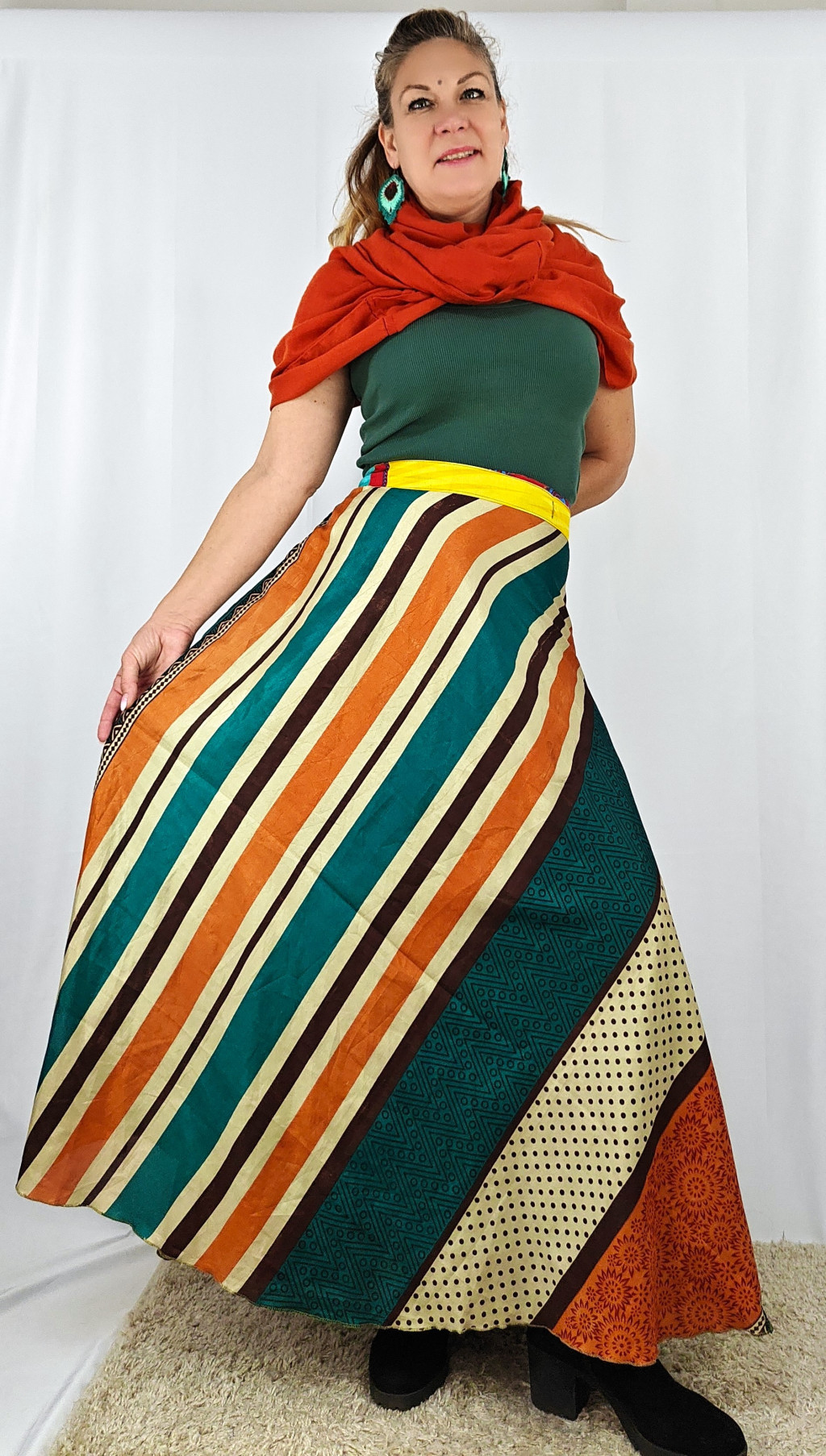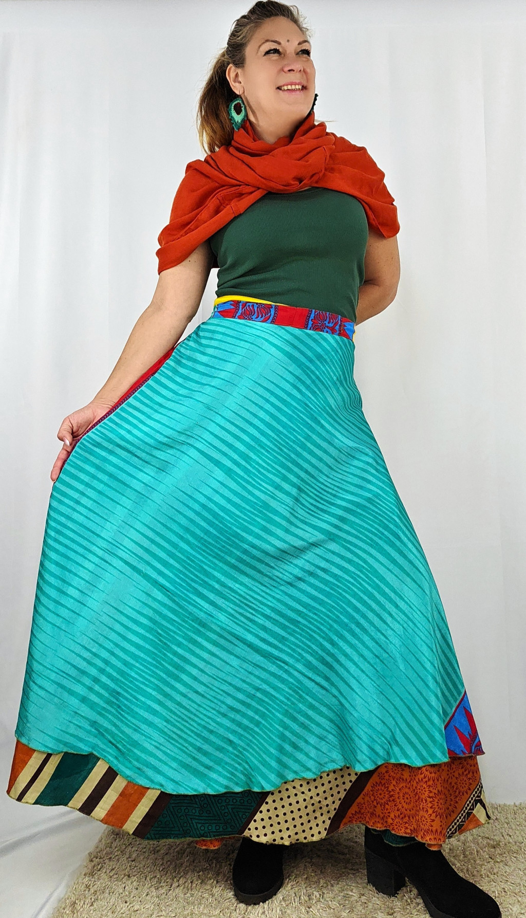 Lapszoknyáink újrahasznosított szárikból készülnek Indiában, egy hosszabb és egy rövidebb anyag derékban összevarrva! Két oldalú, kifordítható, mindkét oldala hordható, sokféleképpen köthető, variálható. Szoknyáinkból nincs két egyforma, mindegyikből csak EGY darab van, ha megtetszik, csapj le rá!