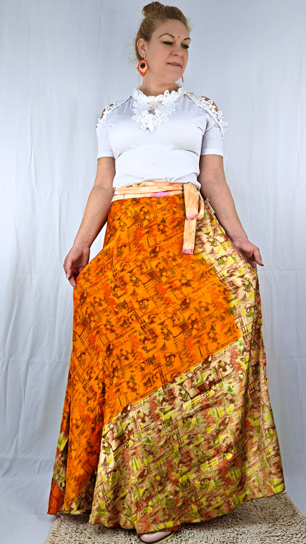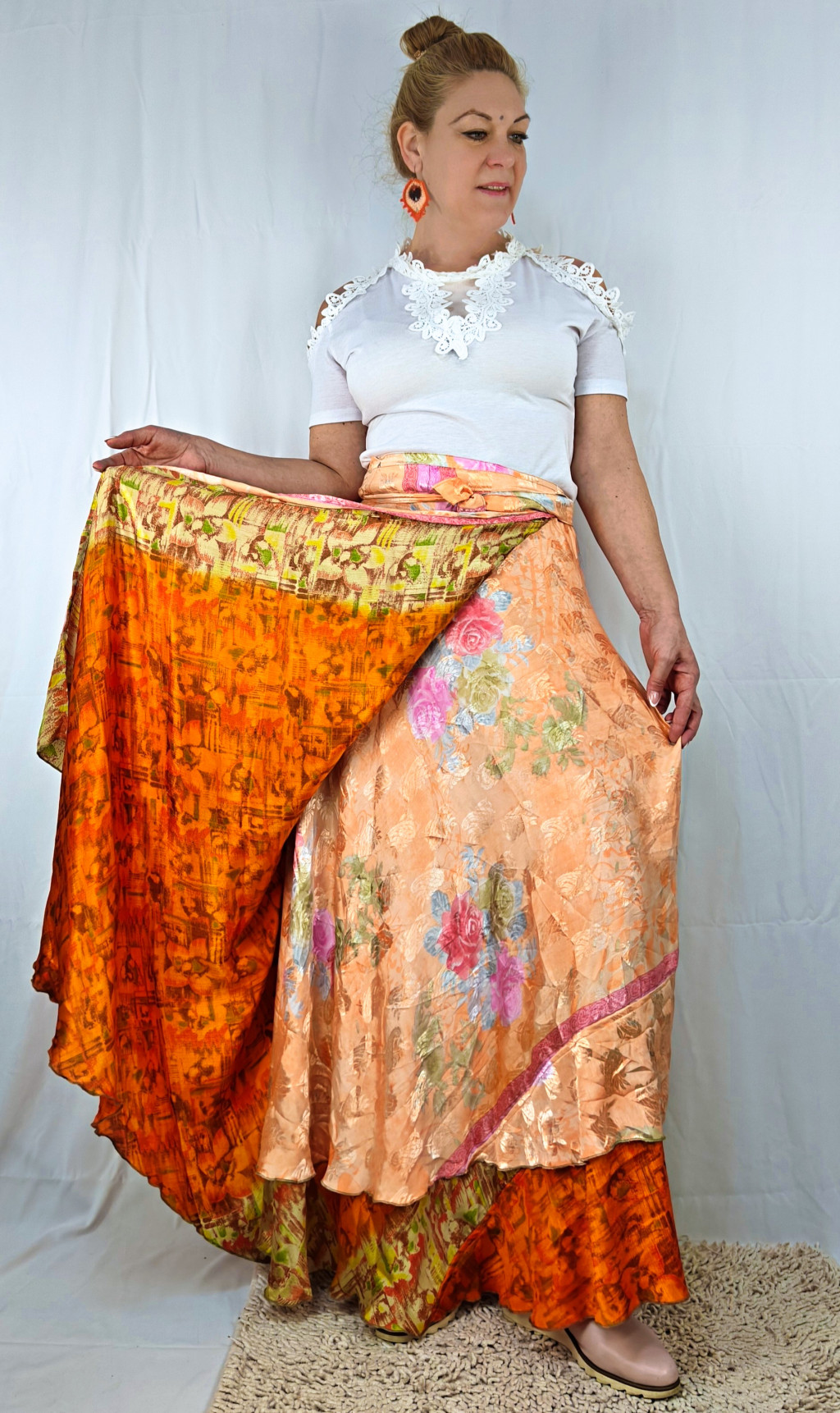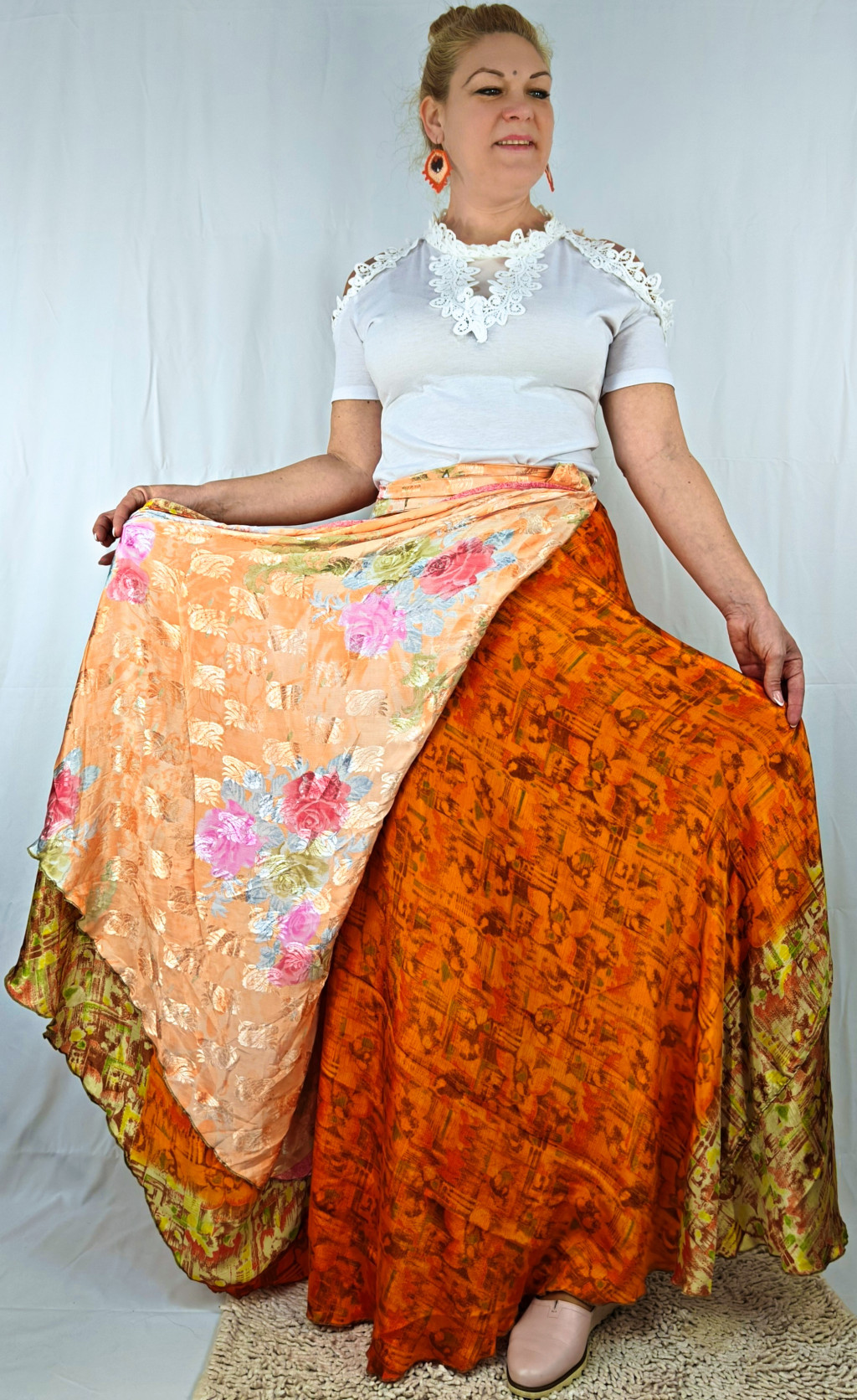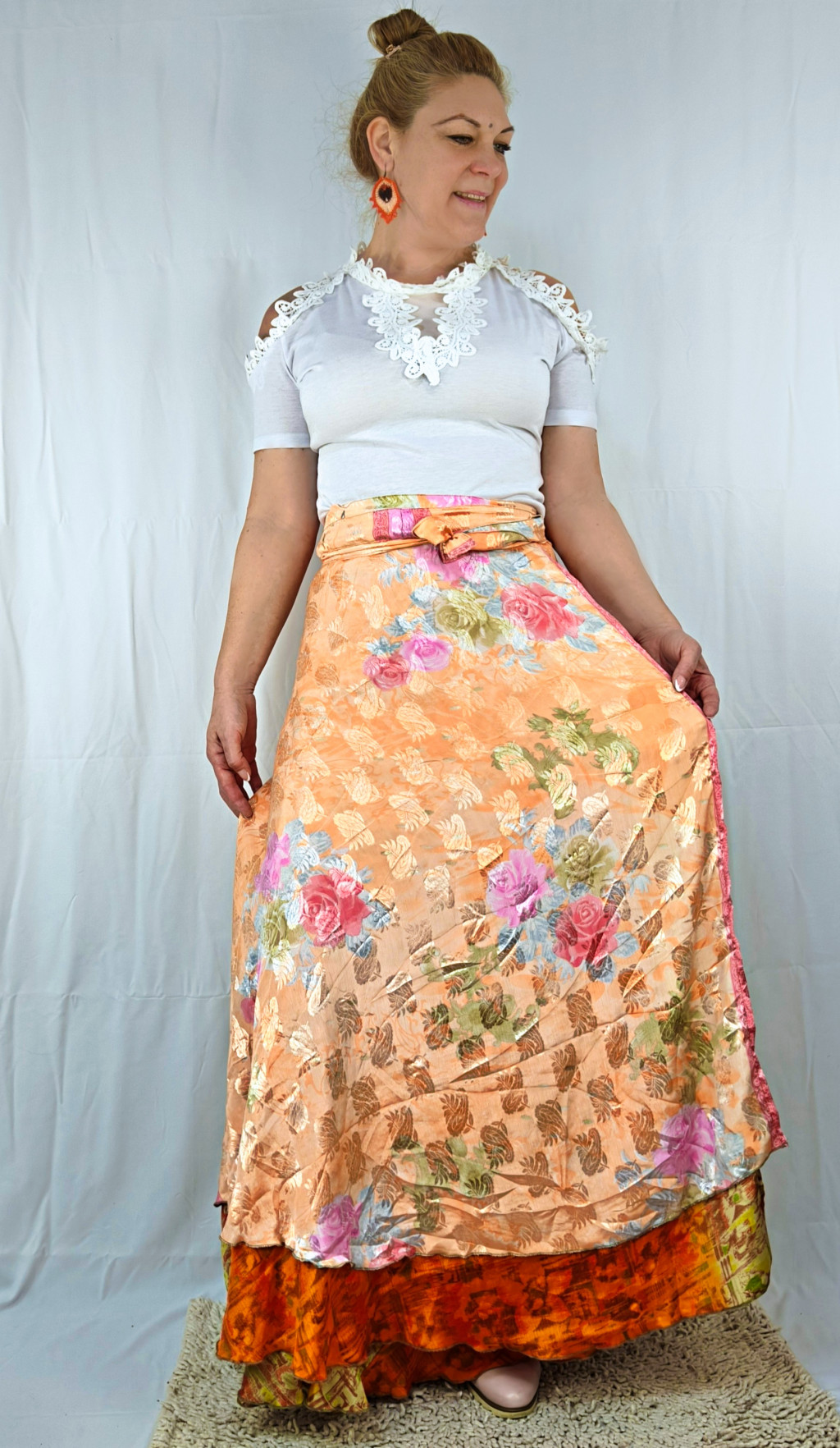Lapszoknyáink újrahasznosított szárikból készülnek Indiában, egy hosszabb és egy rövidebb anyag derékban összevarrva! Két oldalú, kifordítható, mindkét oldala hordható, sokféleképpen köthető, variálható. Szoknyáinkból nincs két egyforma, mindegyikből csak EGY darab van, ha megtetszik, csapj le rá!