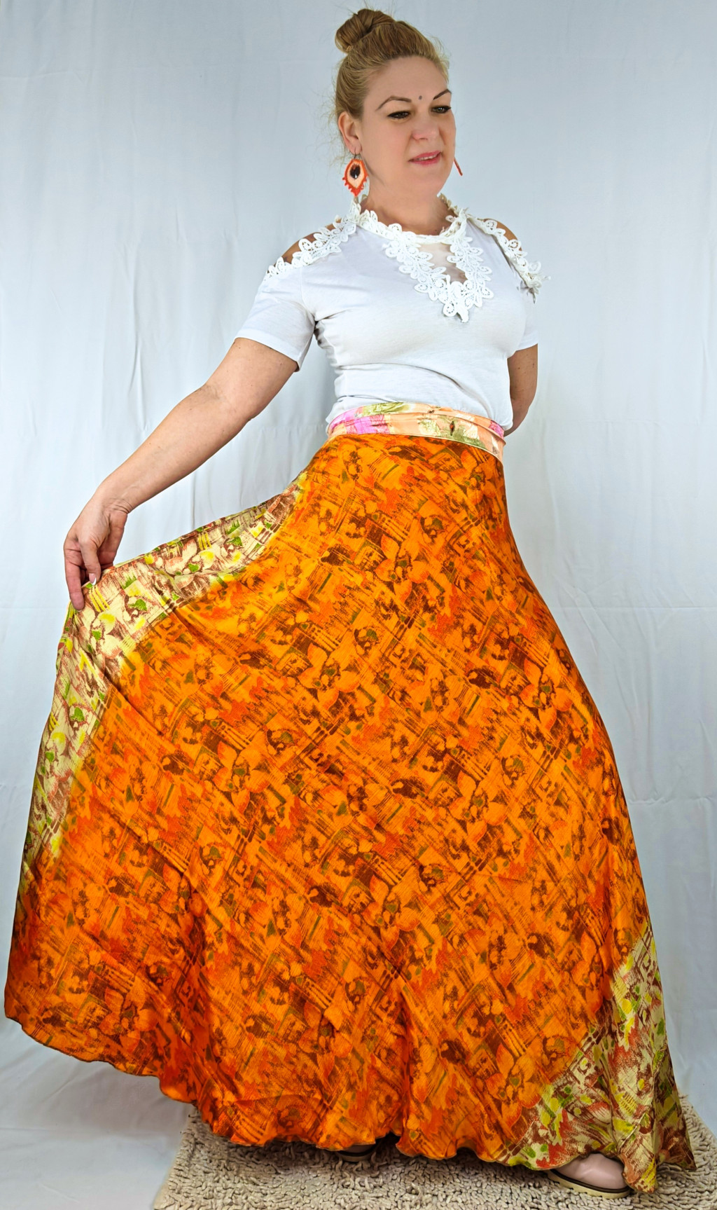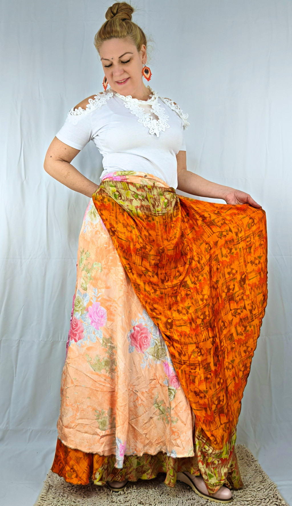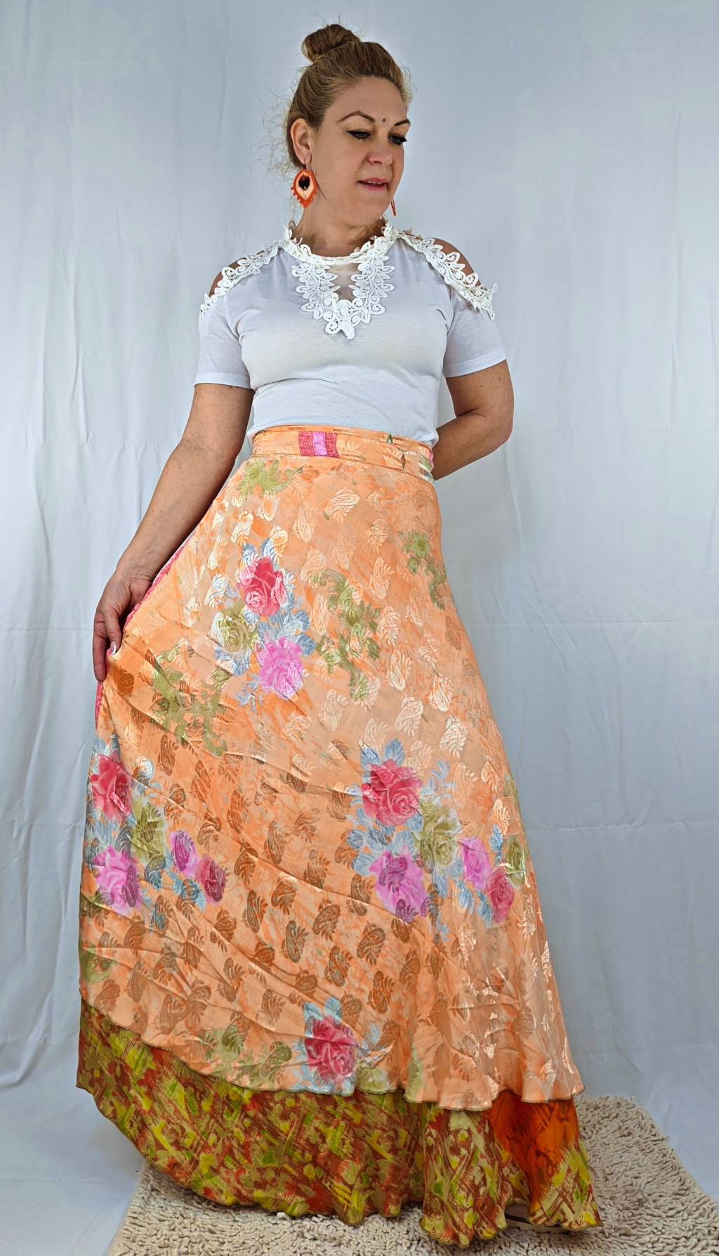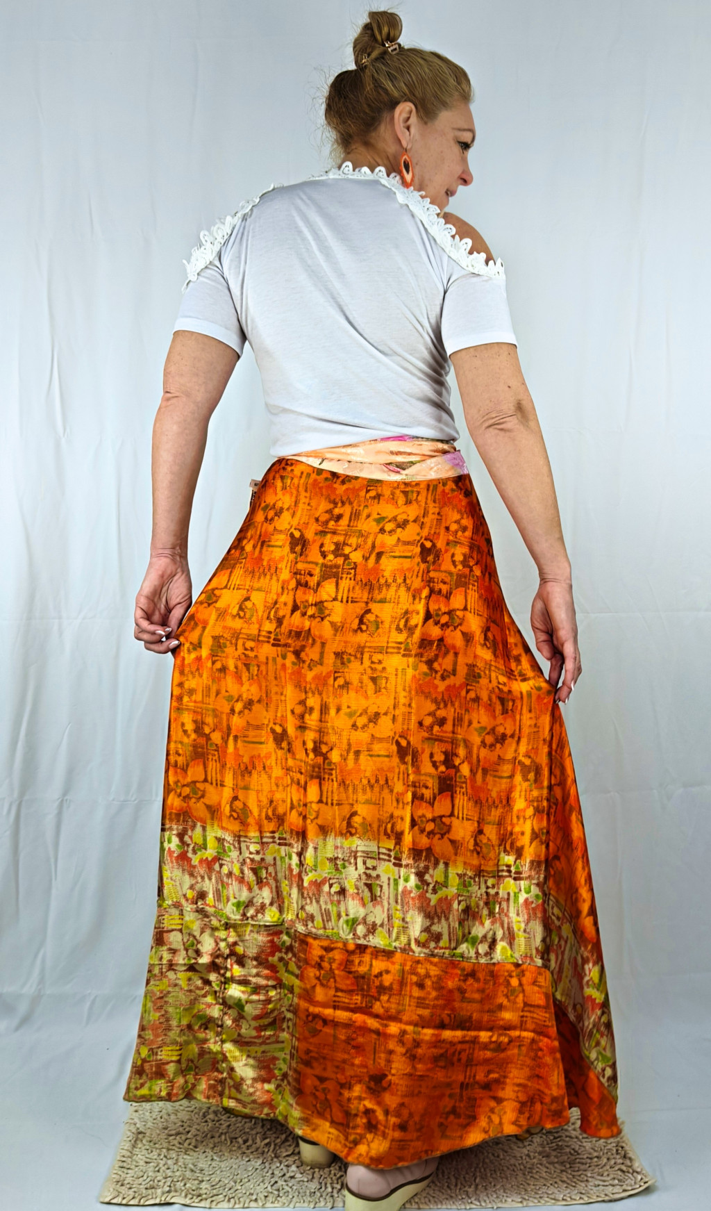 Lapszoknyáink újrahasznosított szárikból készülnek Indiában, egy hosszabb és egy rövidebb anyag derékban összevarrva! Két oldalú, kifordítható, mindkét oldala hordható, sokféleképpen köthető, variálható. Szoknyáinkból nincs két egyforma, mindegyikből csak EGY darab van, ha megtetszik, csapj le rá!