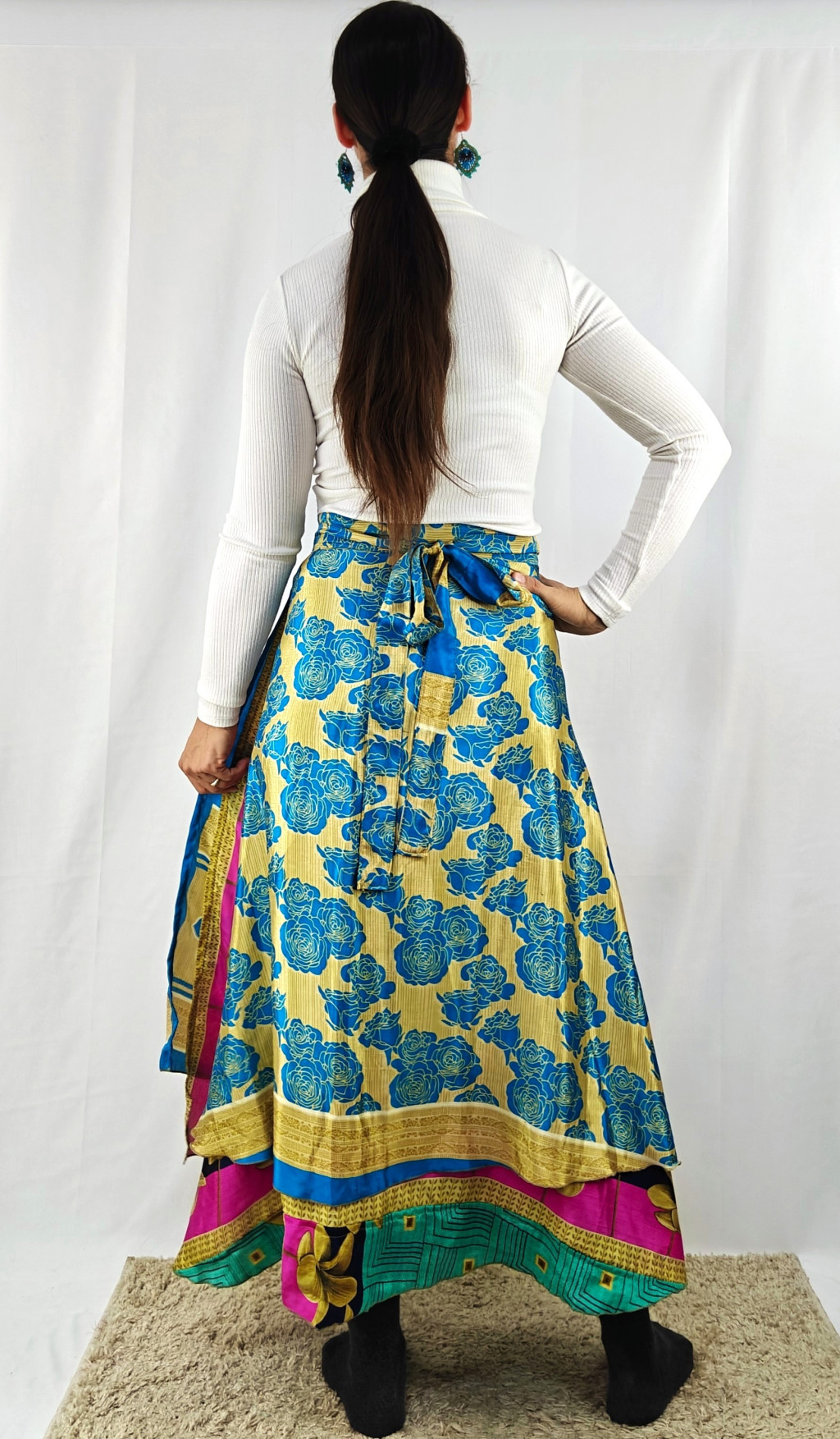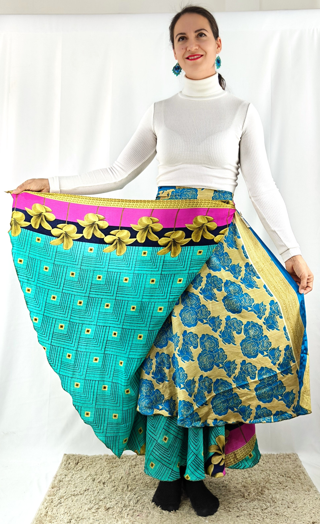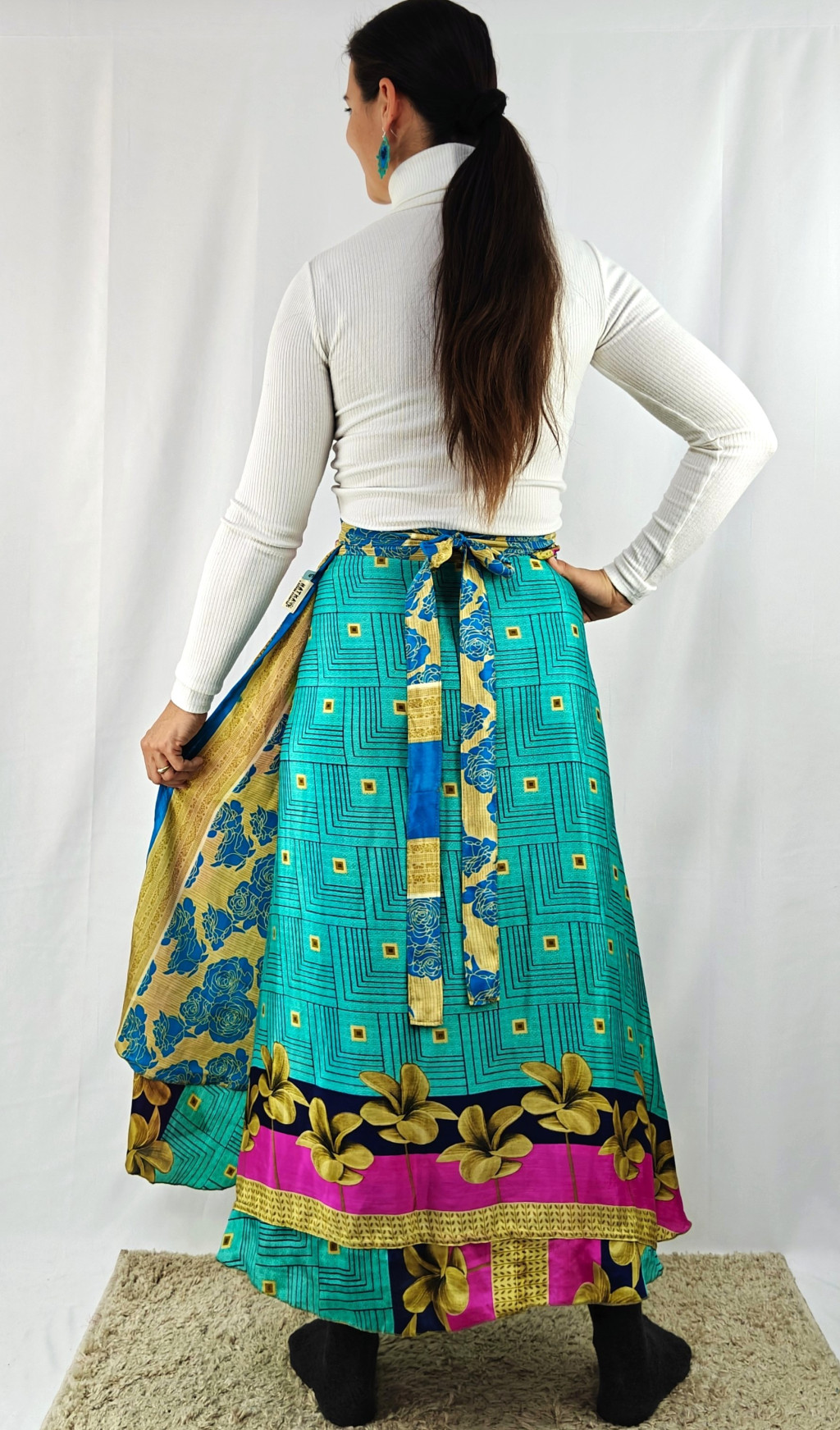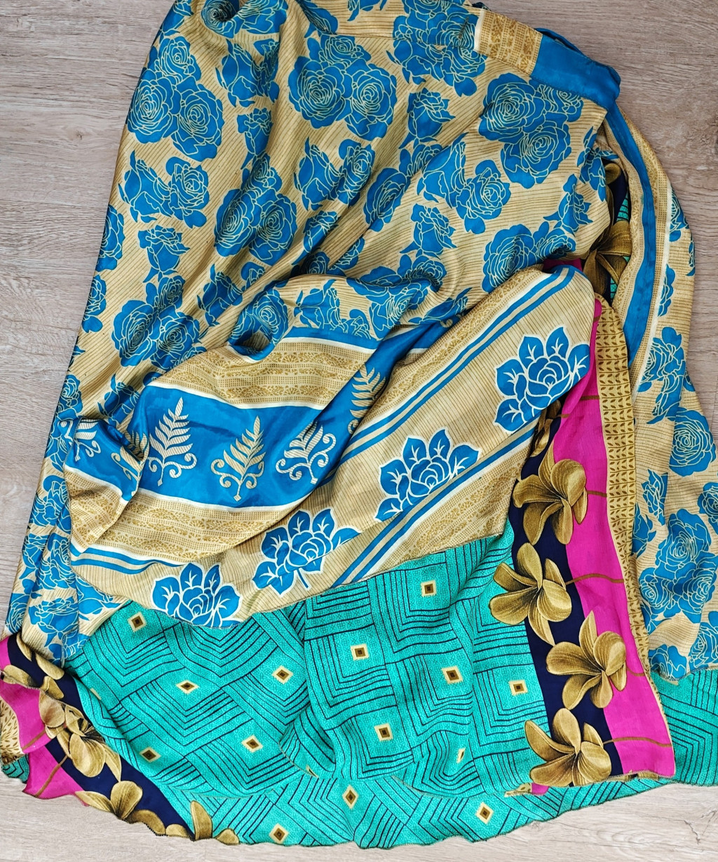 Lapszoknyáink újrahasznosított szárikból készülnek Indiában, egy hosszabb és egy rövidebb anyag derékban összevarrva! Két oldalú, kifordítható, mindkét oldala hordható, sokféleképpen köthető, variálható. Szoknyáinkból nincs két egyforma, mindegyikből csak EGY darab van, ha megtetszik, csapj le rá!