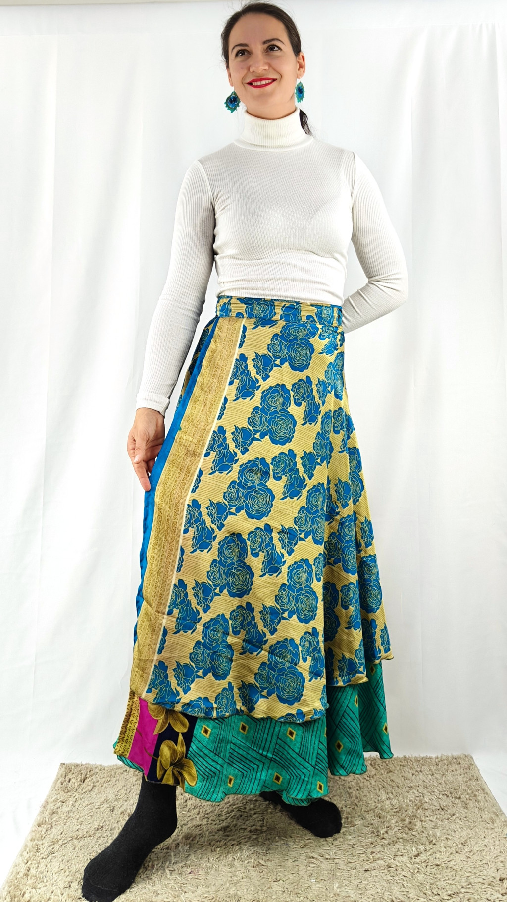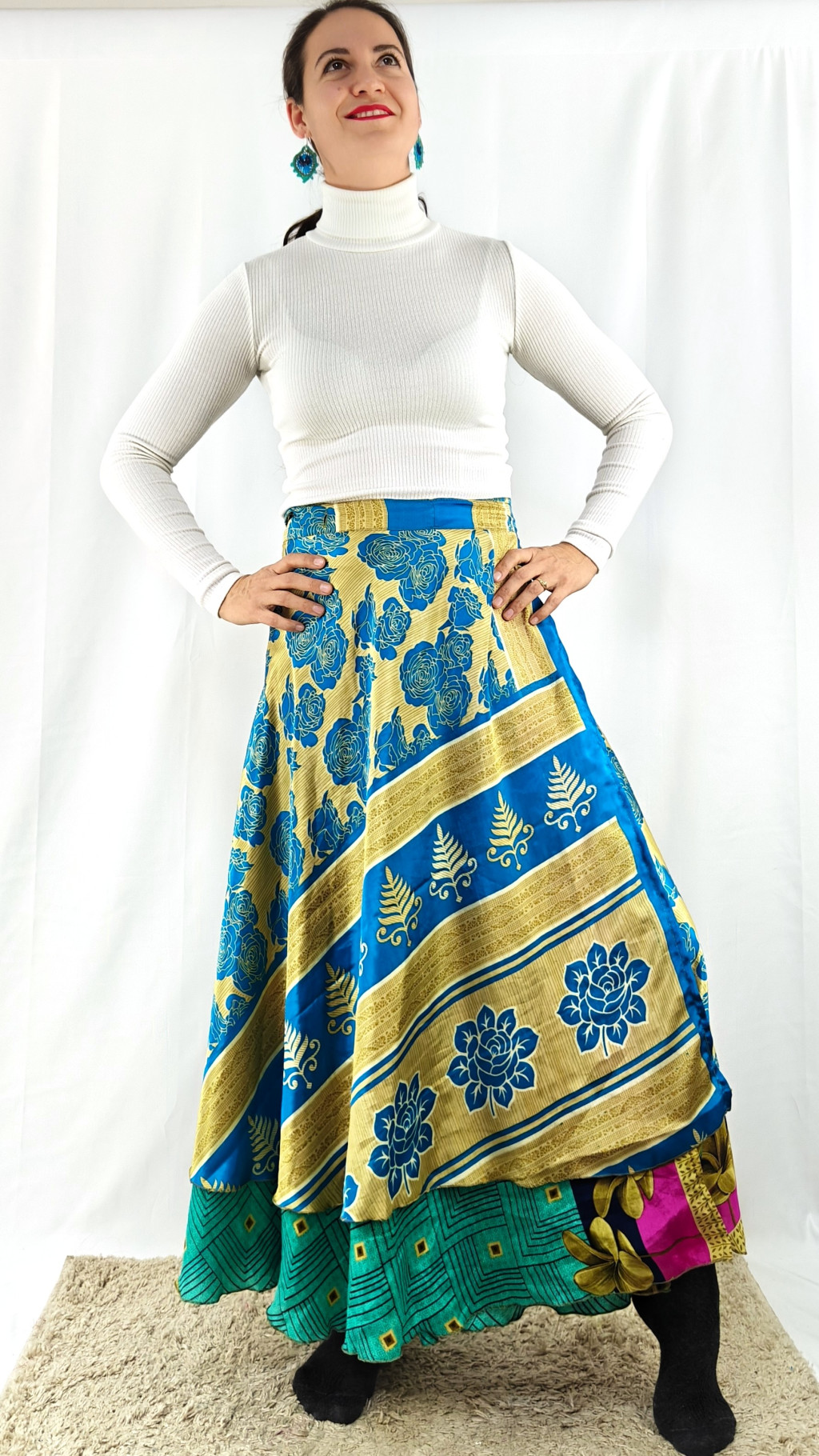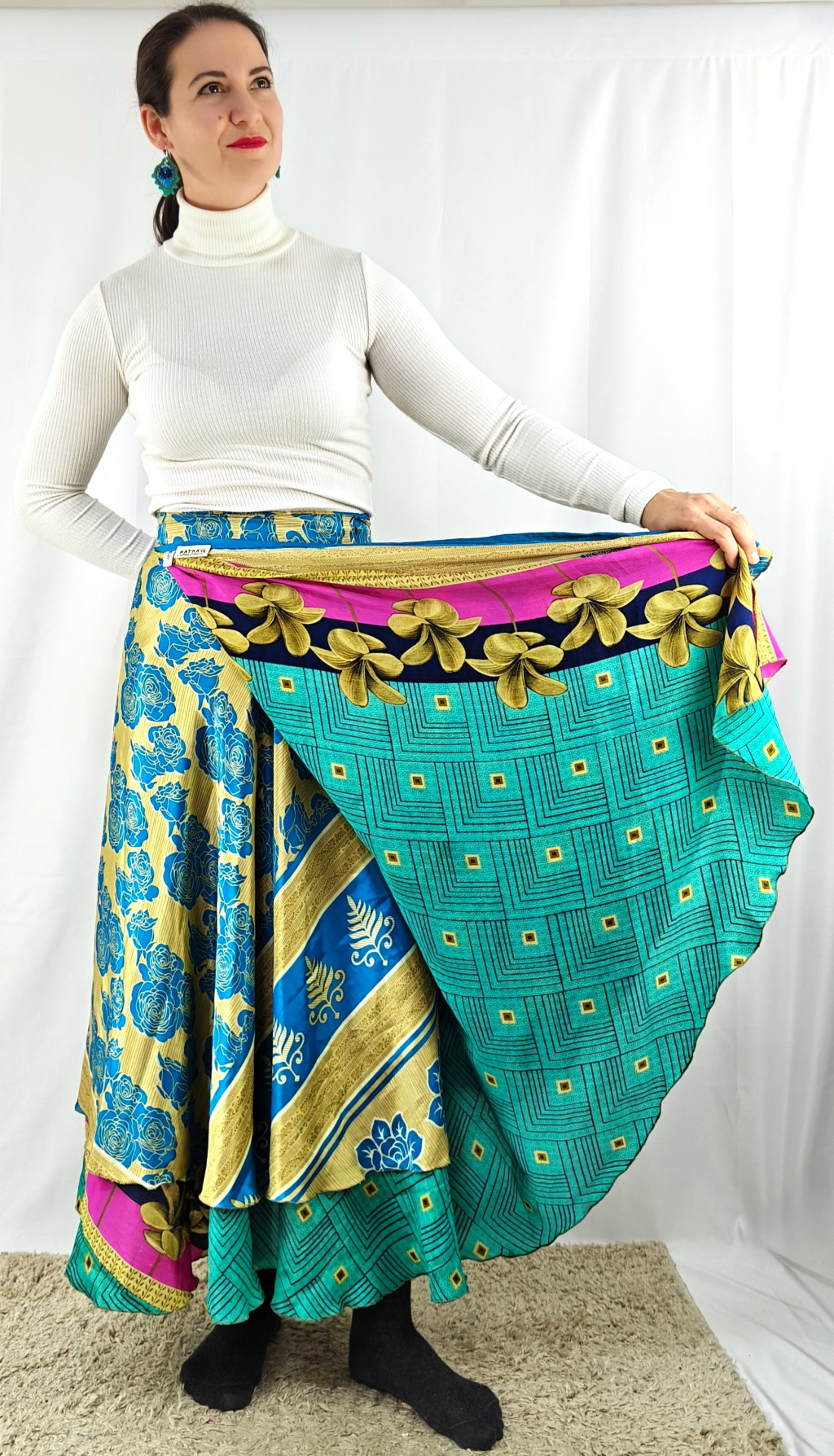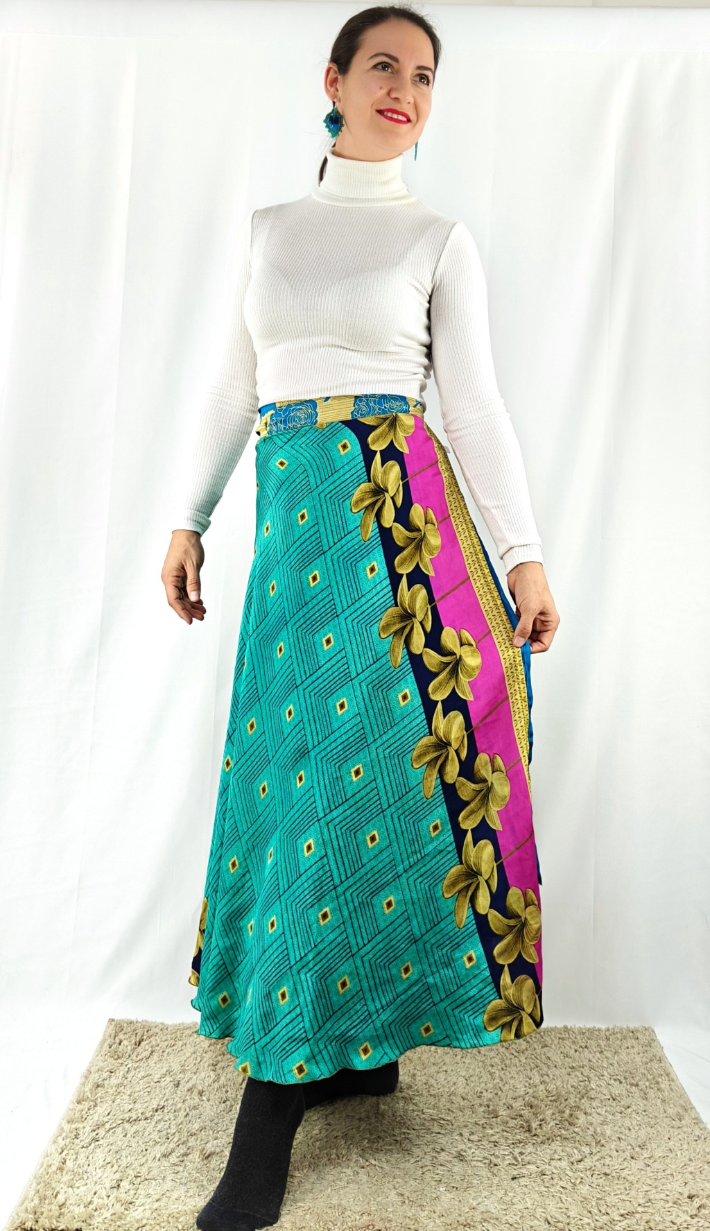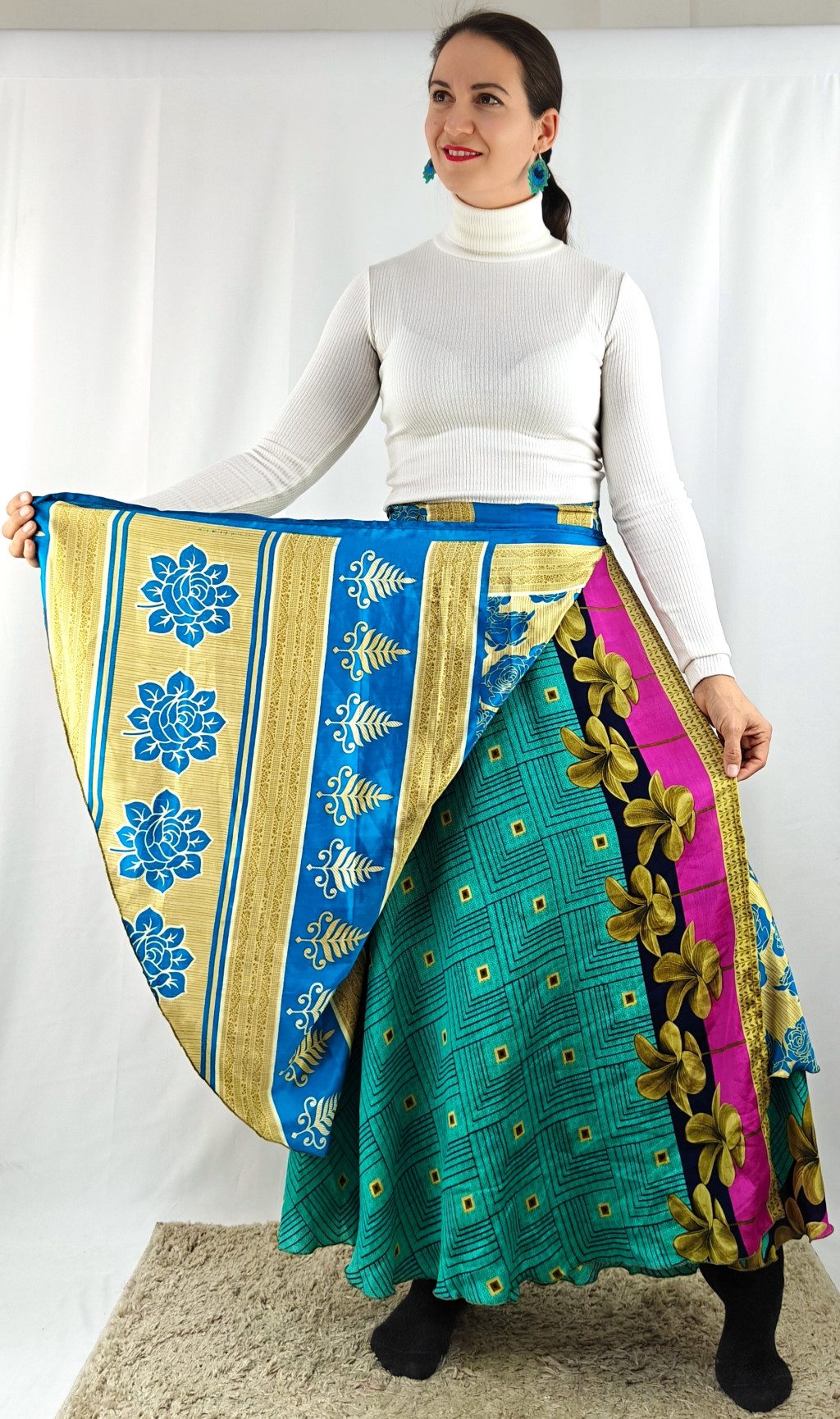 Lapszoknyáink újrahasznosított szárikból készülnek Indiában, egy hosszabb és egy rövidebb anyag derékban összevarrva! Két oldalú, kifordítható, mindkét oldala hordható, sokféleképpen köthető, variálható. Szoknyáinkból nincs két egyforma, mindegyikből csak EGY darab van, ha megtetszik, csapj le rá!