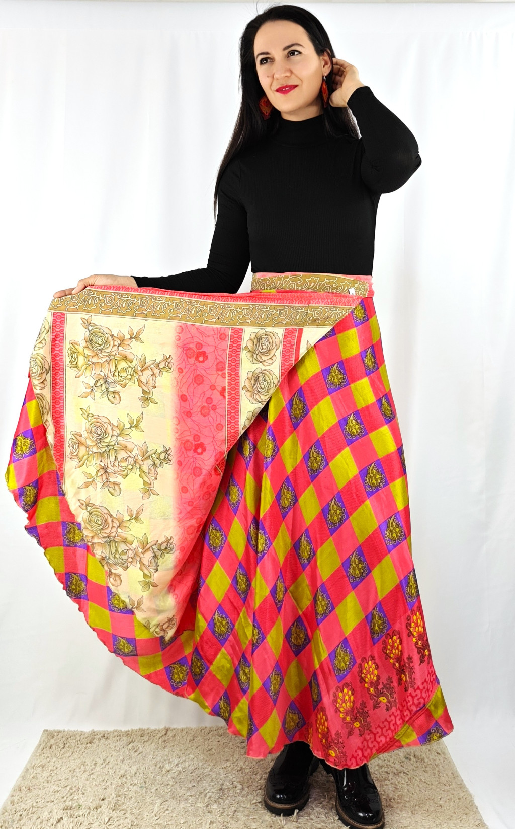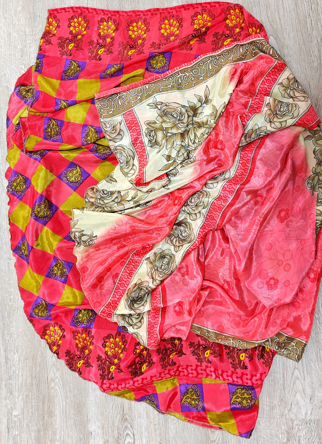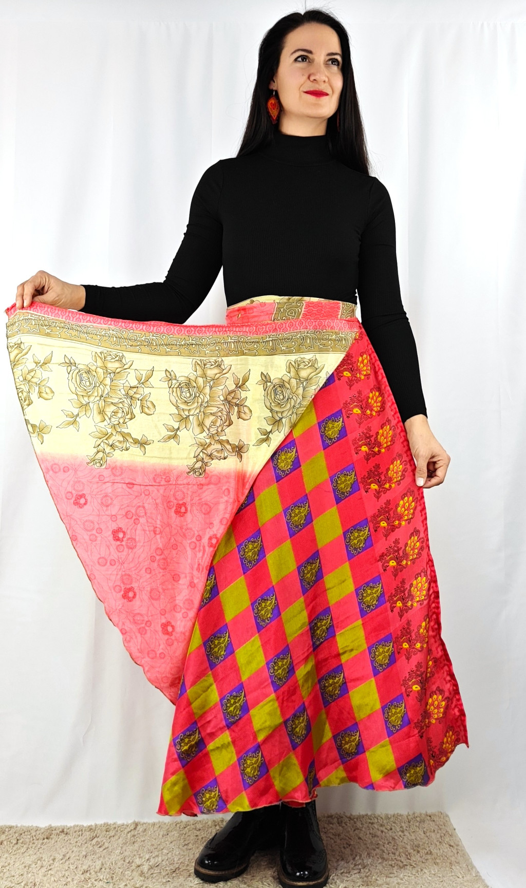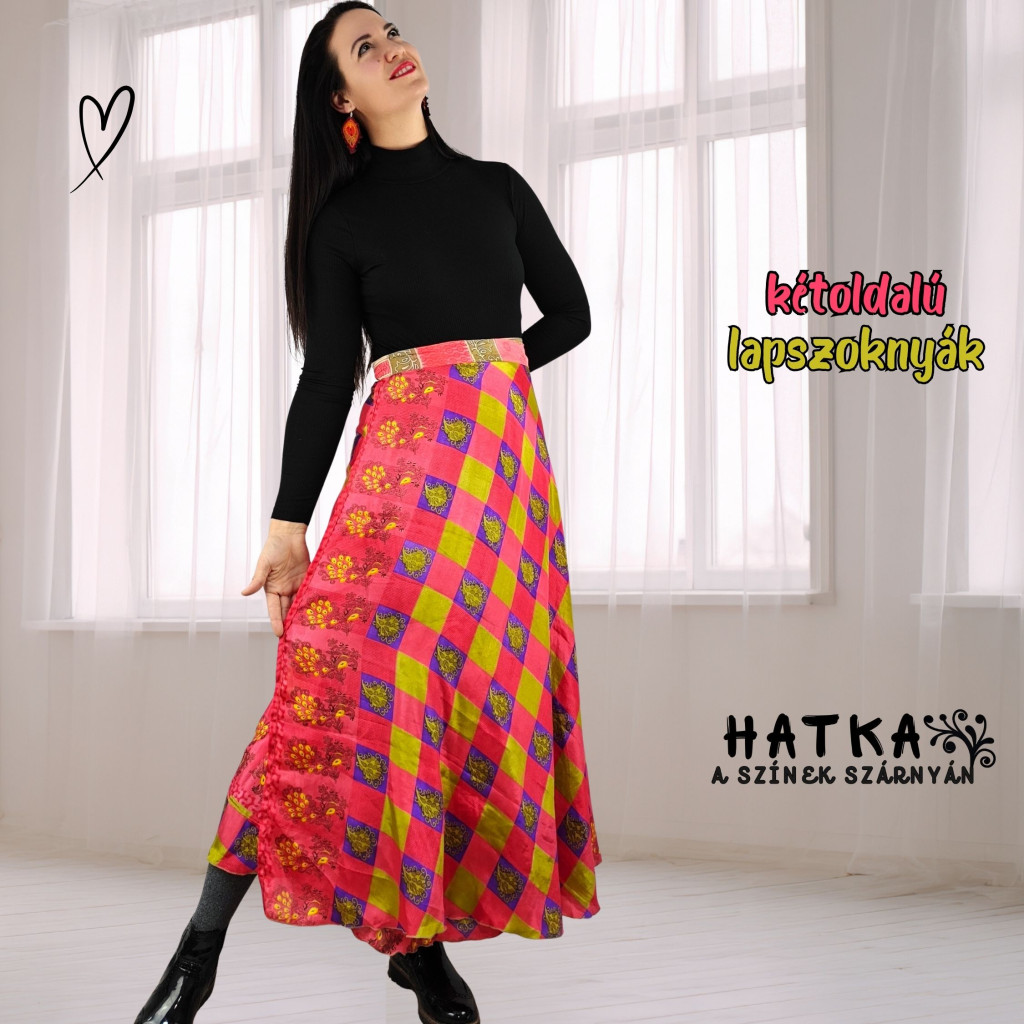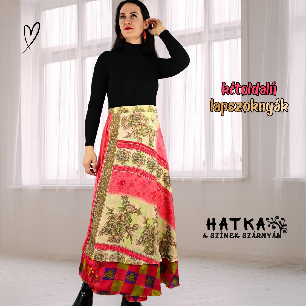 Lapszoknyáink újrahasznosított szárikból készülnek Indiában, egy hosszabb és egy rövidebb anyag derékban összevarrva! Két oldalú, kifordítható, mindkét oldala hordható, sokféleképpen köthető, variálható. Szoknyáinkból nincs két egyforma, mindegyikből csak EGY darab van, ha megtetszik, csapj le rá!