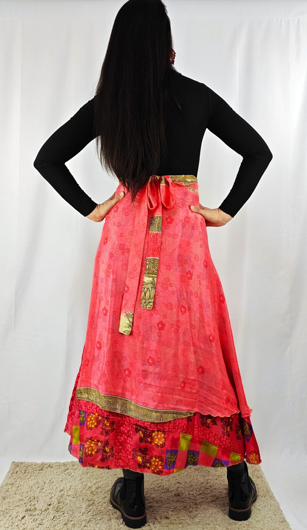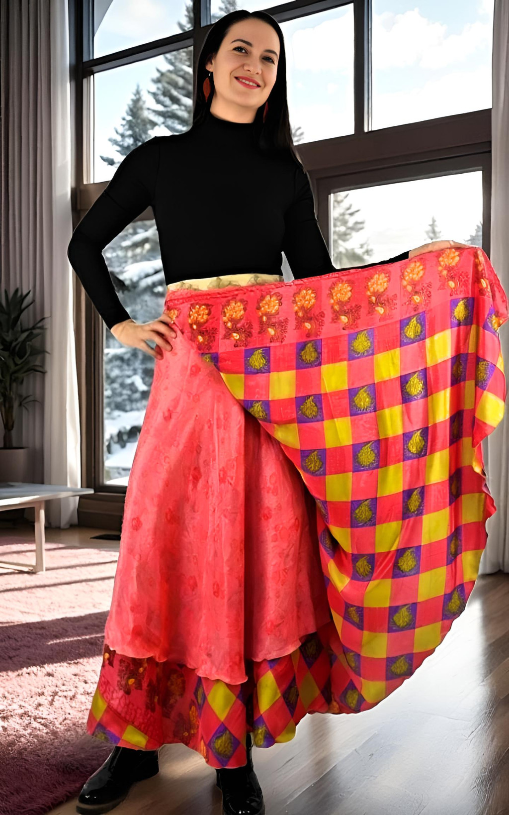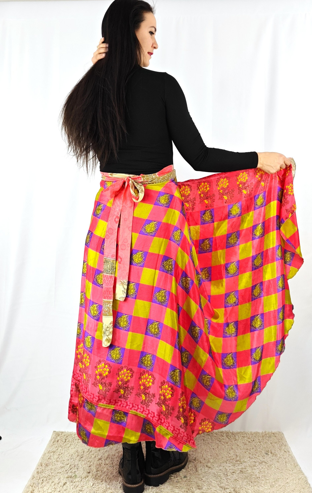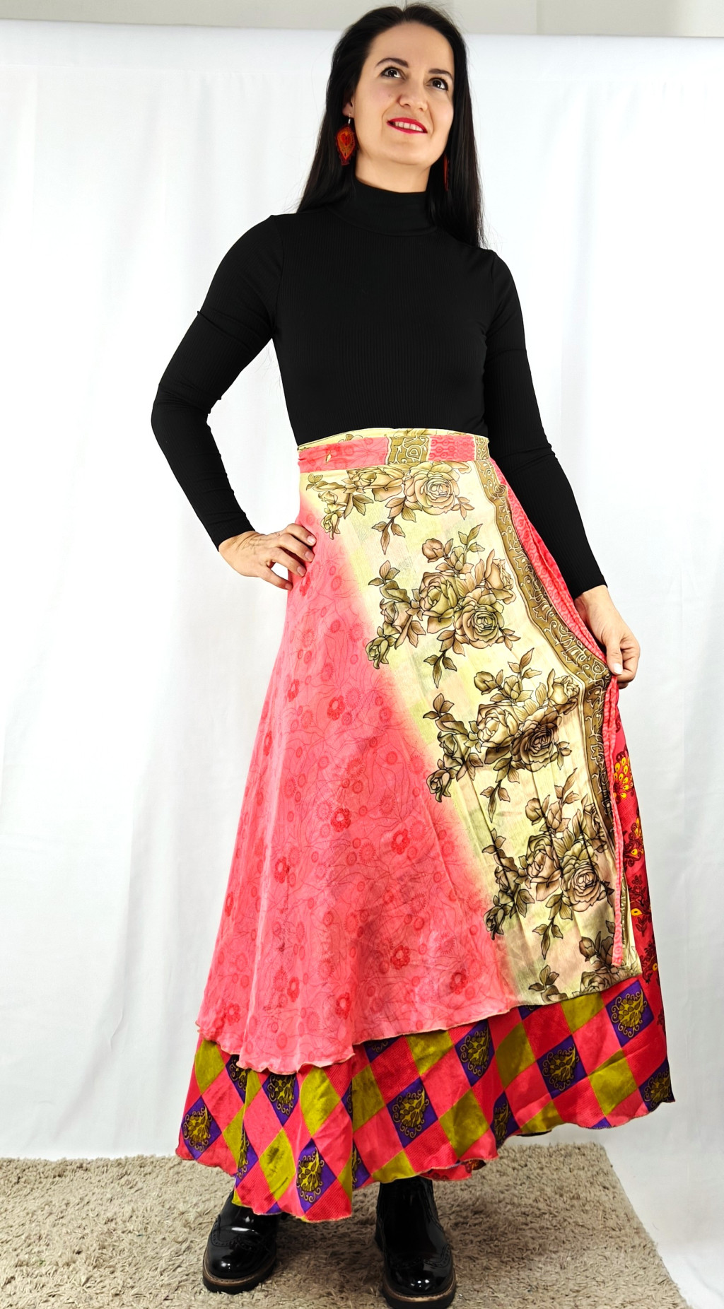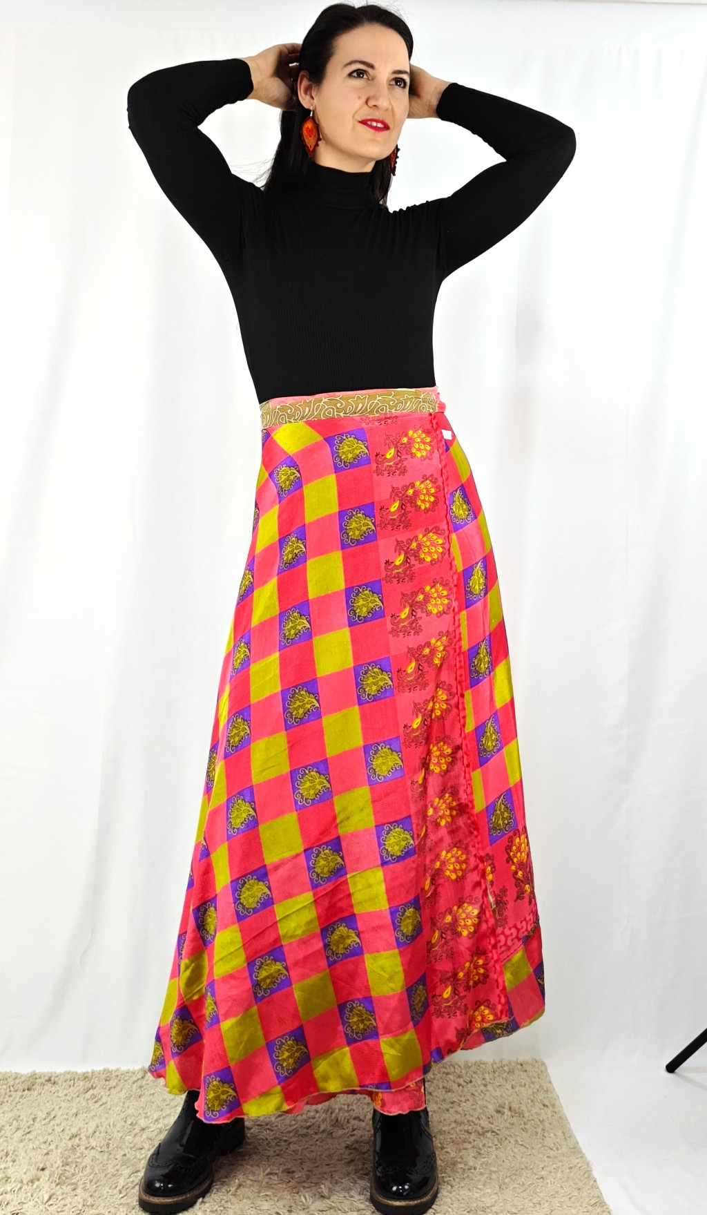 Lapszoknyáink újrahasznosított szárikból készülnek Indiában, egy hosszabb és egy rövidebb anyag derékban összevarrva! Két oldalú, kifordítható, mindkét oldala hordható, sokféleképpen köthető, variálható. Szoknyáinkból nincs két egyforma, mindegyikből csak EGY darab van, ha megtetszik, csapj le rá!