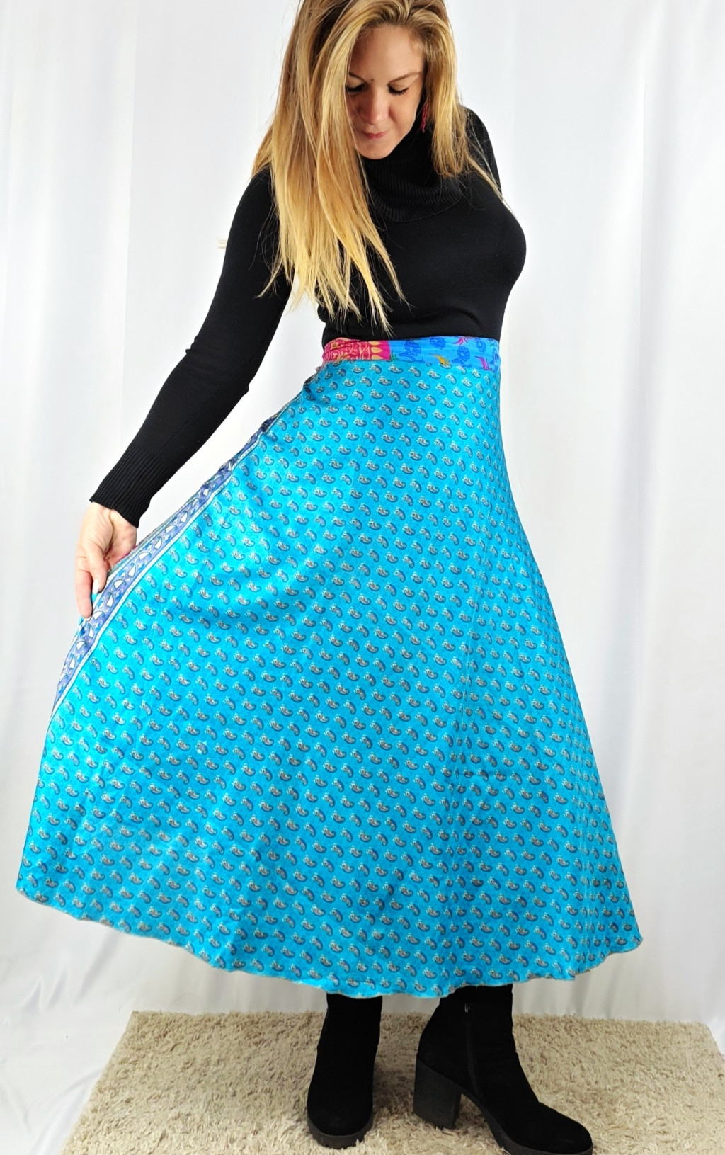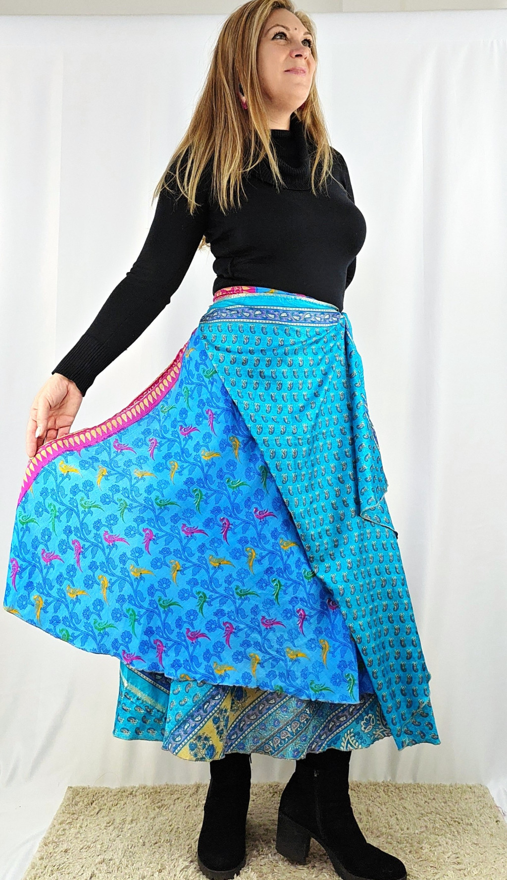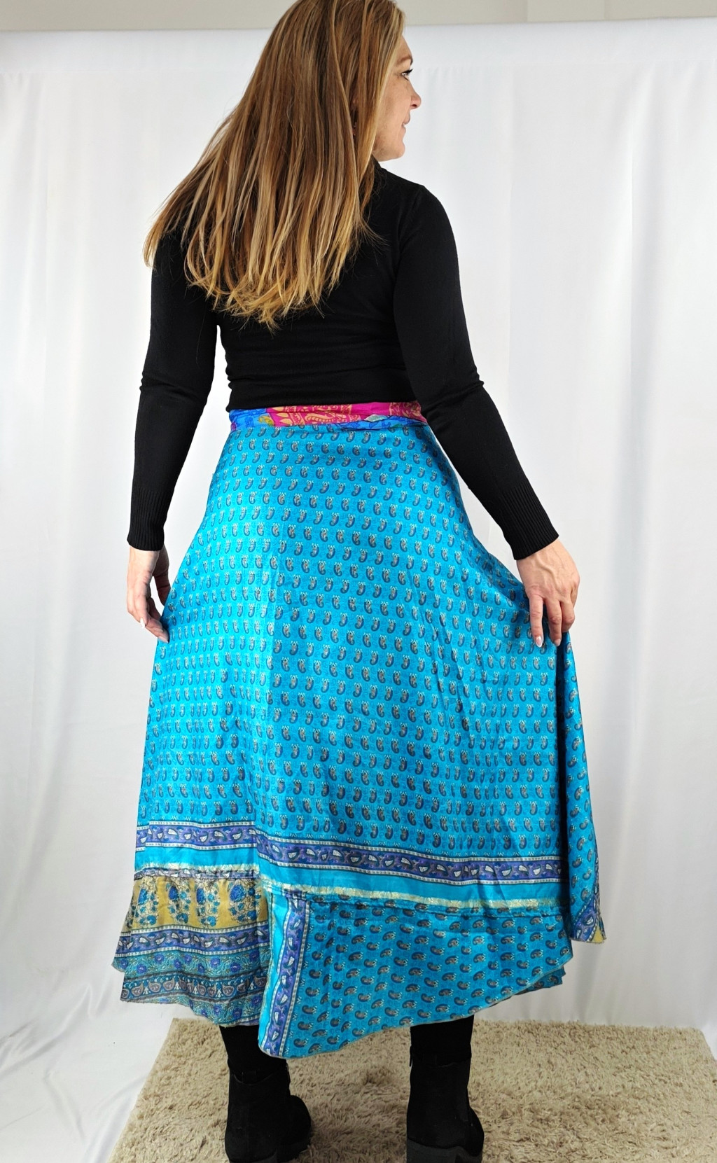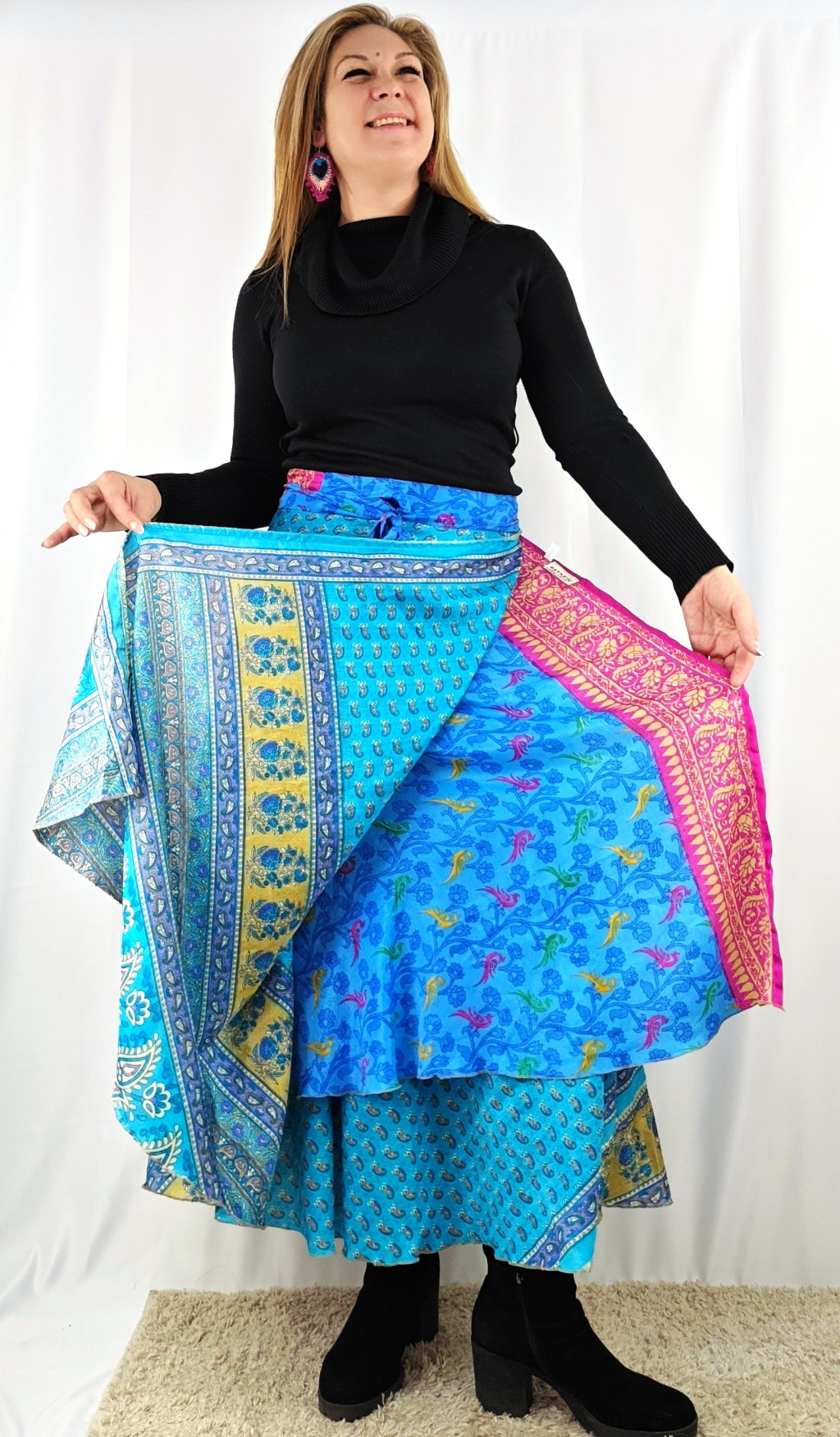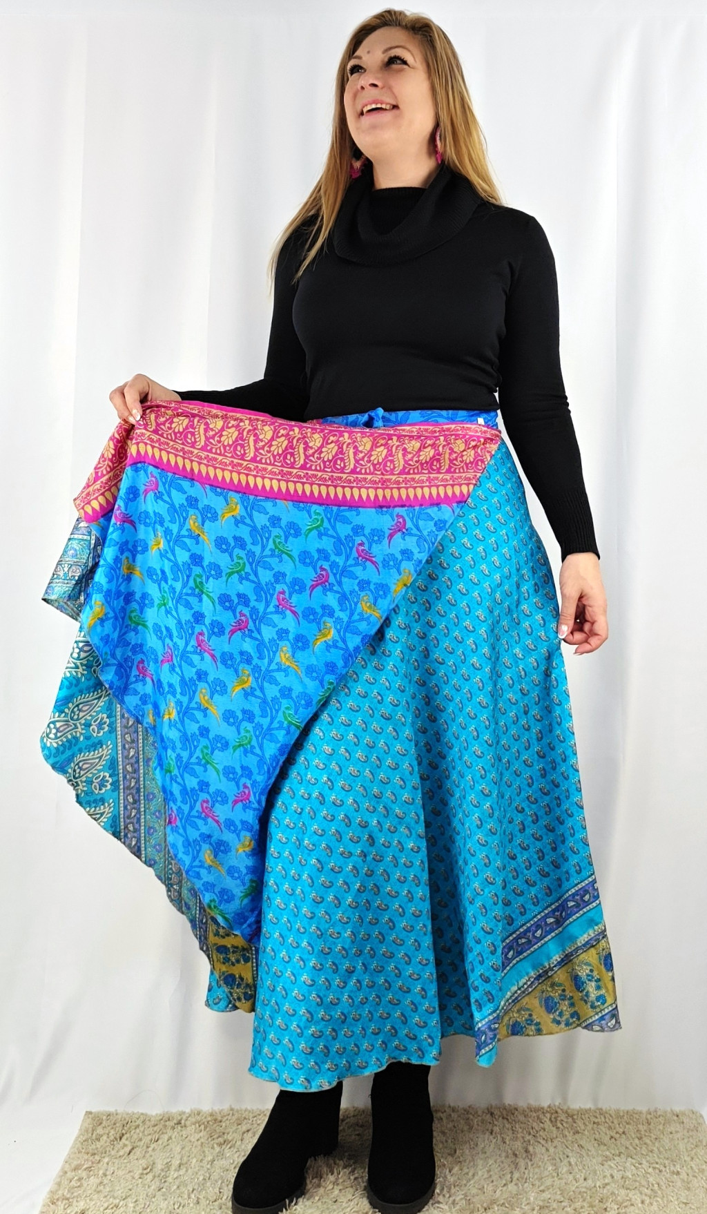 Lapszoknyáink újrahasznosított szárikból készülnek Indiában, egy hosszabb és egy rövidebb anyag derékban összevarrva! Két oldalú, kifordítható, mindkét oldala hordható, sokféleképpen köthető, variálható. Szoknyáinkból nincs két egyforma, mindegyikből csak EGY darab van, ha megtetszik, csapj le rá!