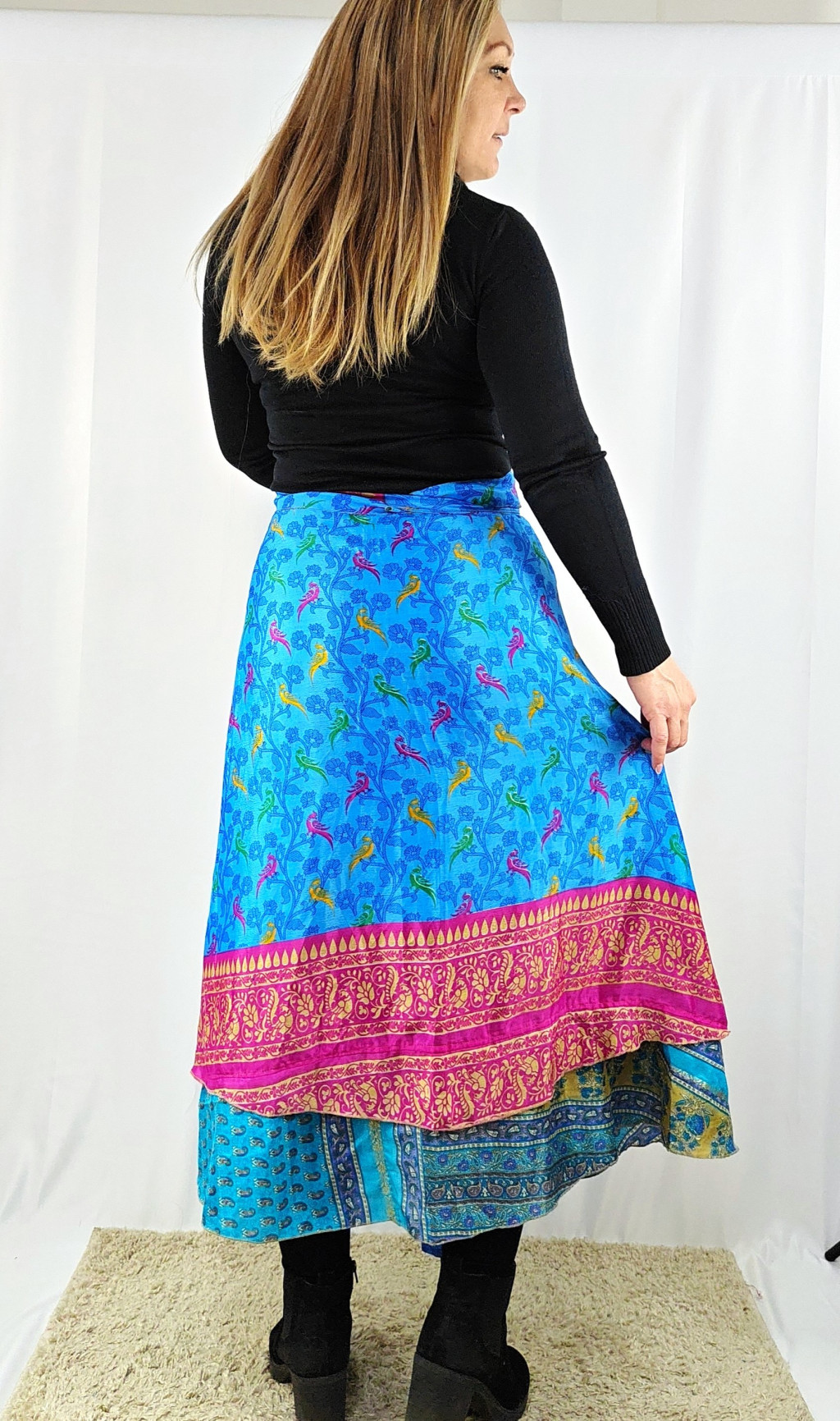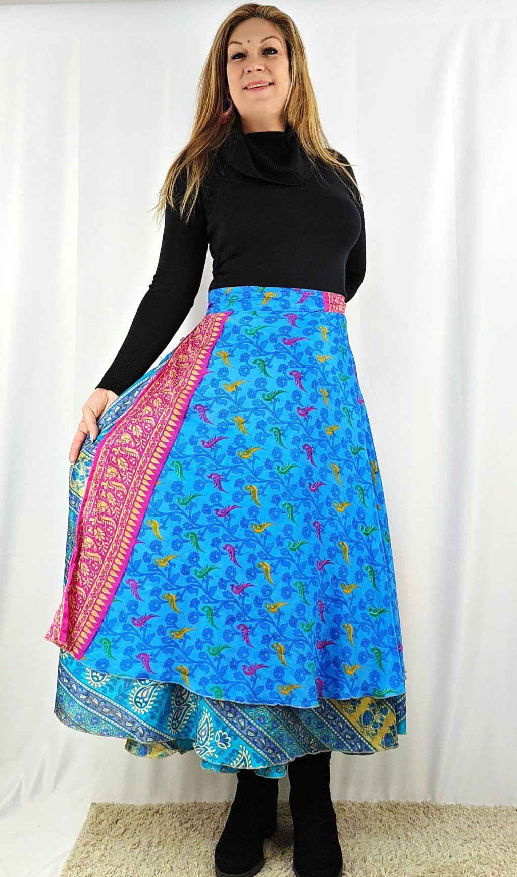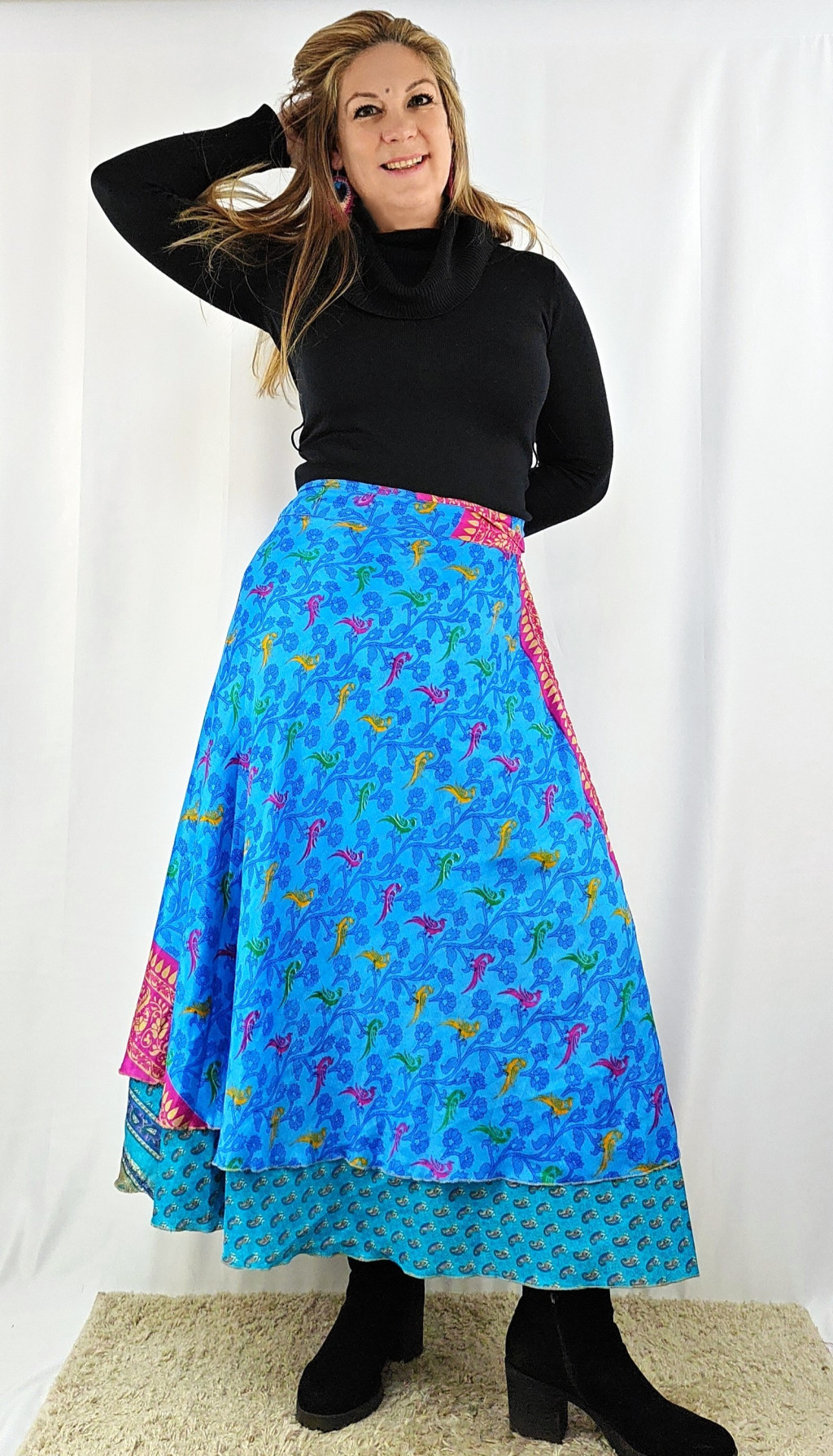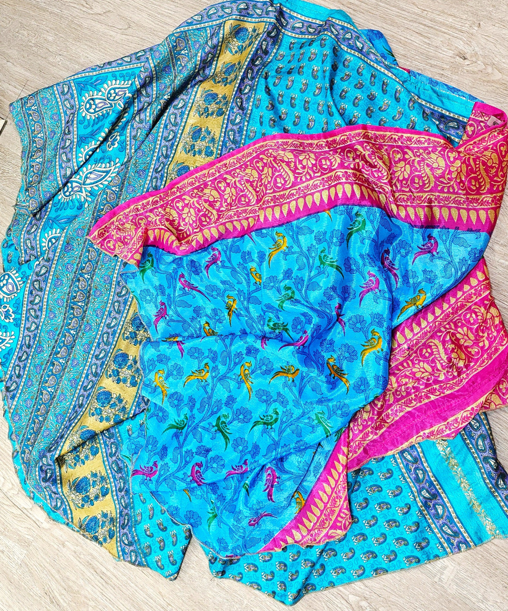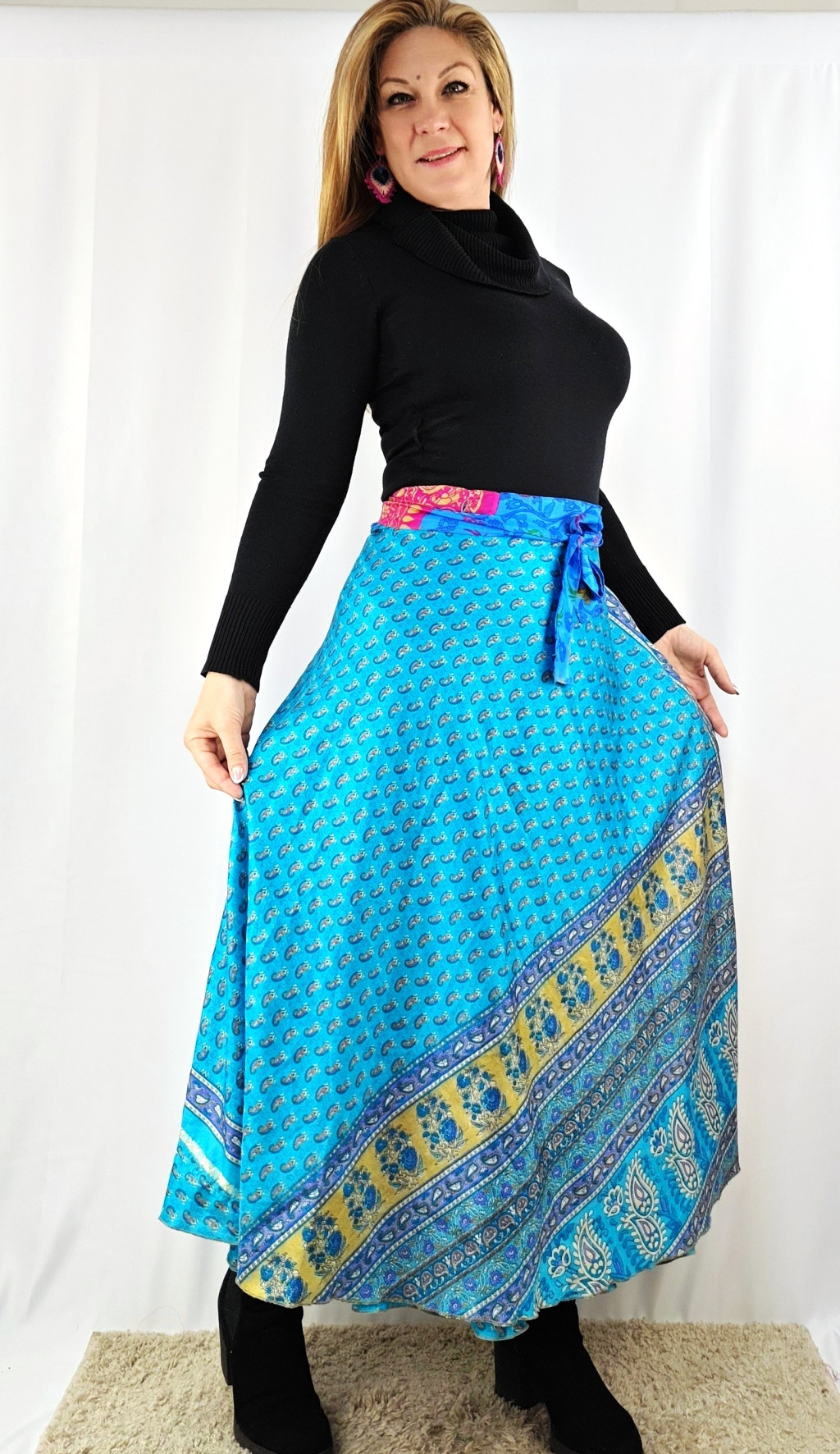 Lapszoknyáink újrahasznosított szárikból készülnek Indiában, egy hosszabb és egy rövidebb anyag derékban összevarrva! Két oldalú, kifordítható, mindkét oldala hordható, sokféleképpen köthető, variálható. Szoknyáinkból nincs két egyforma, mindegyikből csak EGY darab van, ha megtetszik, csapj le rá!