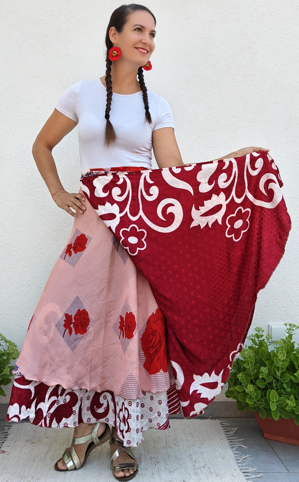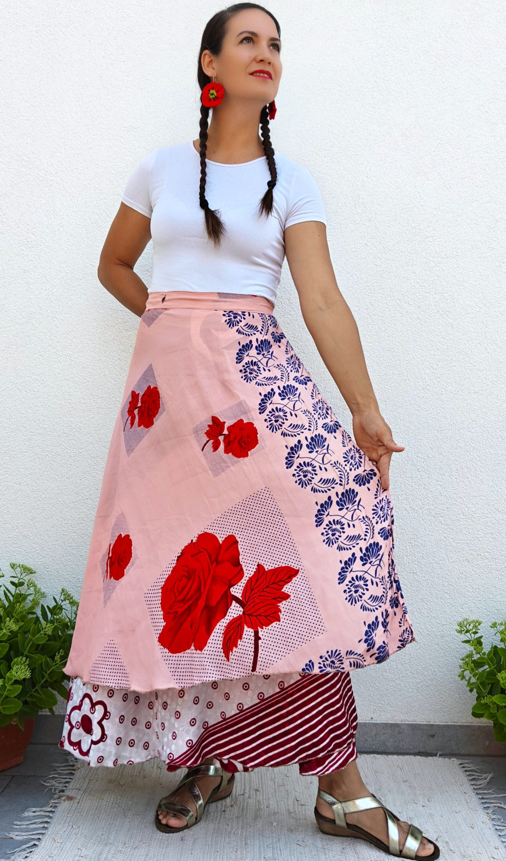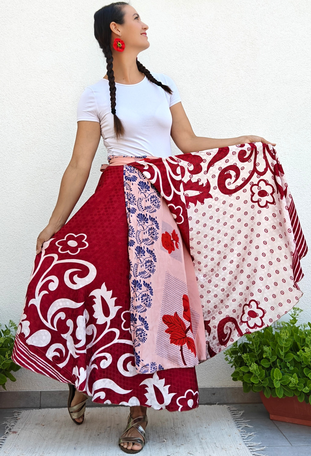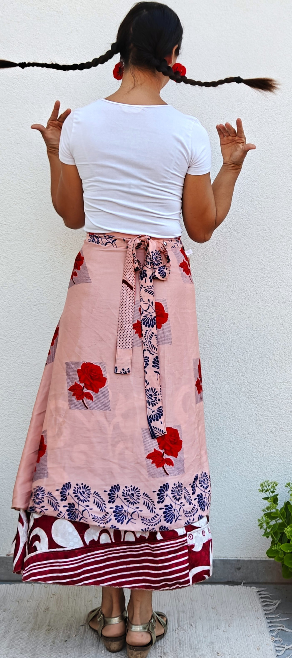 Lapszoknyáink újrahasznosított szárikból készülnek Indiában, egy hosszabb és egy rövidebb anyag derékban összevarrva! Kifordítható, mindkét oldala hordható, sokféleképpen köthető, variálható. Szoknyáinkból nincs két egyforma, mindegyikből csak EGY darab van, ha megtetszik, csapj le rá!